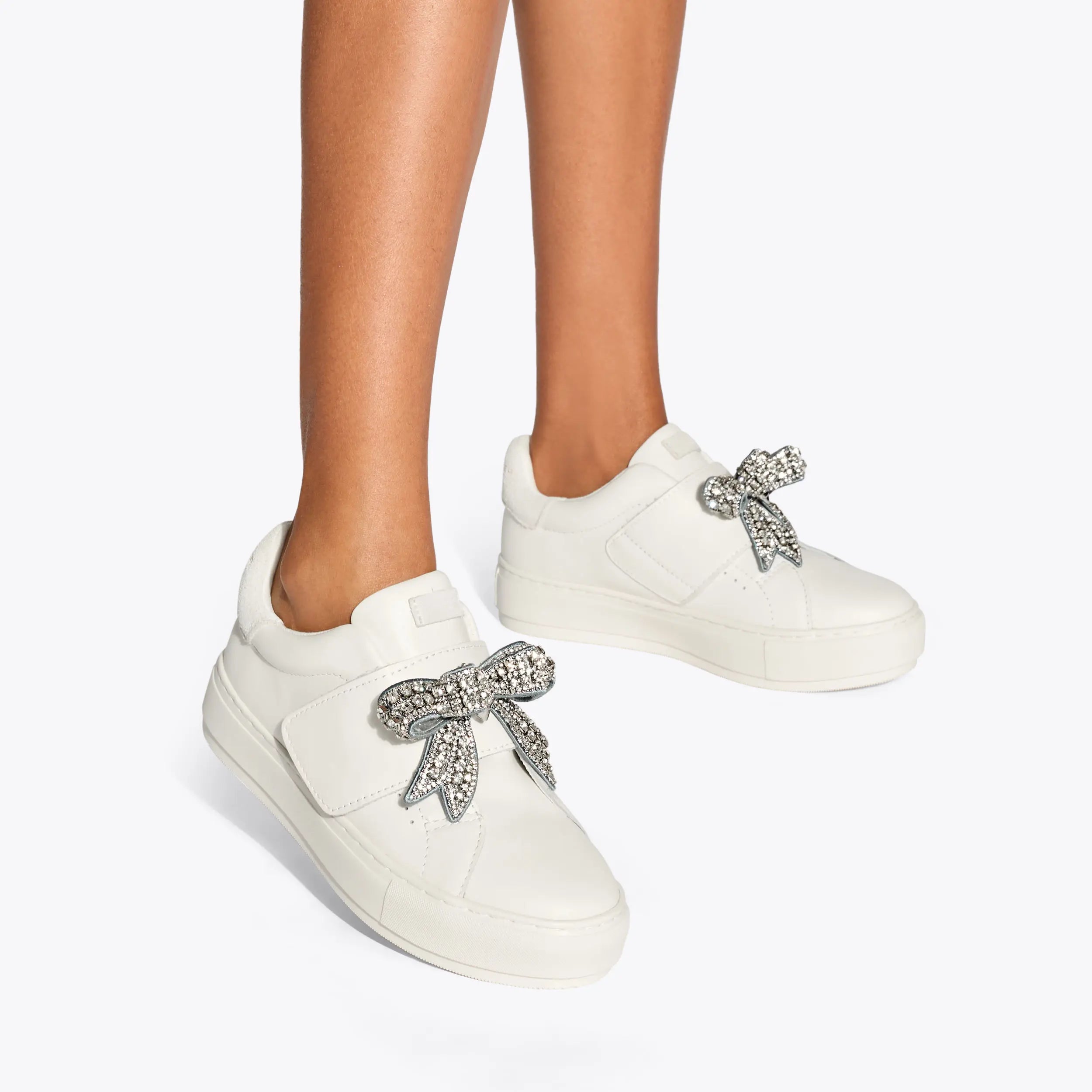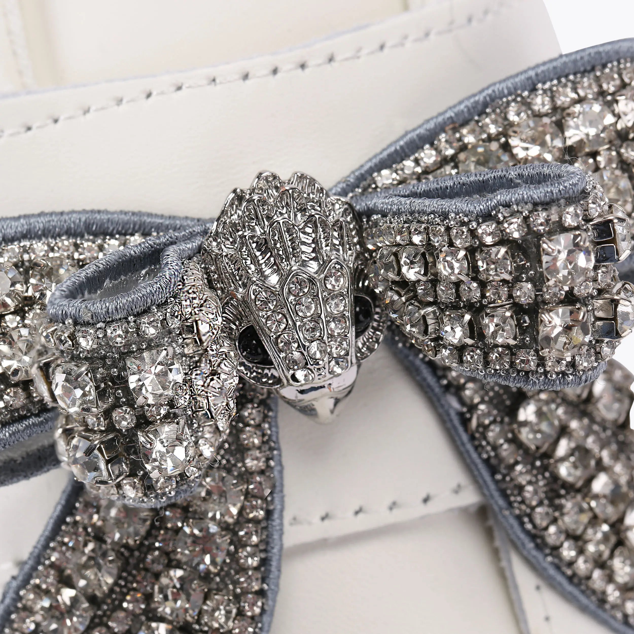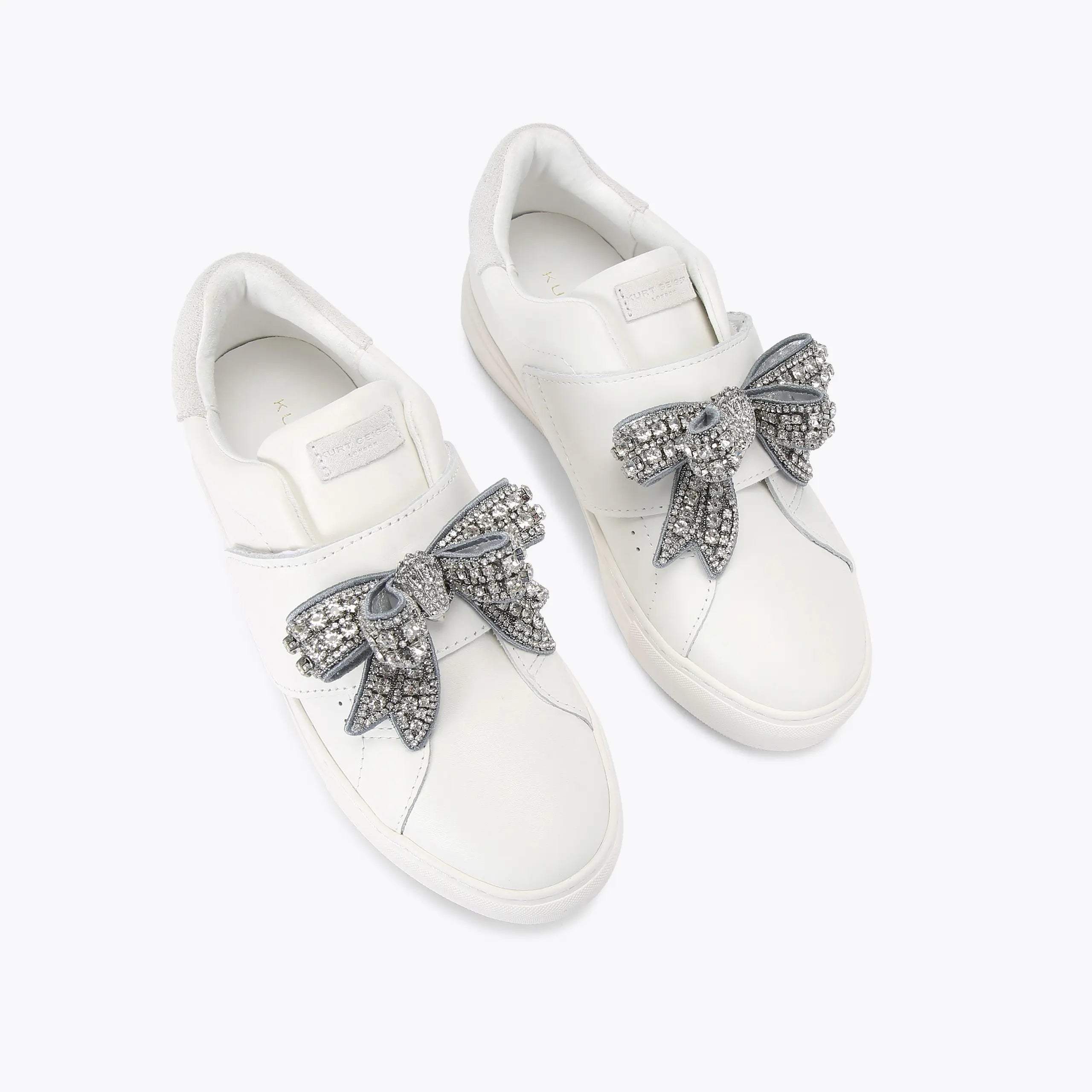 This Laney Bow sneaker features a smooth white upper. The velcro strap is adorned with crystal bow and antiqued silver eagle head.