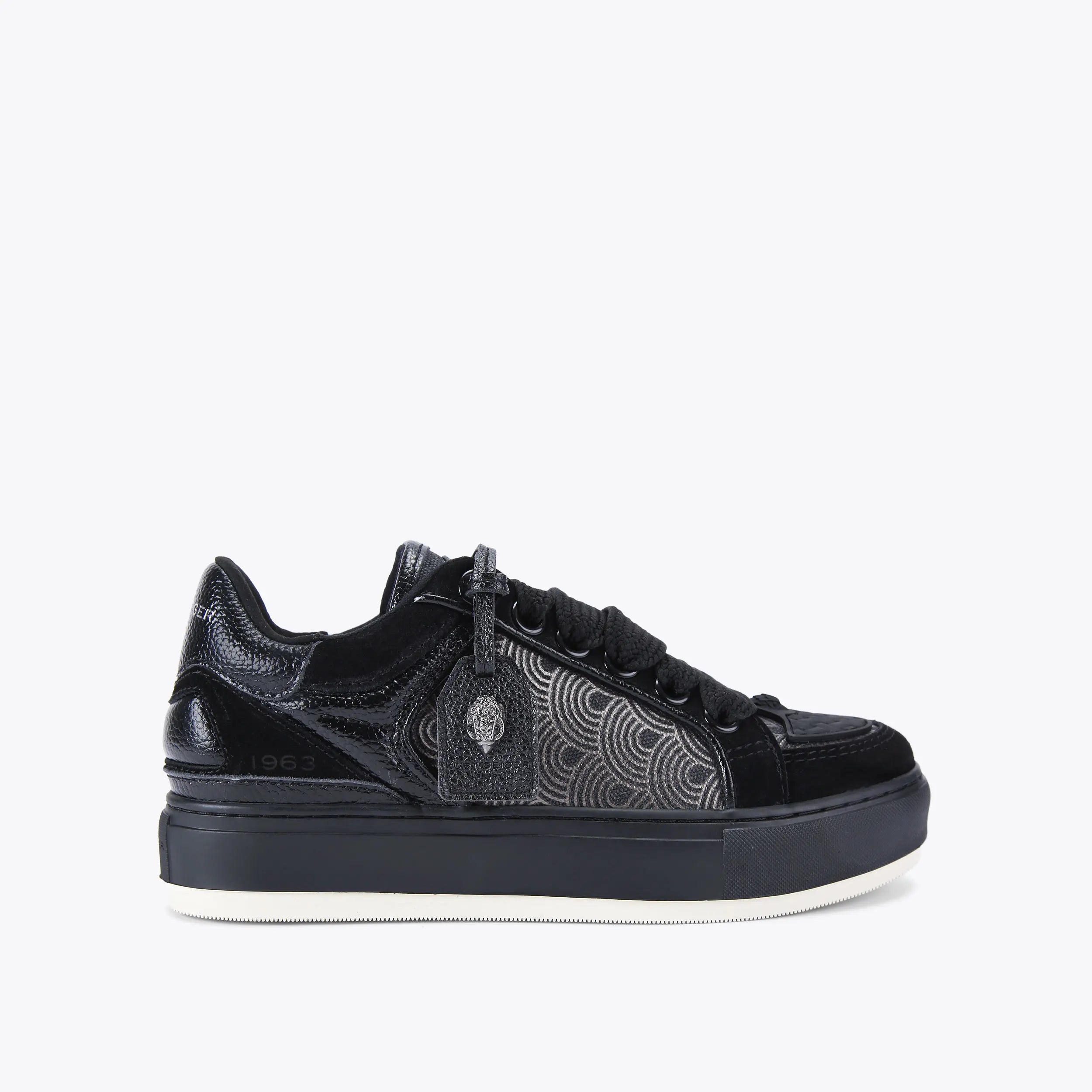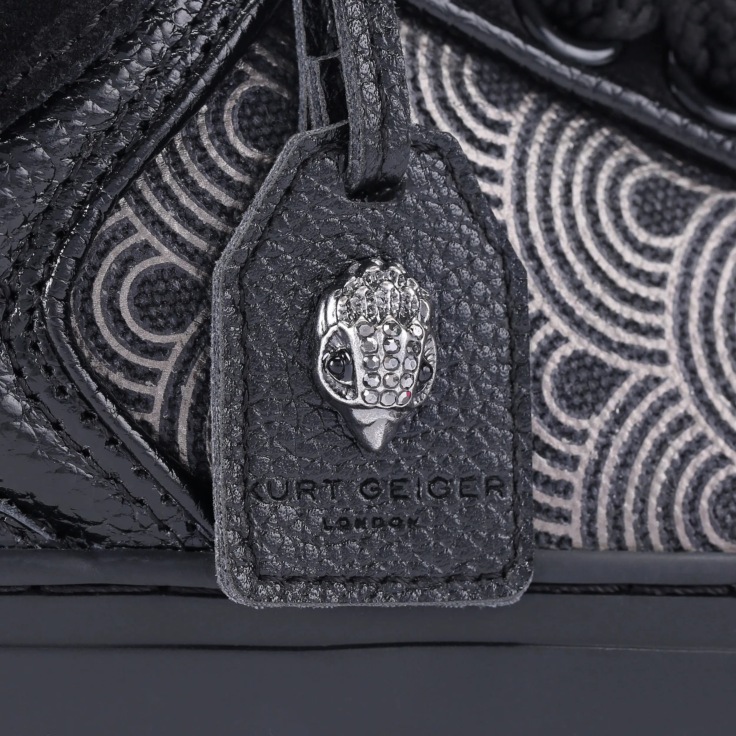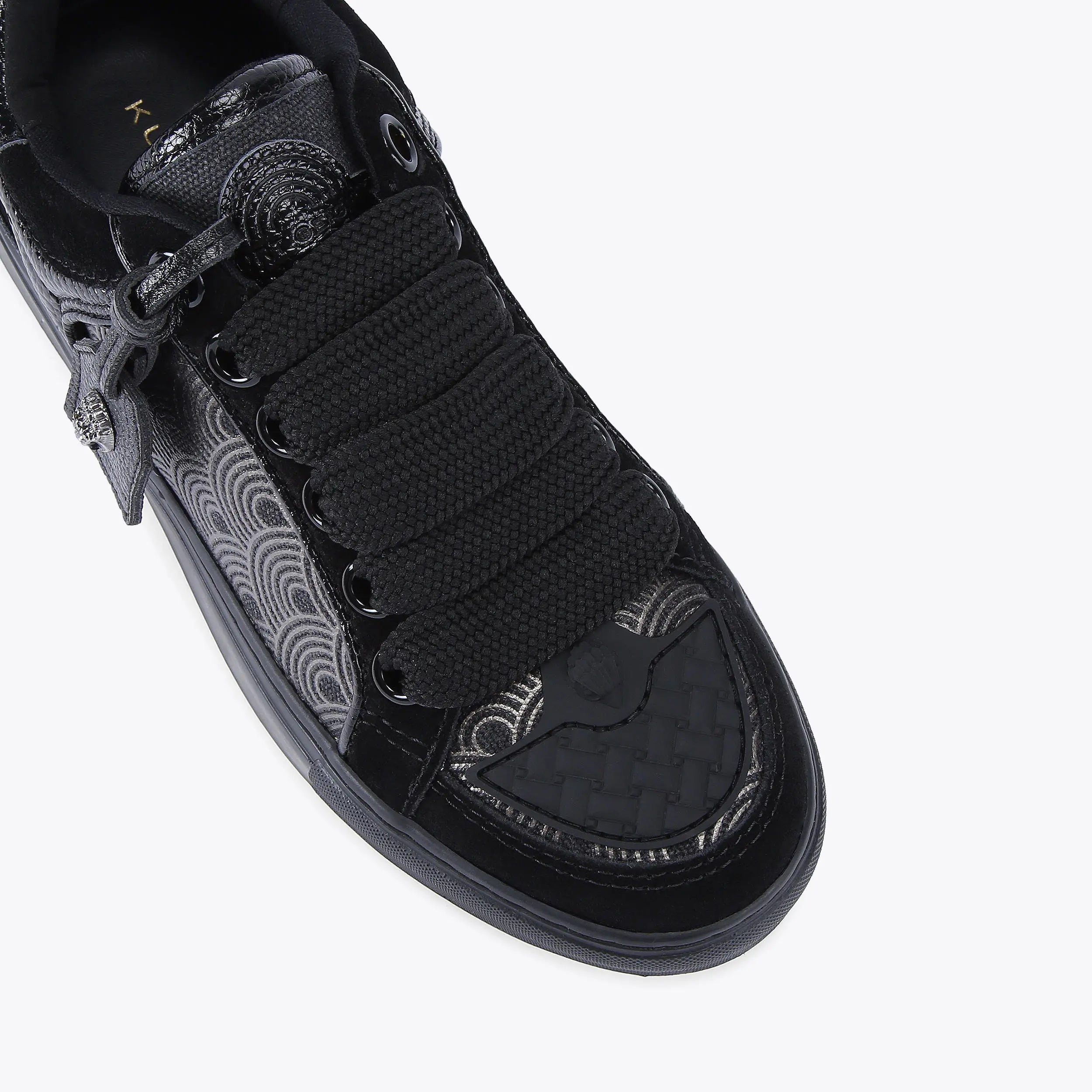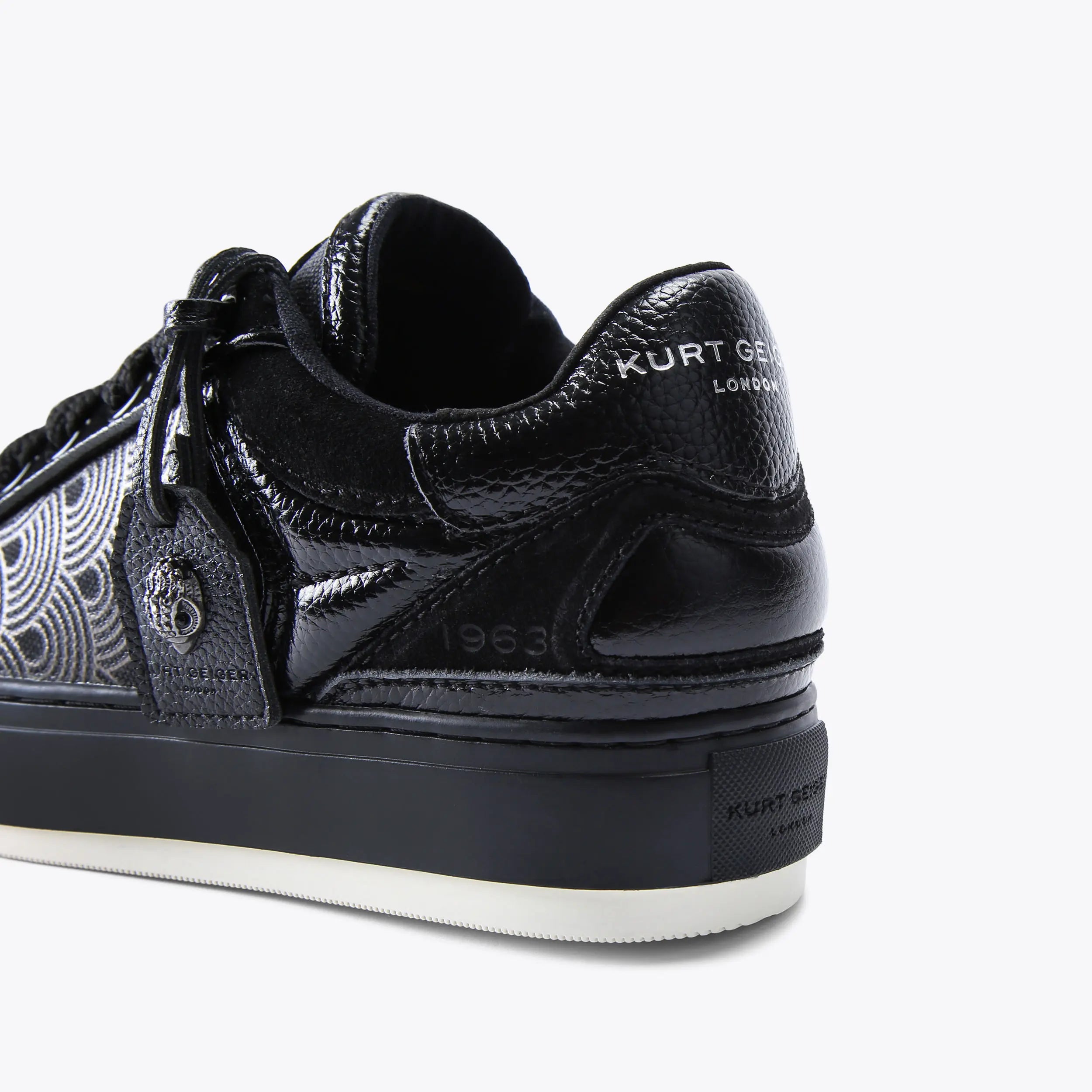 The Southbank Tag sneaker features a black upper with silver rainbow print across the side and toe. There is an antiqued silver eagle head on the small black tag. The laces are woven and extra wide with silver eyelets.