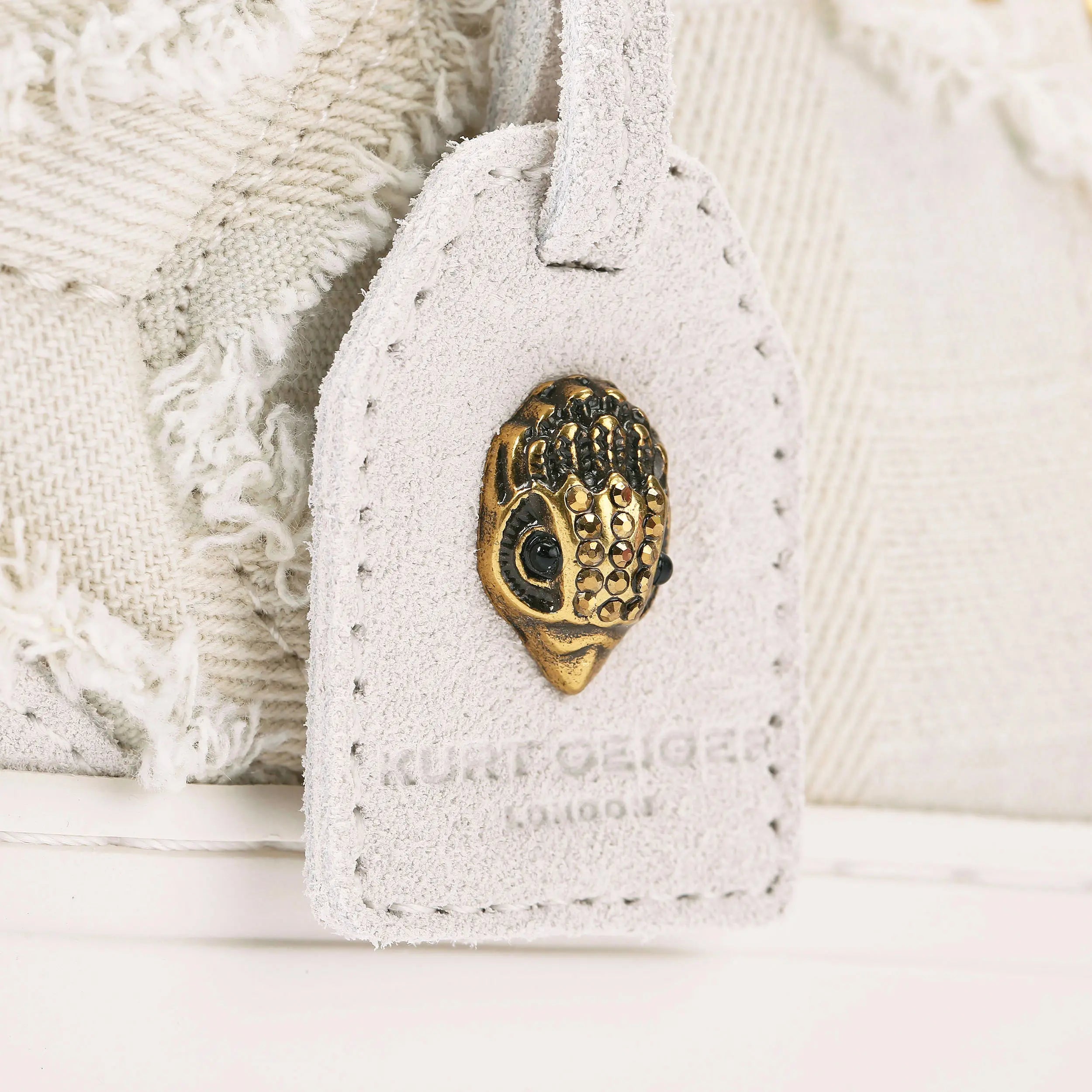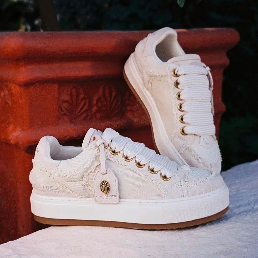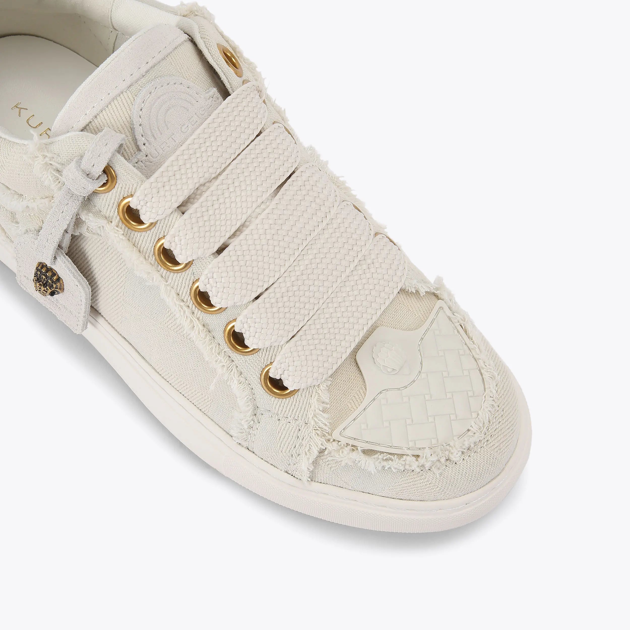 The Southbank Tag sneaker features a white denim upper with frayed edge detail. There is a subtle quilted pattern across the shoe. A removable suede tag with antiqued brass eagle head adds further detail to each shoe.