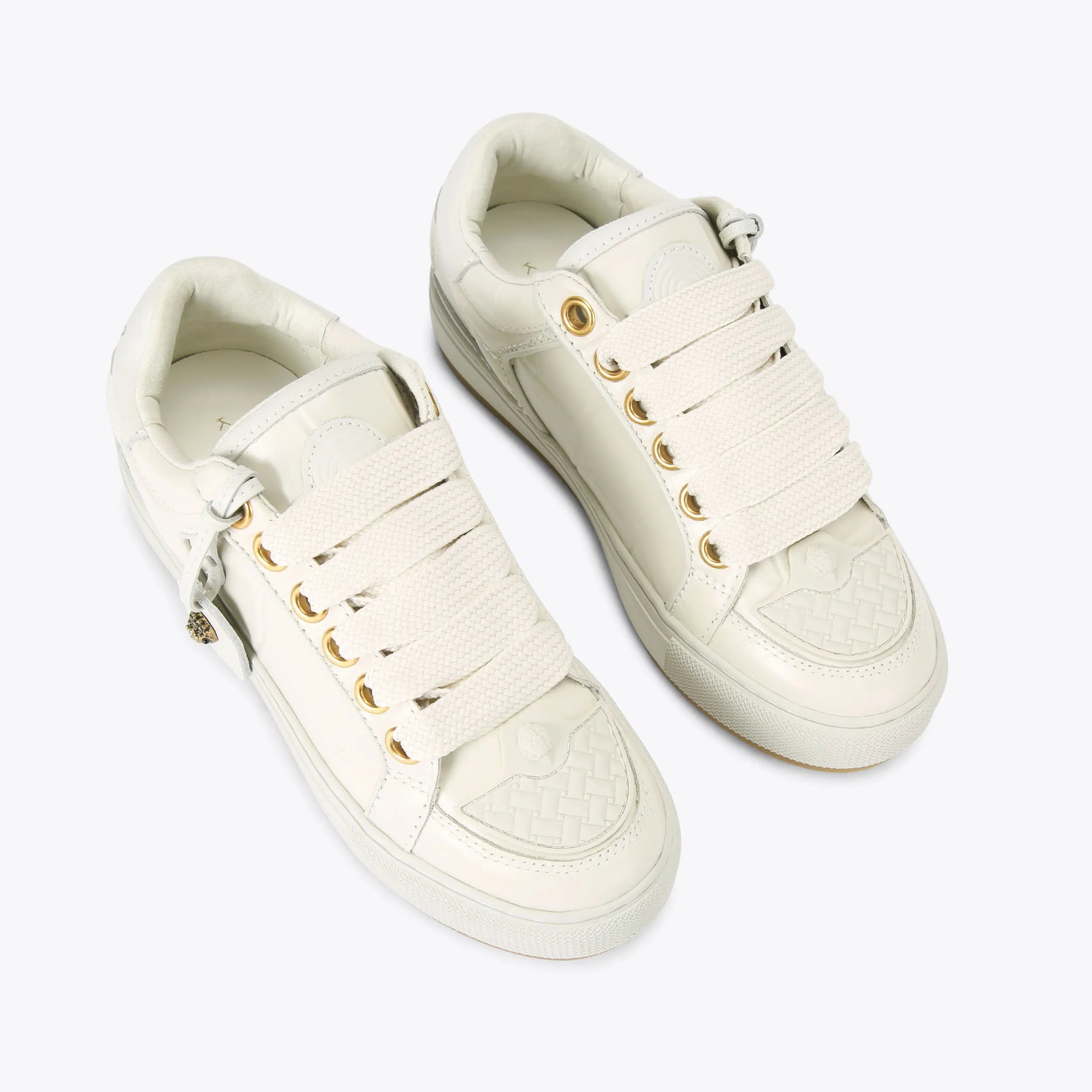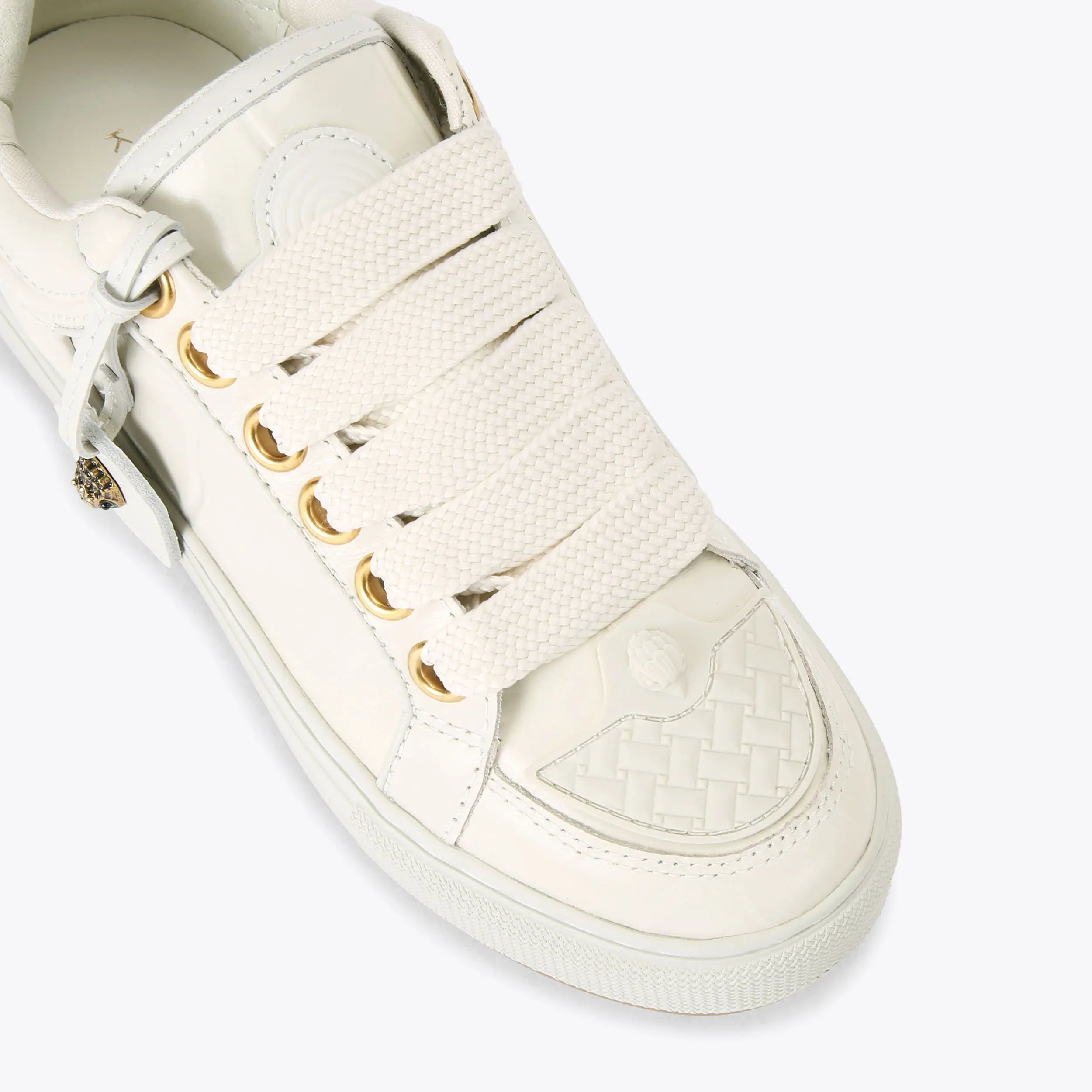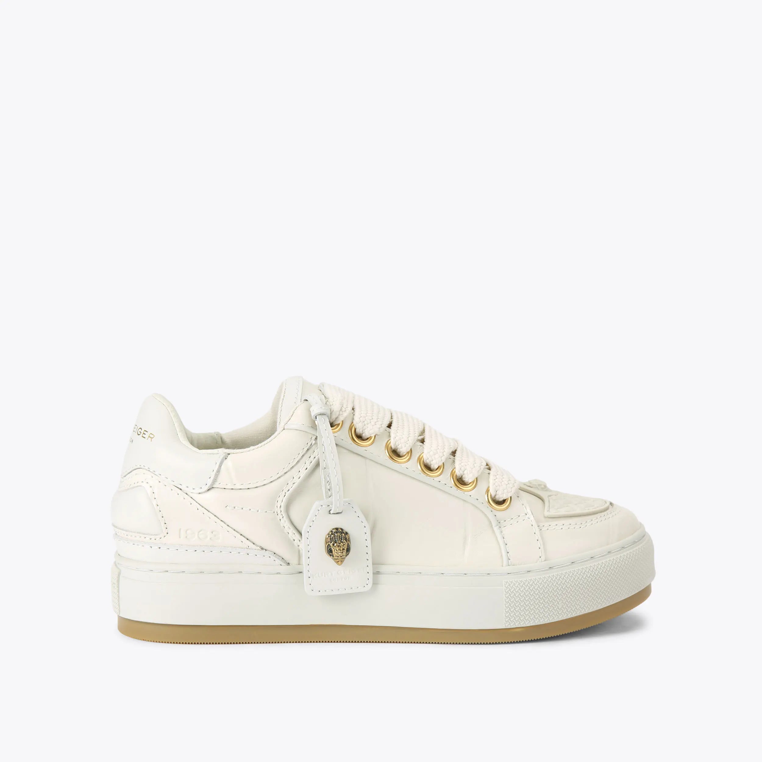 The Southbank Tag sneaker features a statement enlarged croc print upper. There is brushed gold hardware and luggage style tag with antiqued brass eagle head on the laces.
