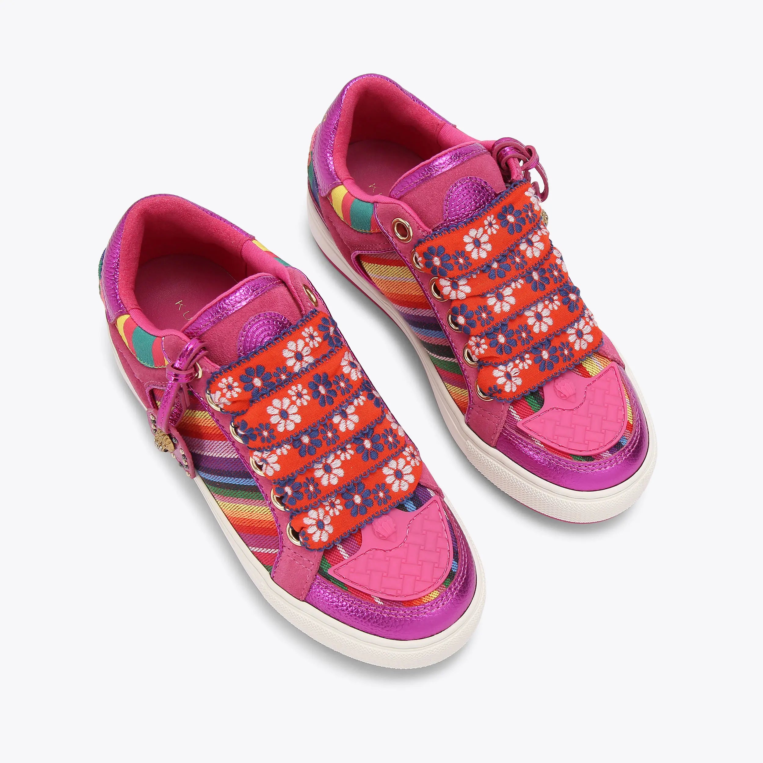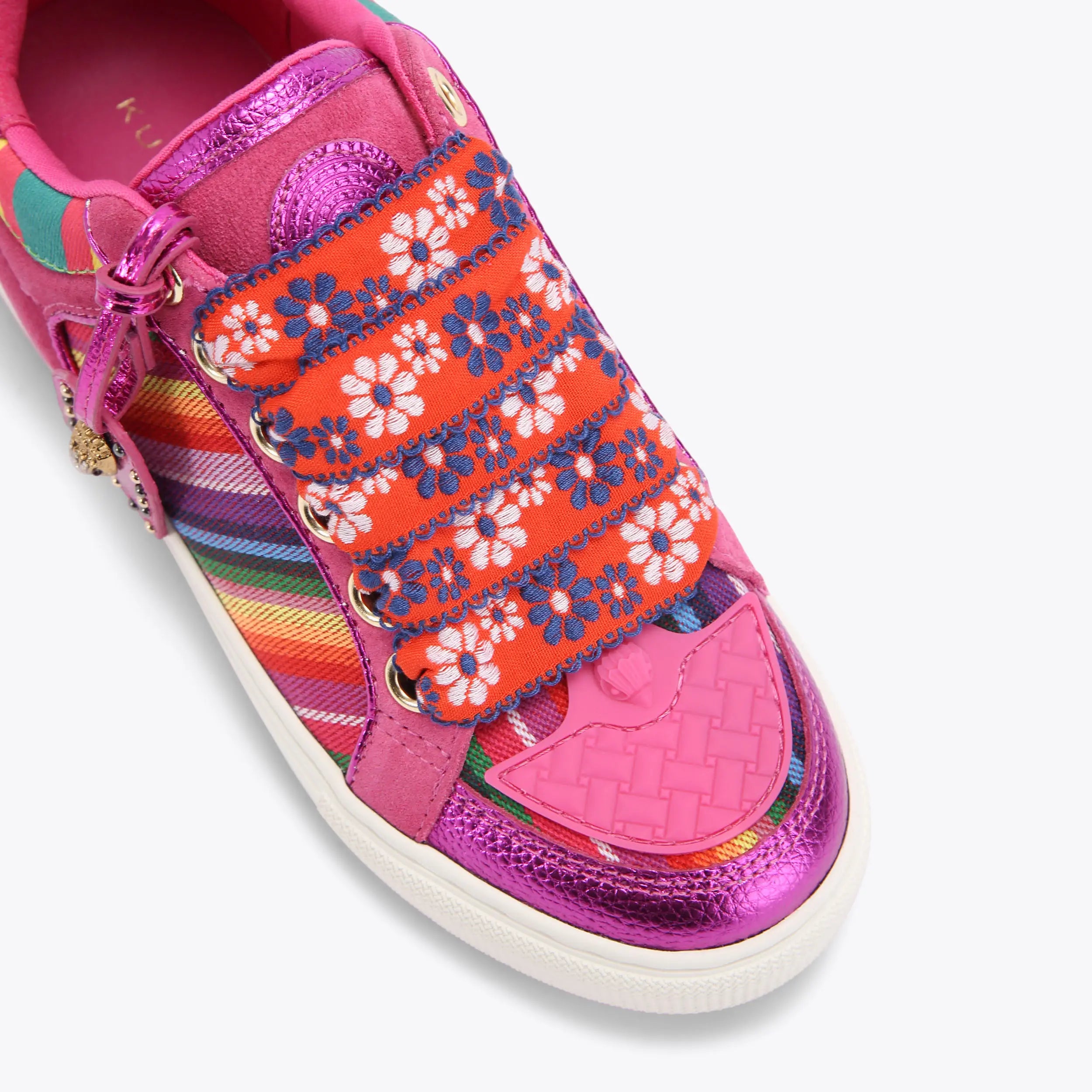 This pair of Southbank Tag sneakers are crafted from a pink leather with multi-colour striped panels on either side. There are orange and blue floral wide laces at the front and a metallic pink luggage style tag on them.