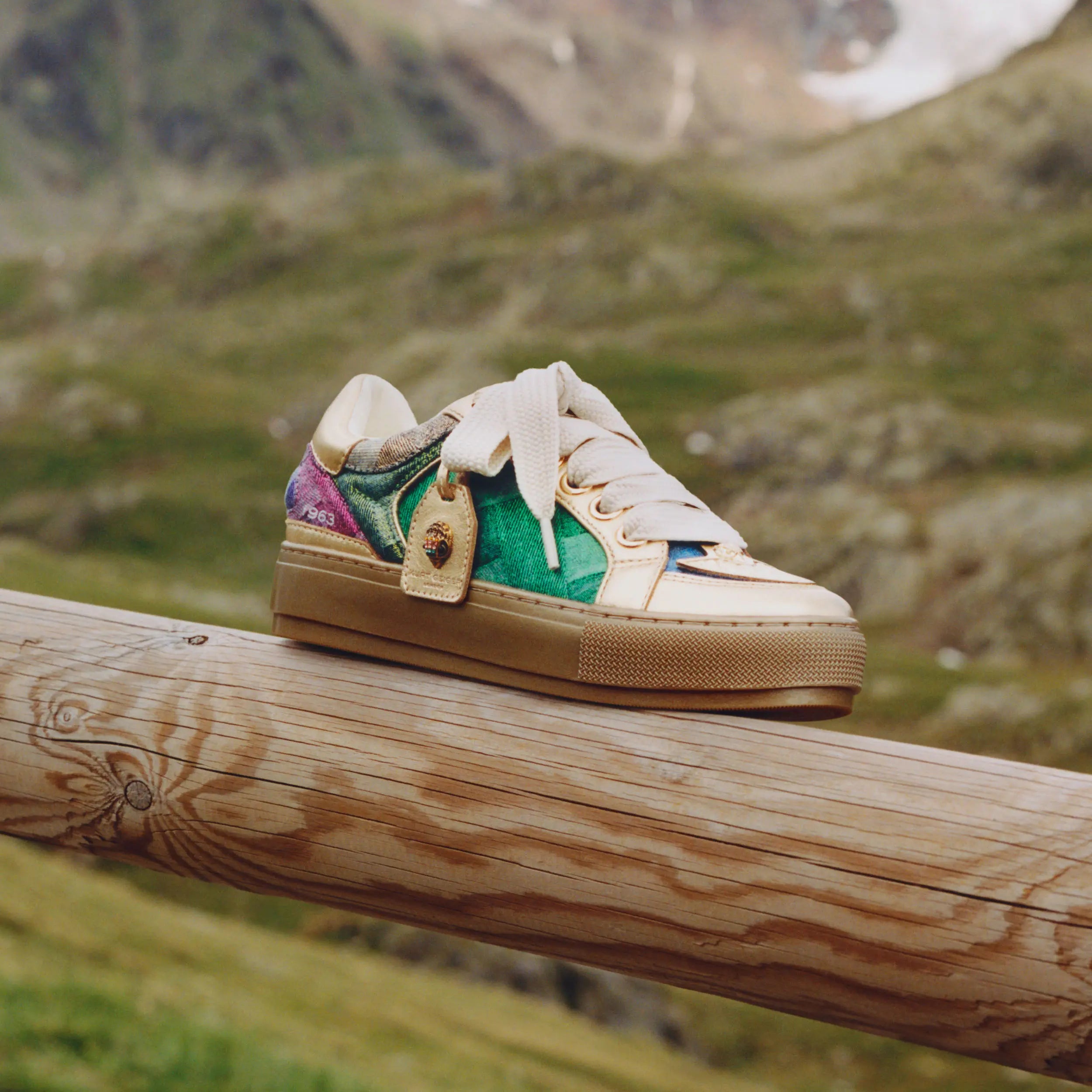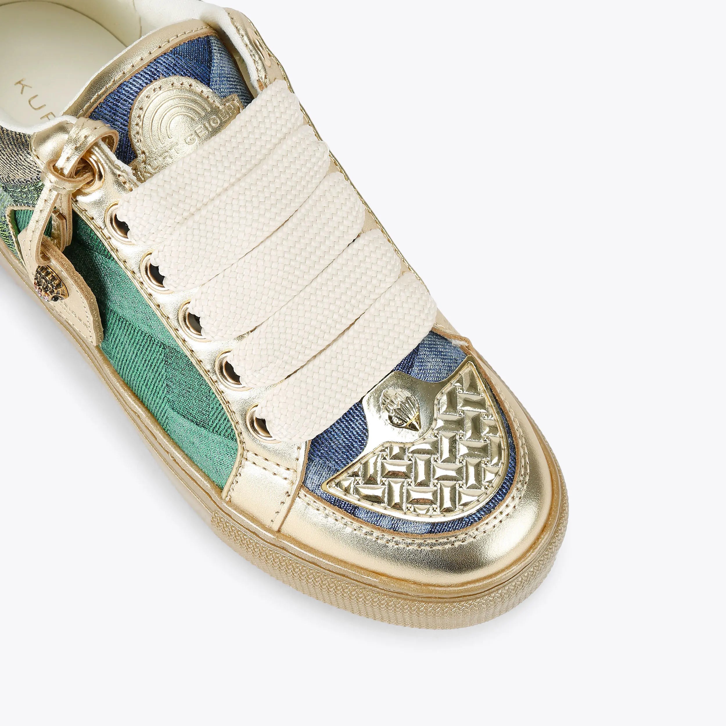 The Southbank Tag sneaker features a multi-colour denim style upper with metallic gold trims. There is a metallic gold leather tab on the laces with an antiqued brass eagle head with rainbow crystals on top.