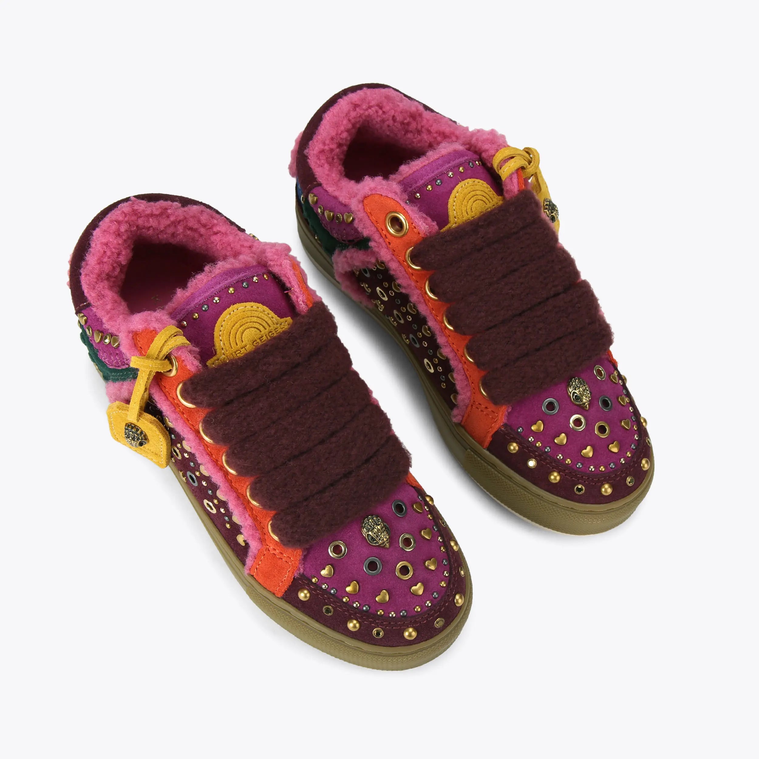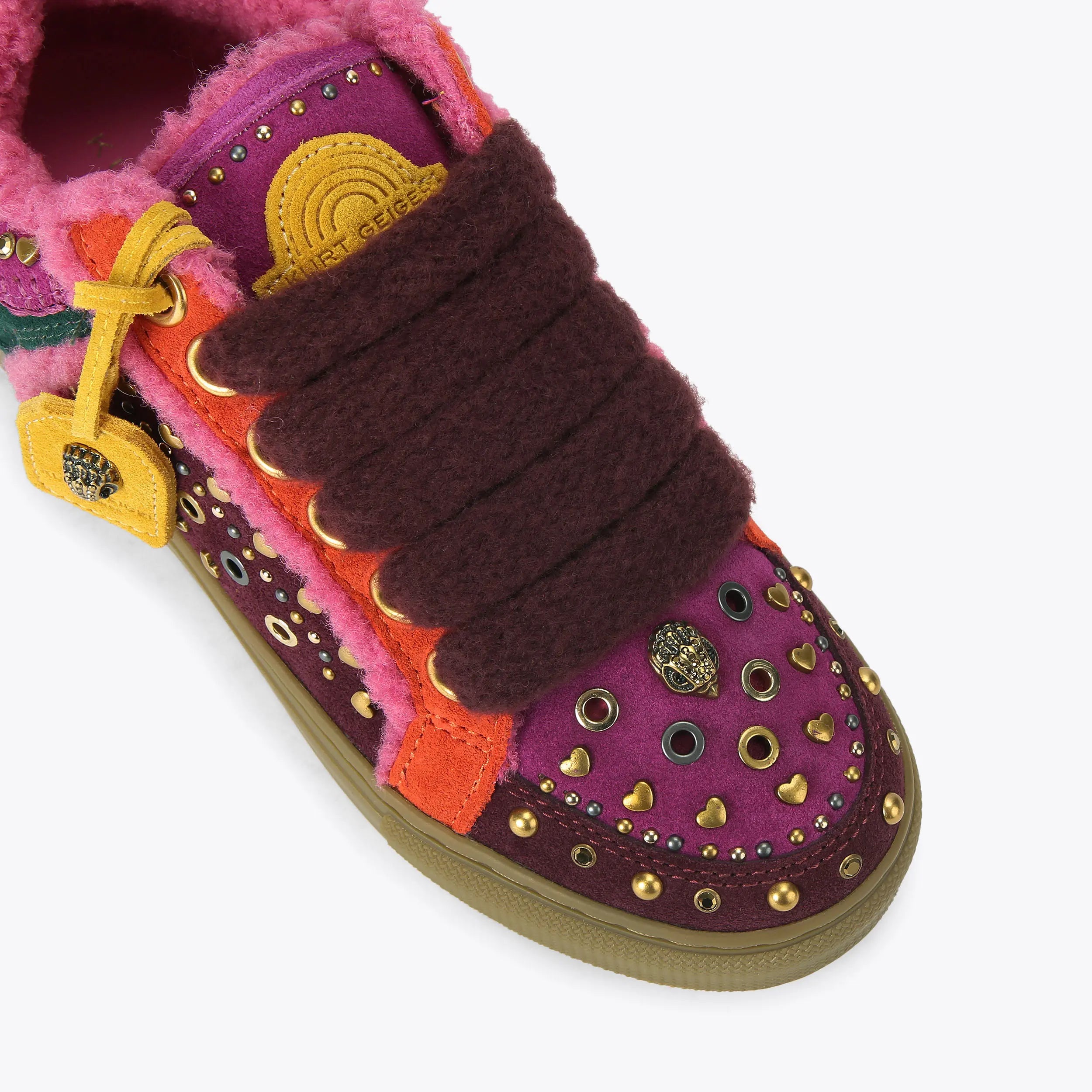 The Southbank Tag sneaker features a suede upper in pink tones. There is an antiqued brass eagle head on the yellow suede tag. The laces are woven in a furry style.