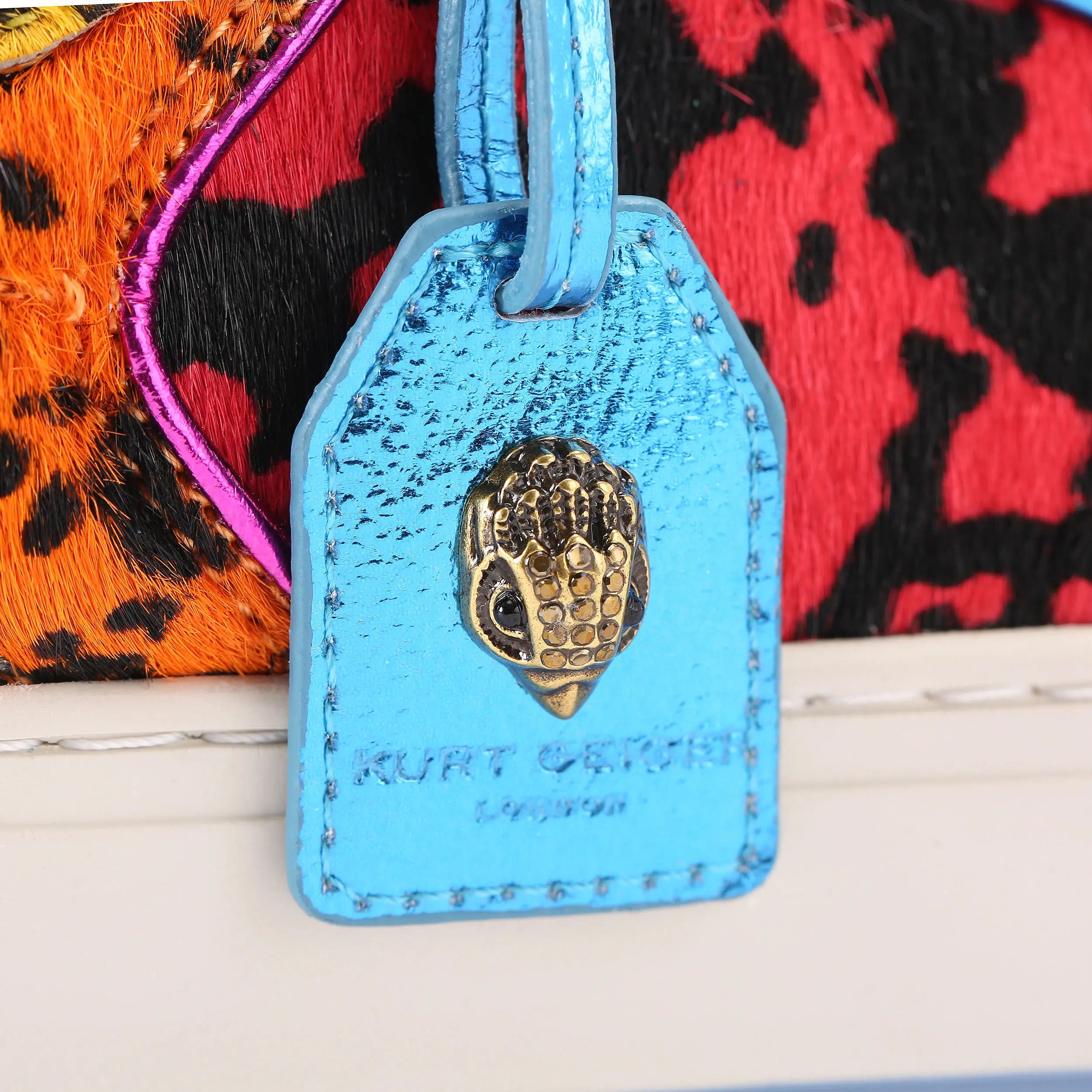 This pair of Southbank Tag sneakers are crafted from multiple calfhair leather panels with different colors and prints. There are blue wide laces at the front and a metallic blue luggage style tag on them.