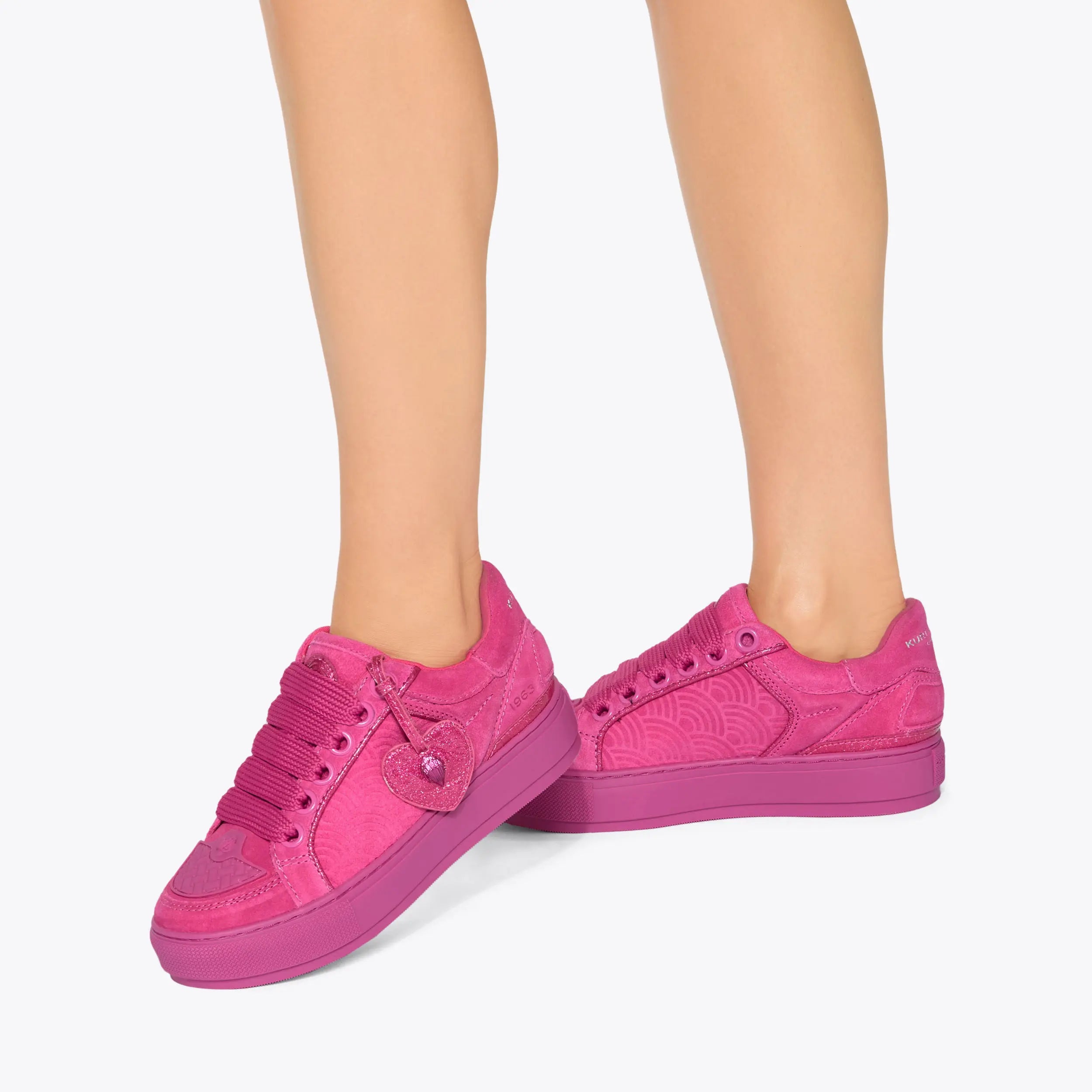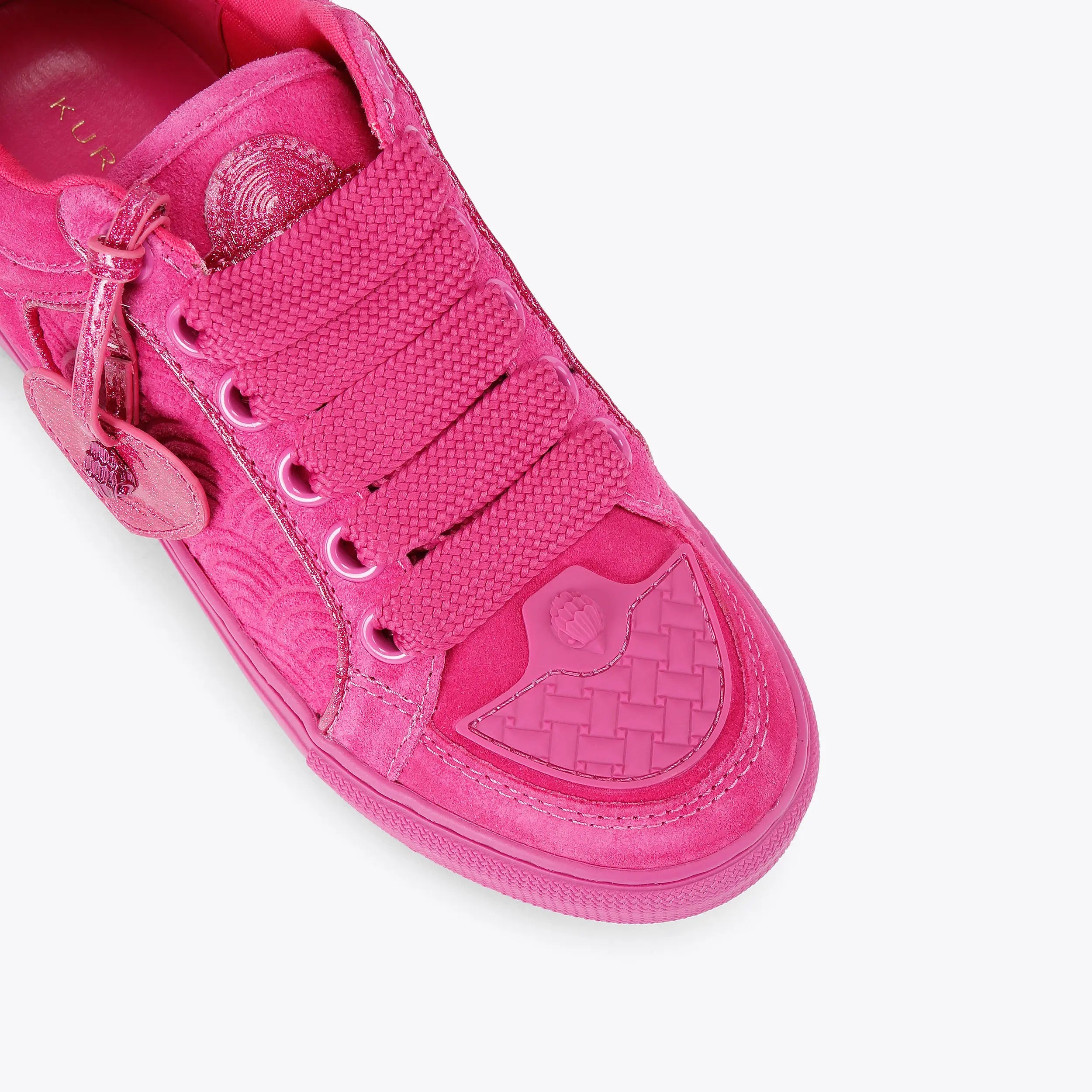 The Southbank Tag sneaker features a pink suede upper. There is a glitter pink heart tab on the laces with antiqued silver eagle head on top.