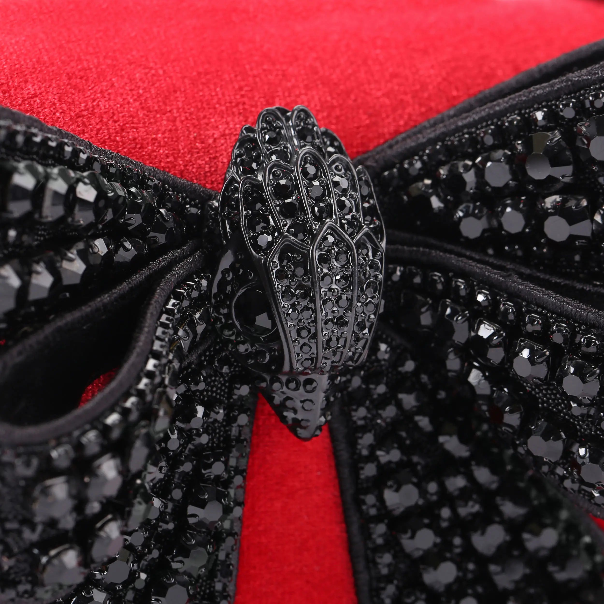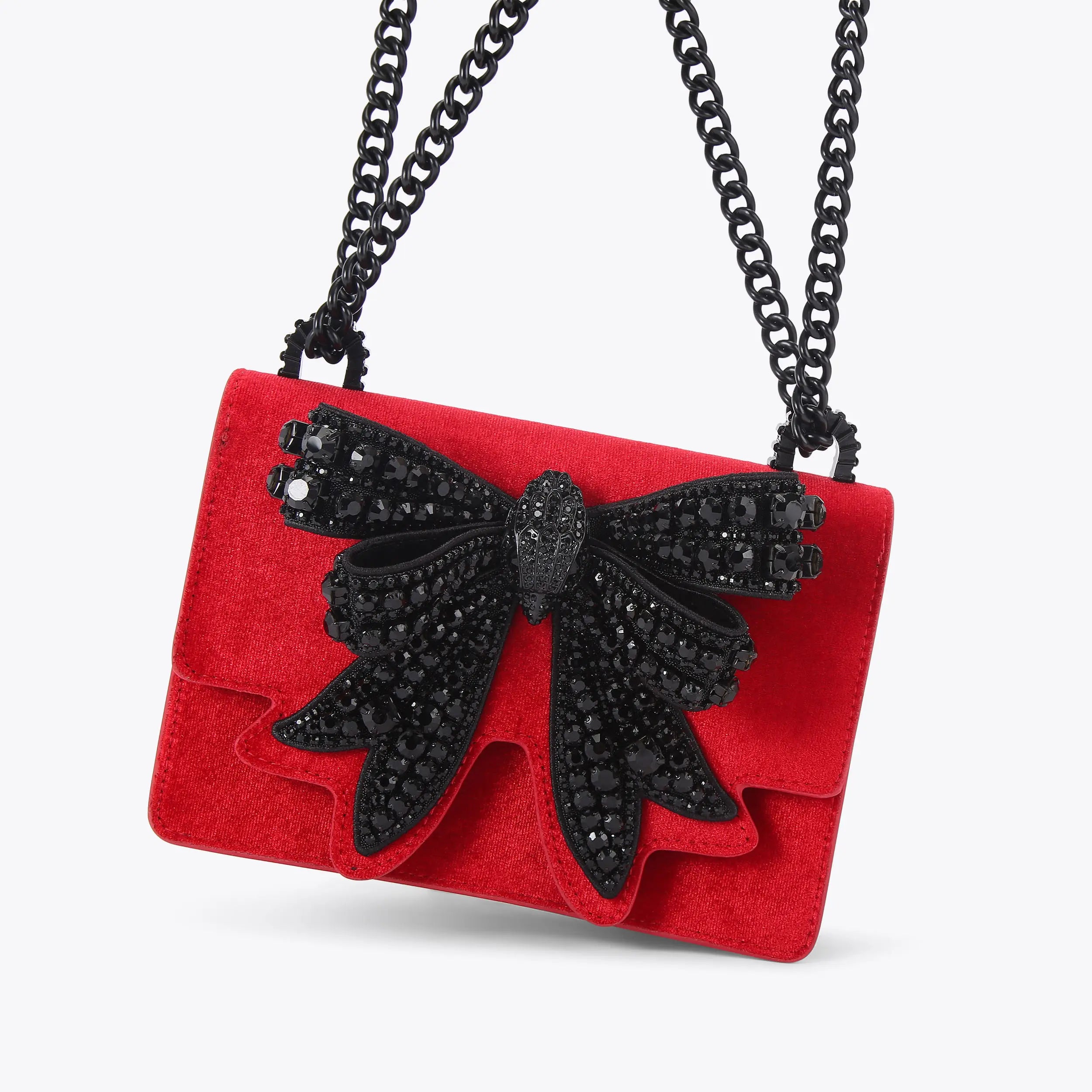 The Small Shoreditch Cross Body is crafted with a red velvet exterior. The front flap is topped with crystal embellished bow with a black eagle head in the centre.