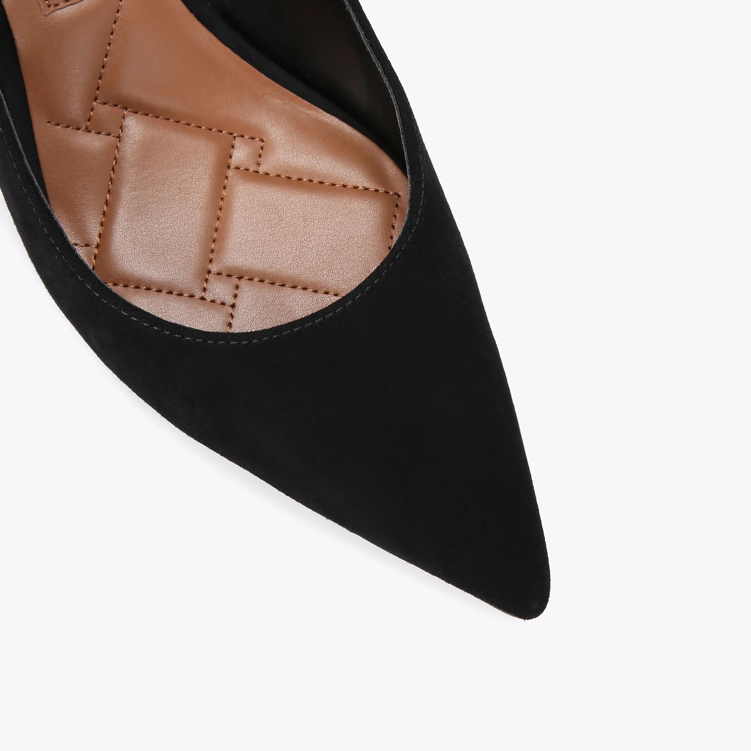 The Belgravia Slingback arrives in a black suede with pointed toe and elasticated ankle strap.