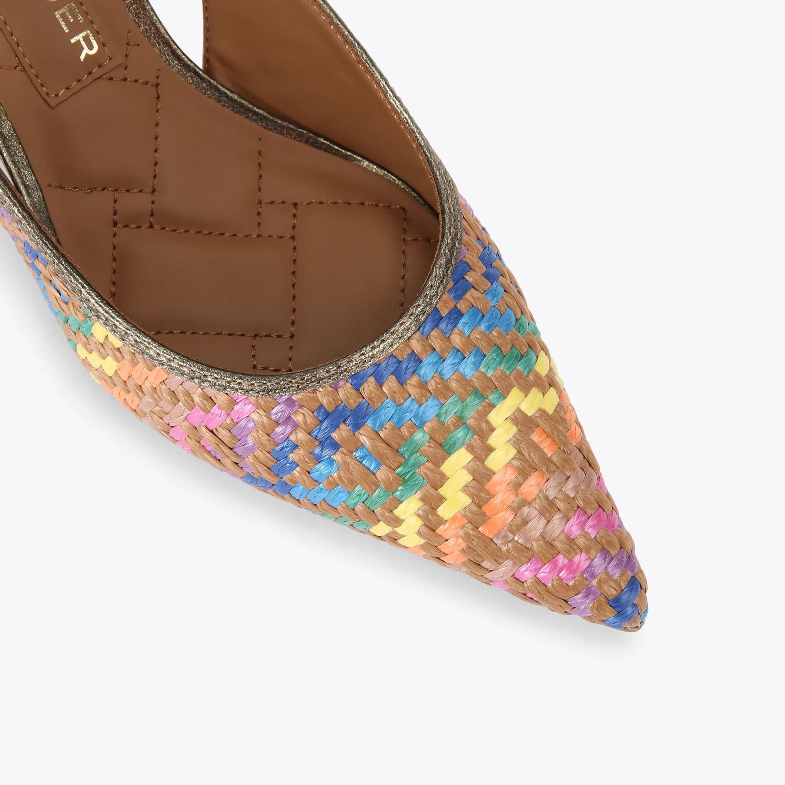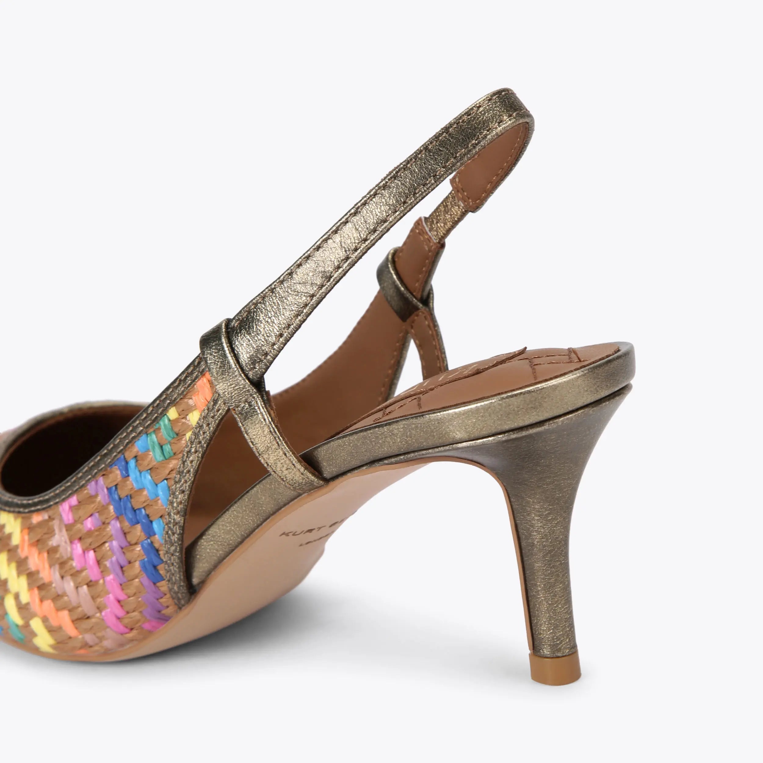 The Belgravia Sling Back heel features a raffia style woven upper on tan base with rainbow weave.