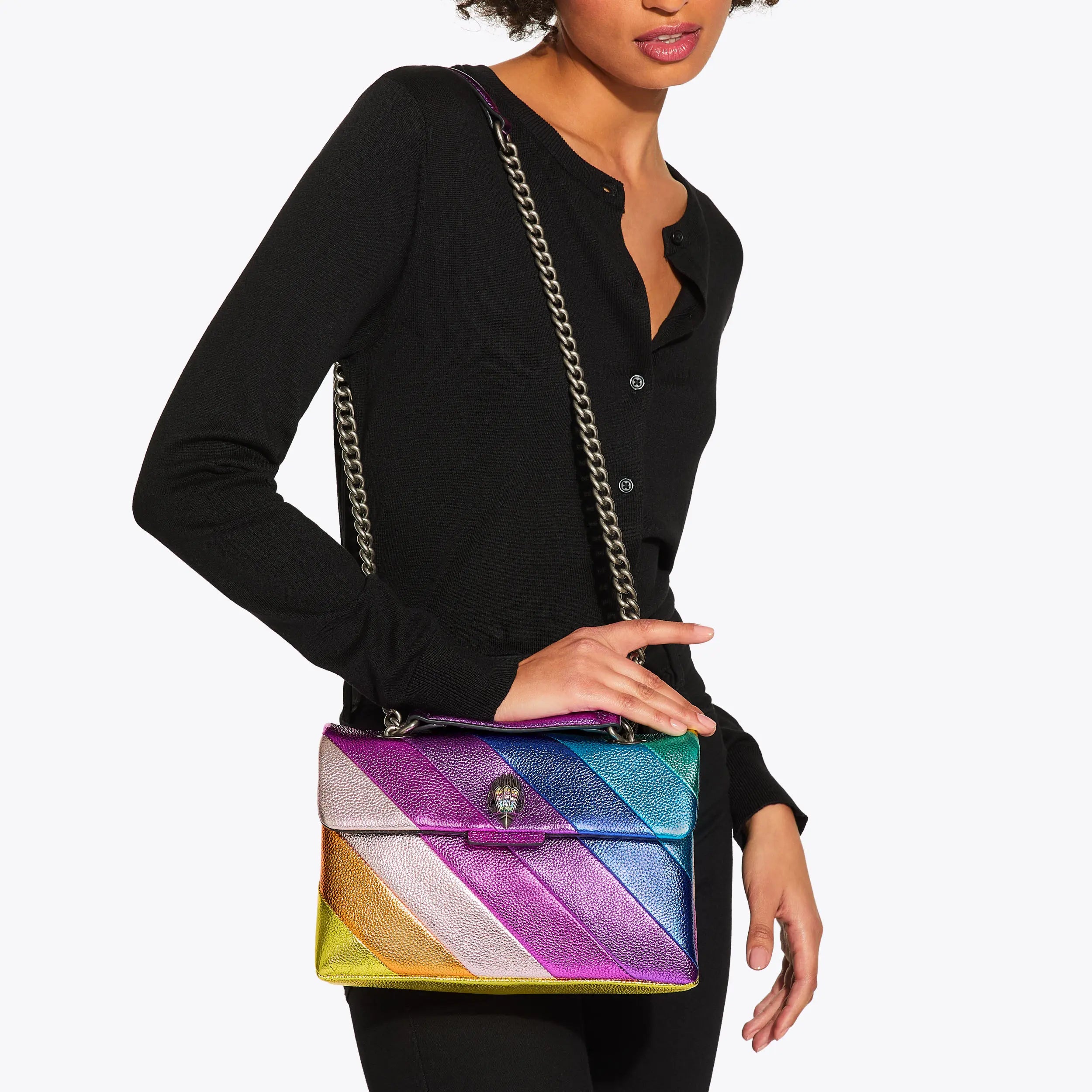 The Leather Kensington Purse is crafted from soft metallic laminated pebble grain cow leather with iconic rainbow sewn stripe pattern. . The antiqued silver Eagle head features rainbow colored crystals and black crystal eyes on the front flap.