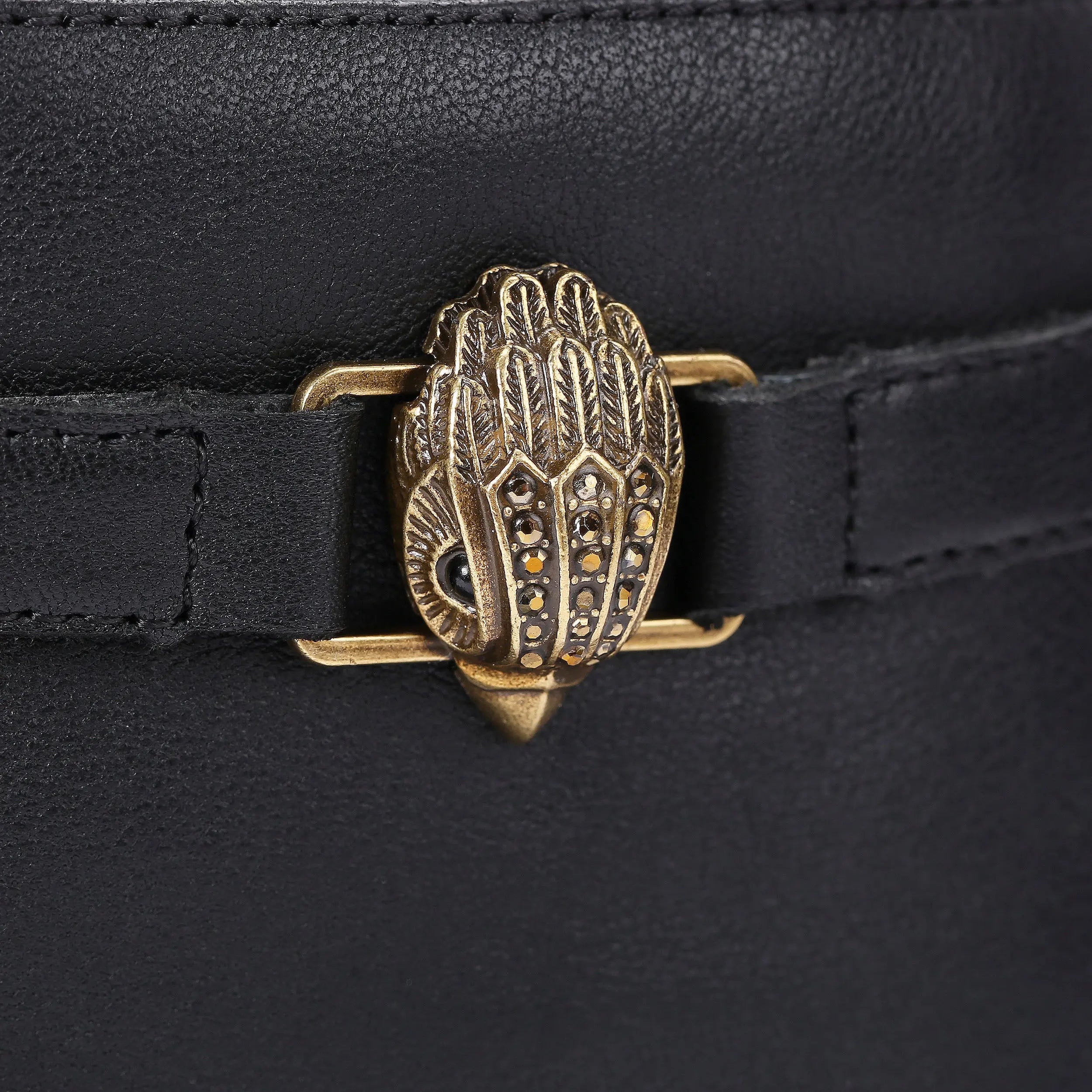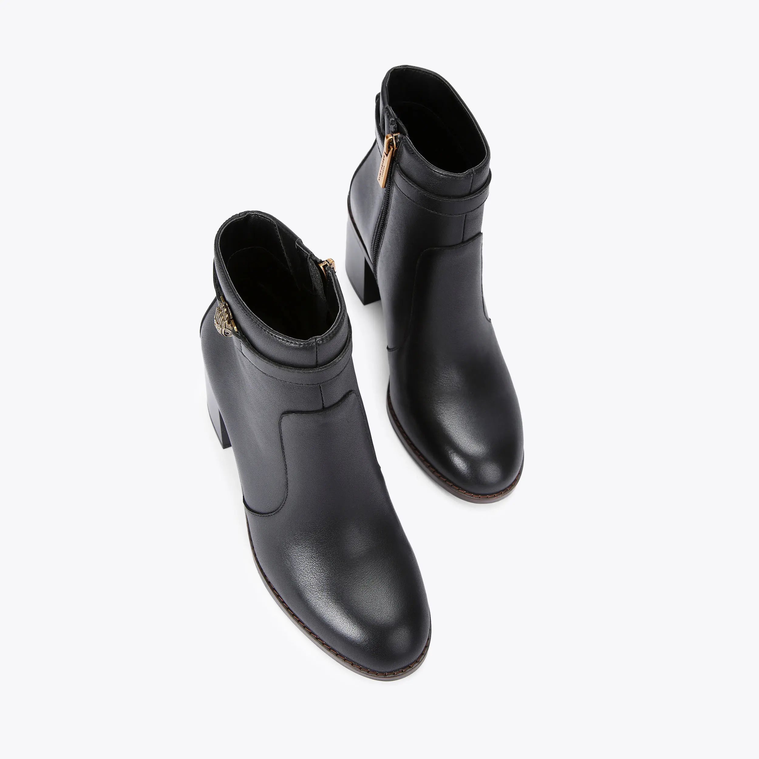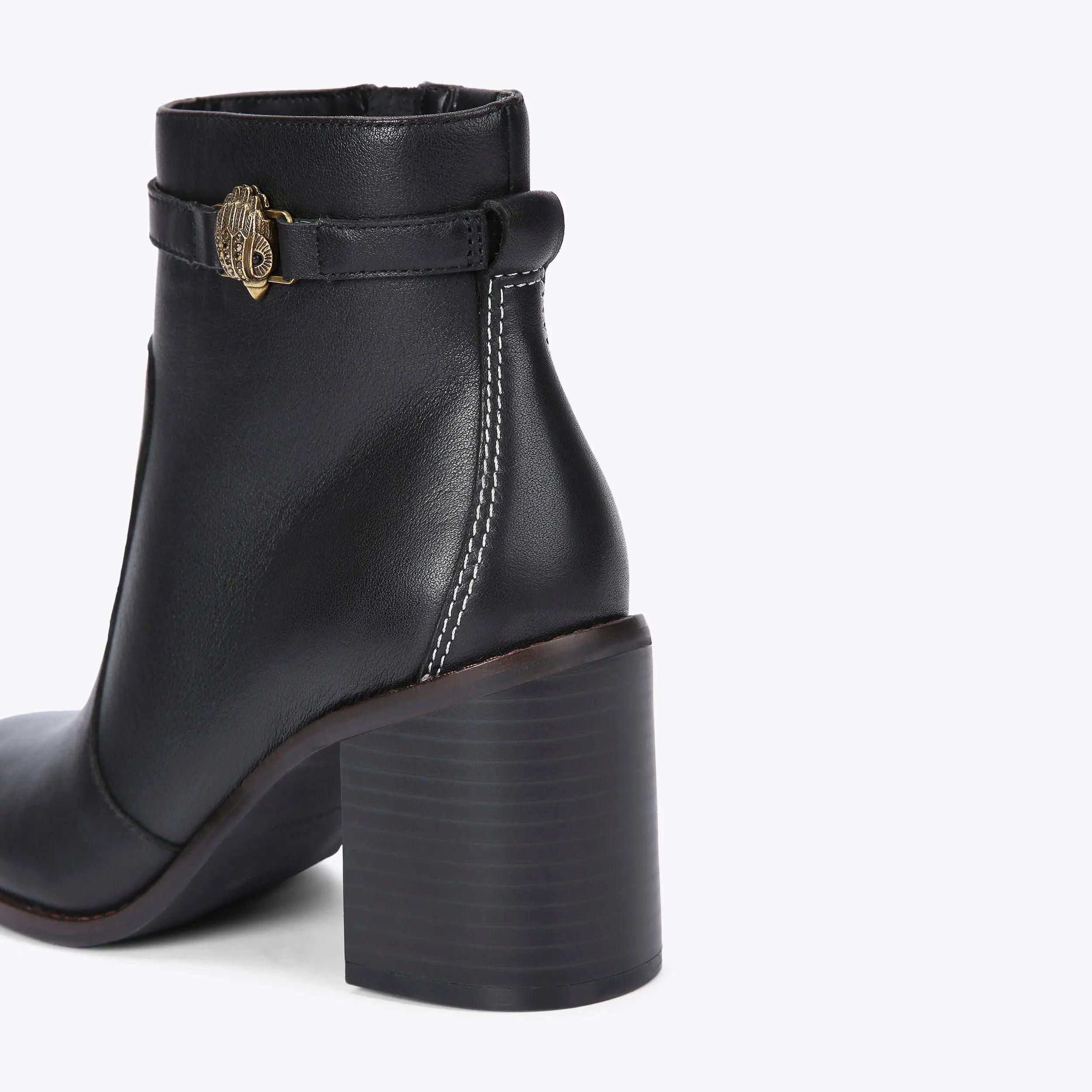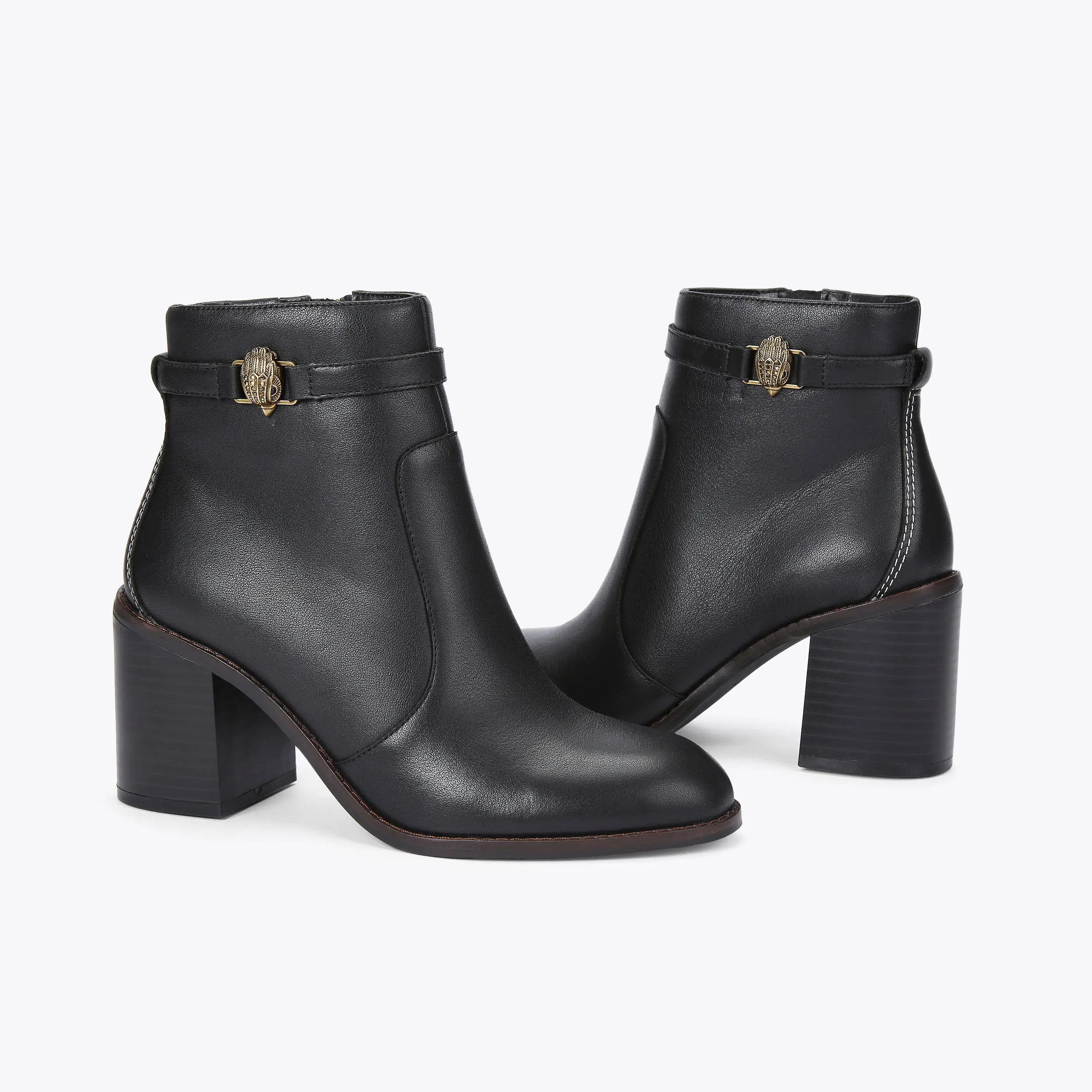 The Shoreditch Block Ankle boot is crafted from a black leather. The ankle feature an antiqued brass eagle head with antiqued brass zipper pull on the opposite side.