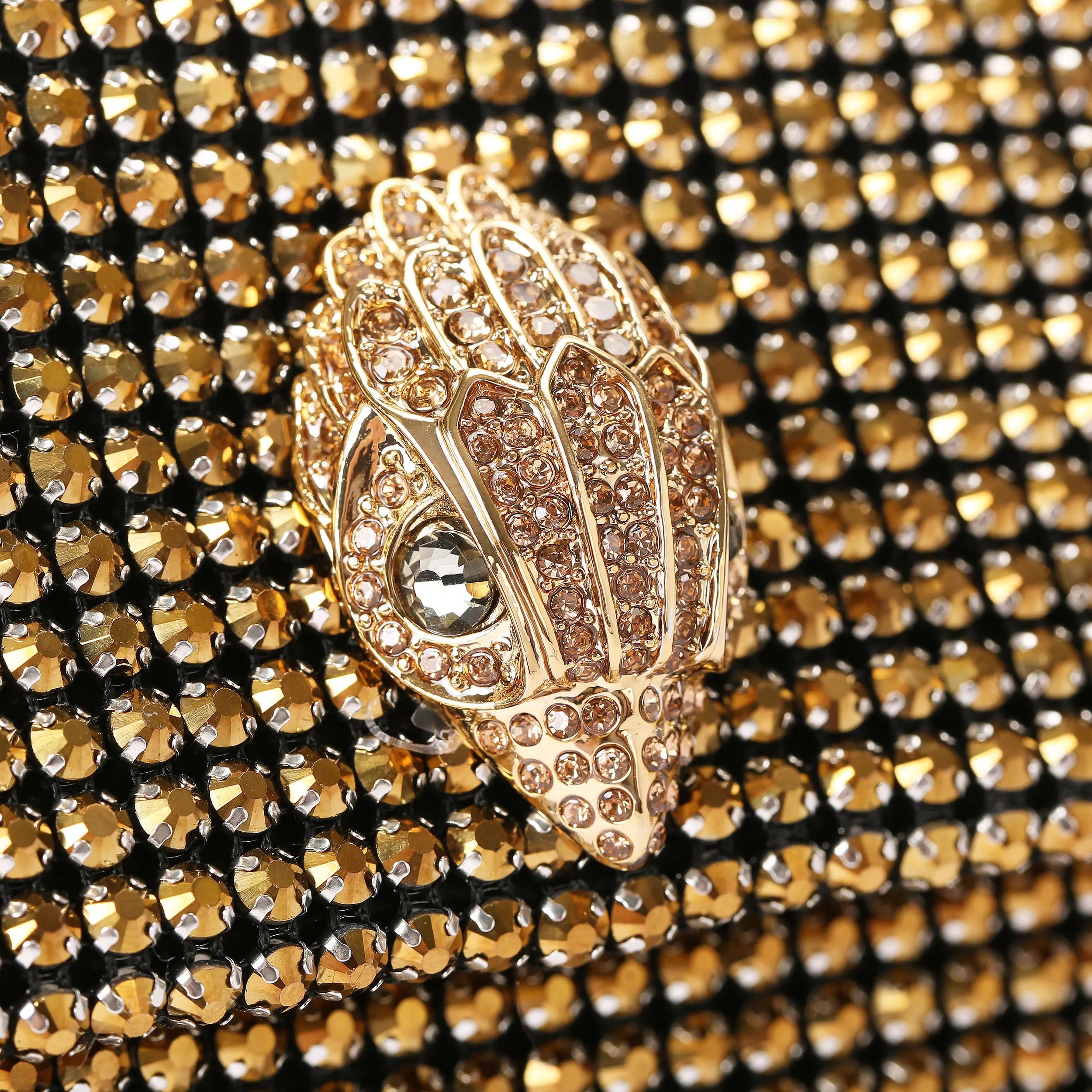 This Party Shoulder features a soft exterior which is embellished with gold crystals. The gold eagle head features crystals on the front flap.
