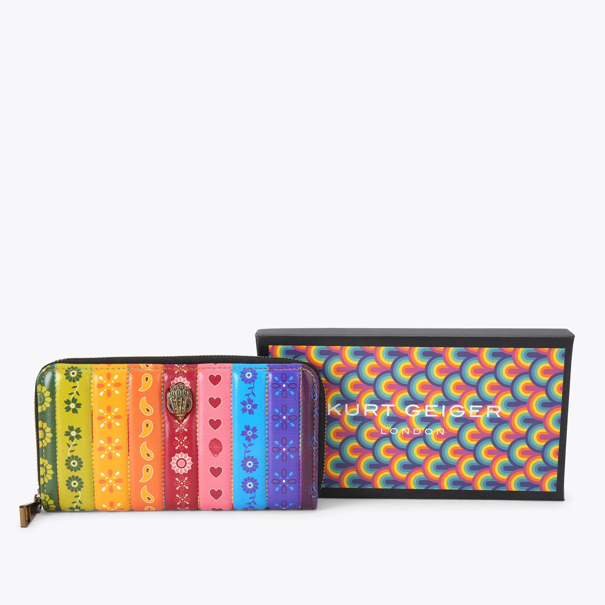 The Kensington Zip Around Wallet is crafted from a striped lambskin leather in a striped rainbow design with different designs on each panel. The antiqued brass eagle head features crystals and crystals eyes which sits on the front.