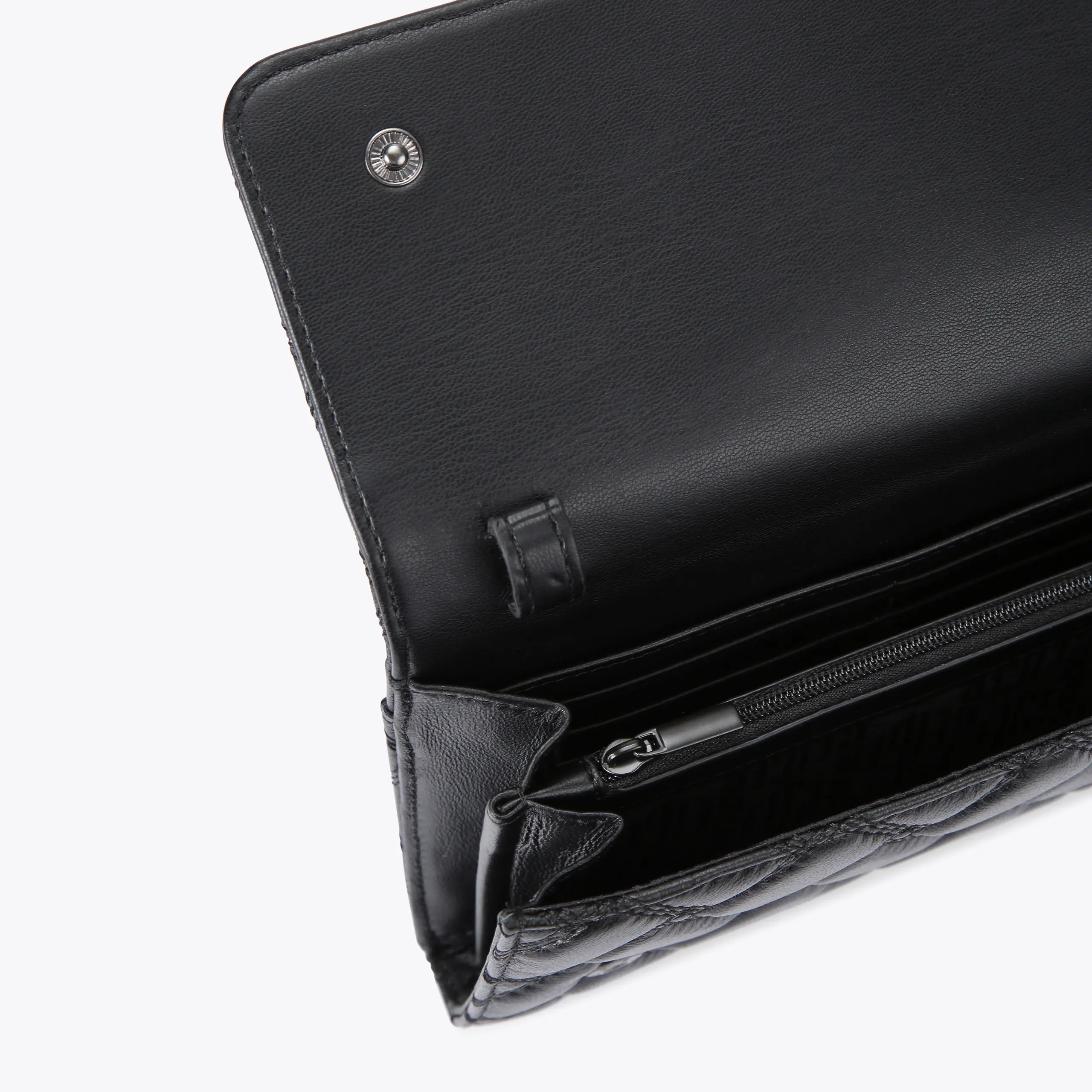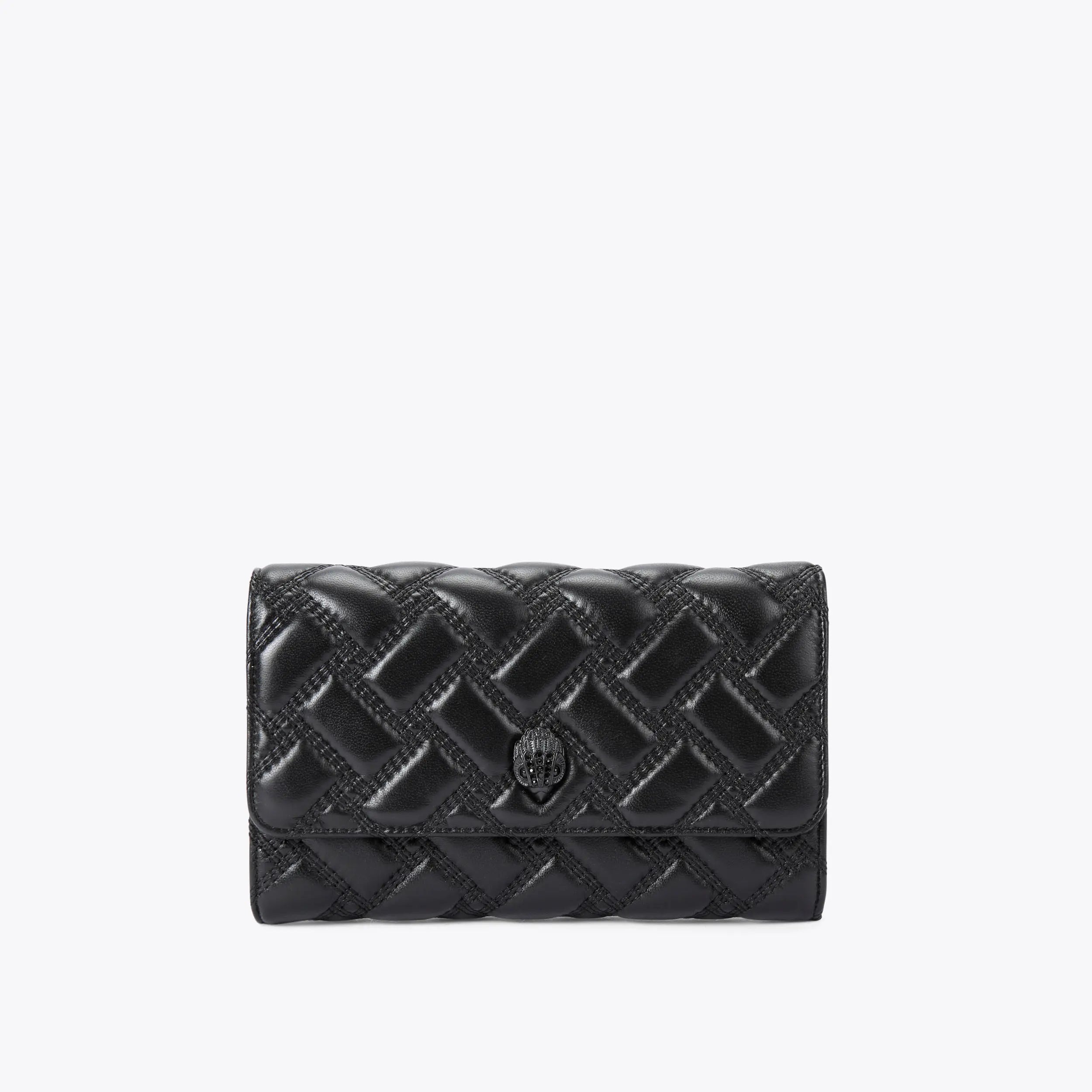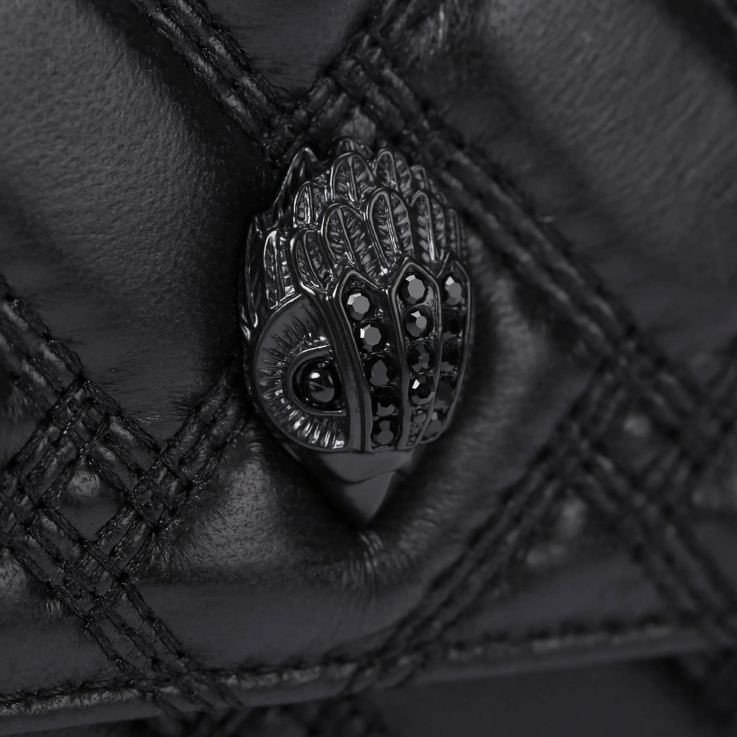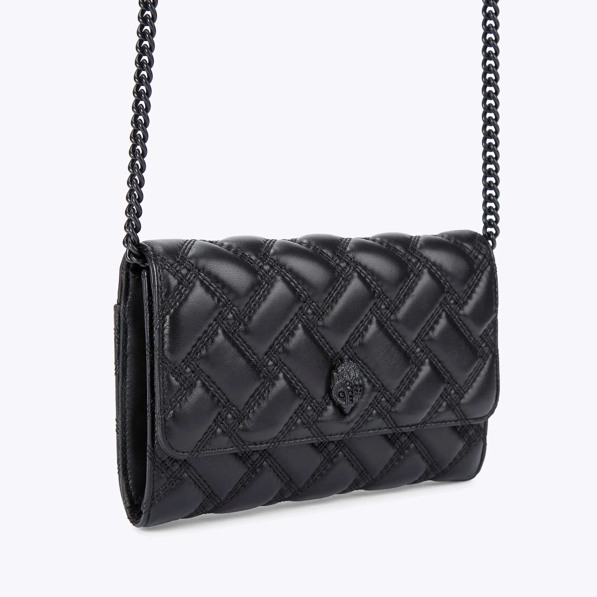 The Kensington Chain Wallet is crafted from a soft lambskin leather with signature parquet padded overstitch quilt with three rows of weave pattern. The black eagle head features crystals on the front flap.