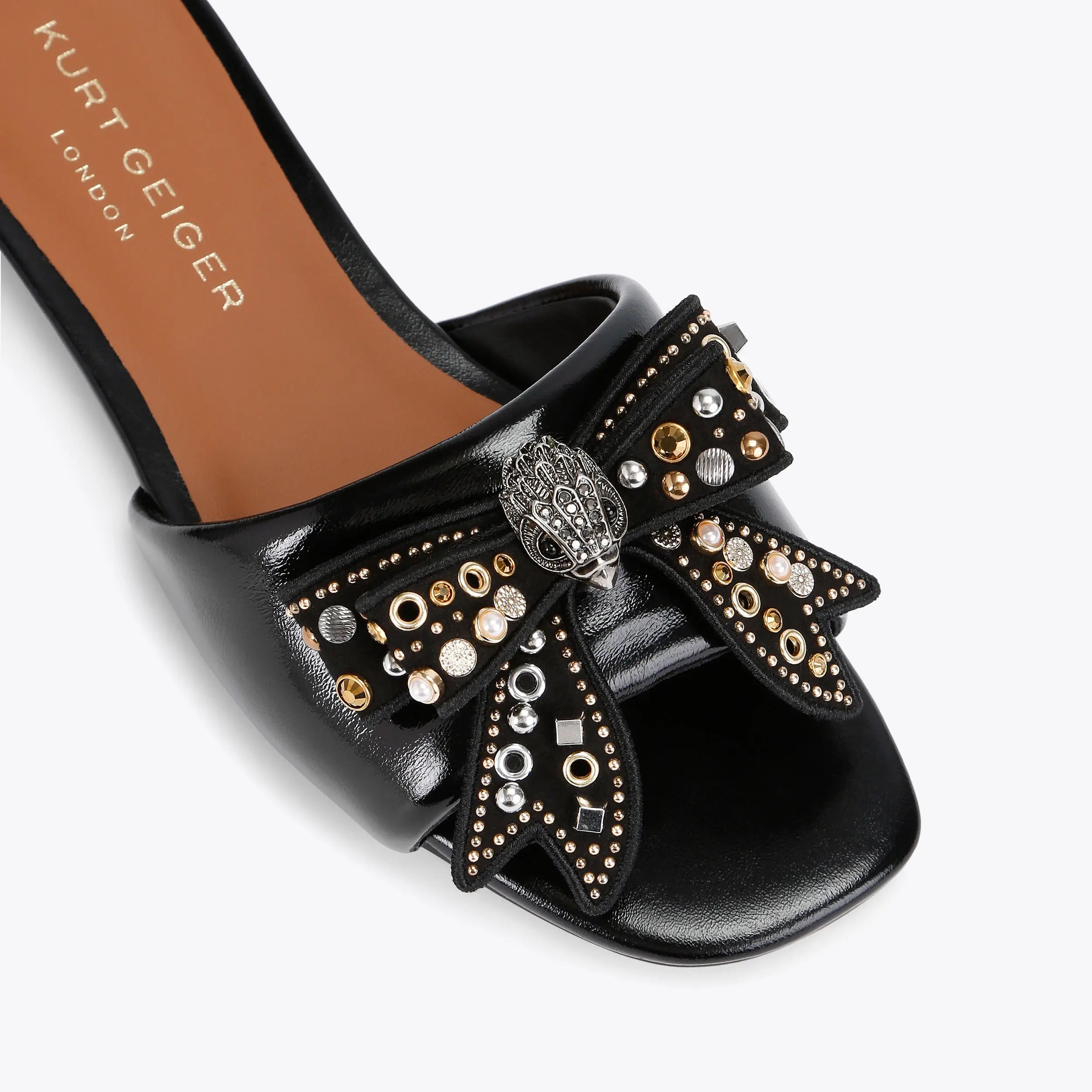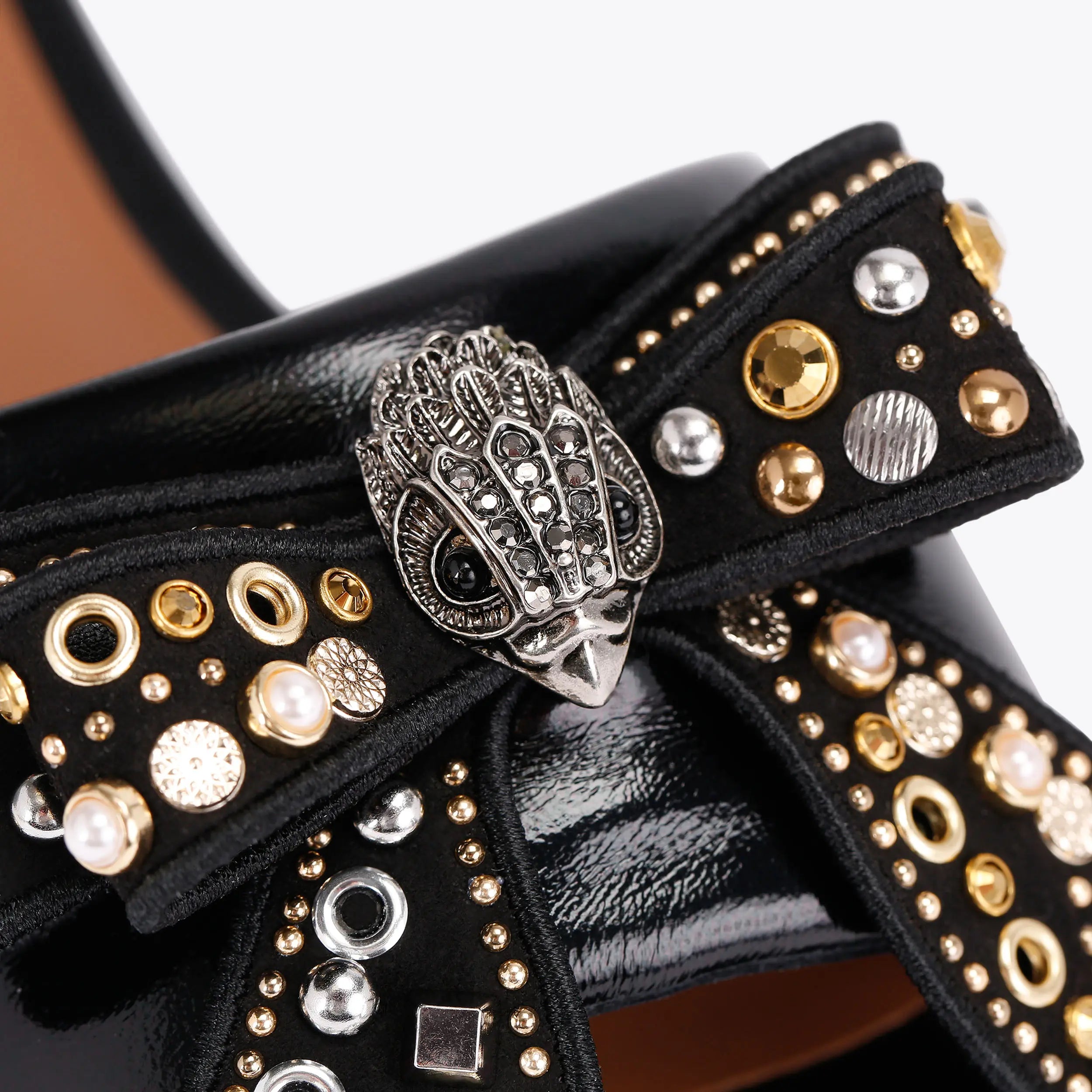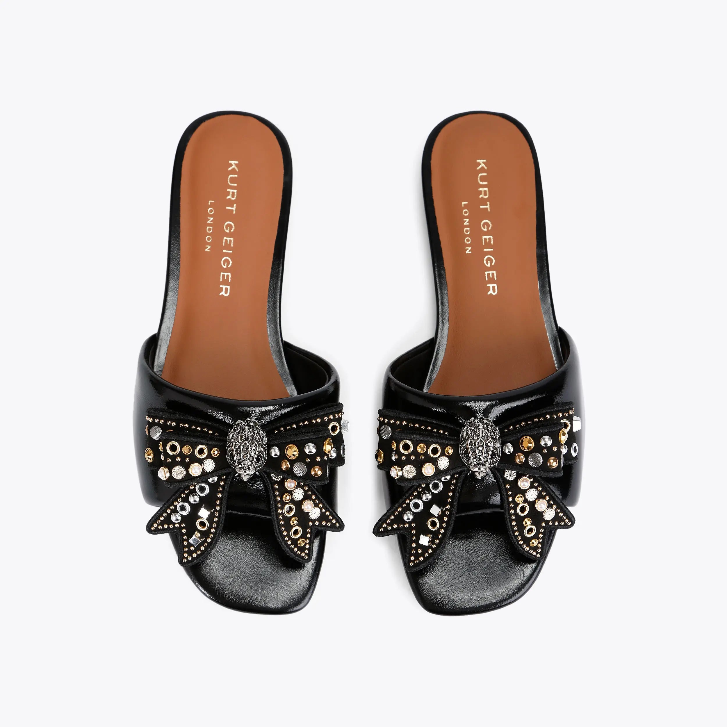 The Kensington Flat Sandal, an addition to the Kensington Collection, is crafted from a black leather topped with a crystal bow. There is an antiqued brass eagle head at the centre of the statement bow.