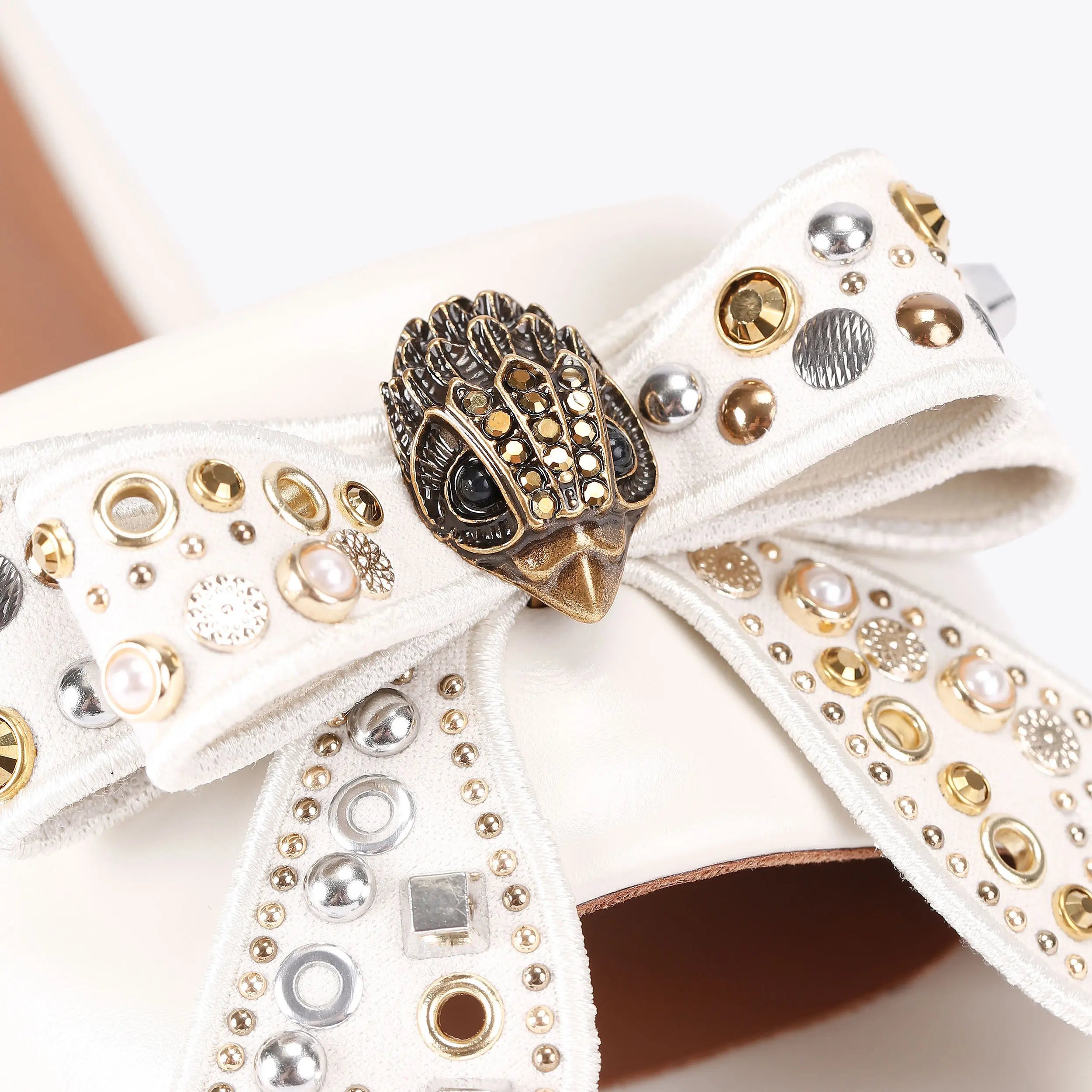 The Kensington Flat Sandal, an addition to the Kensington Collection, is crafted from a bone leather topped with a crystal bow. There is an antiqued brass eagle head at the centre of the statement bow.