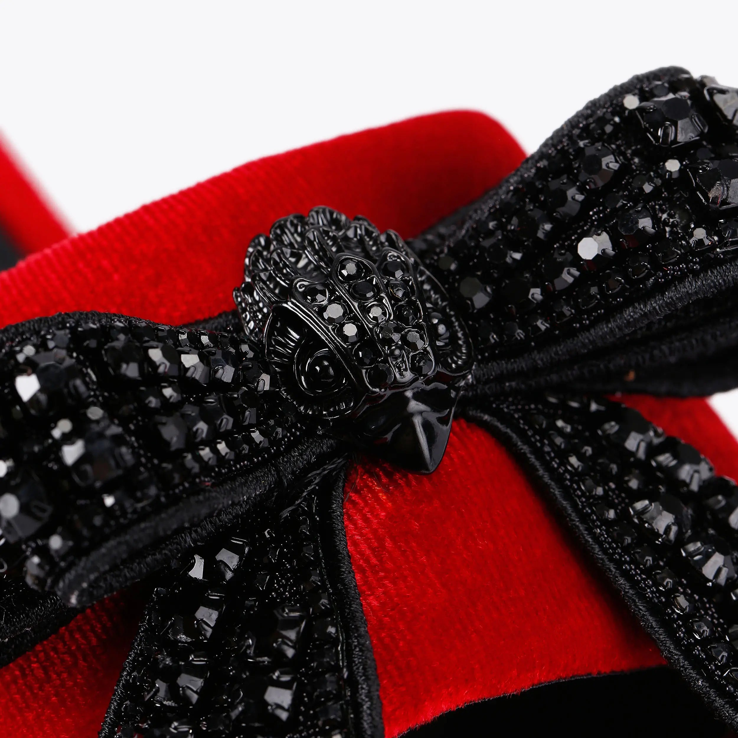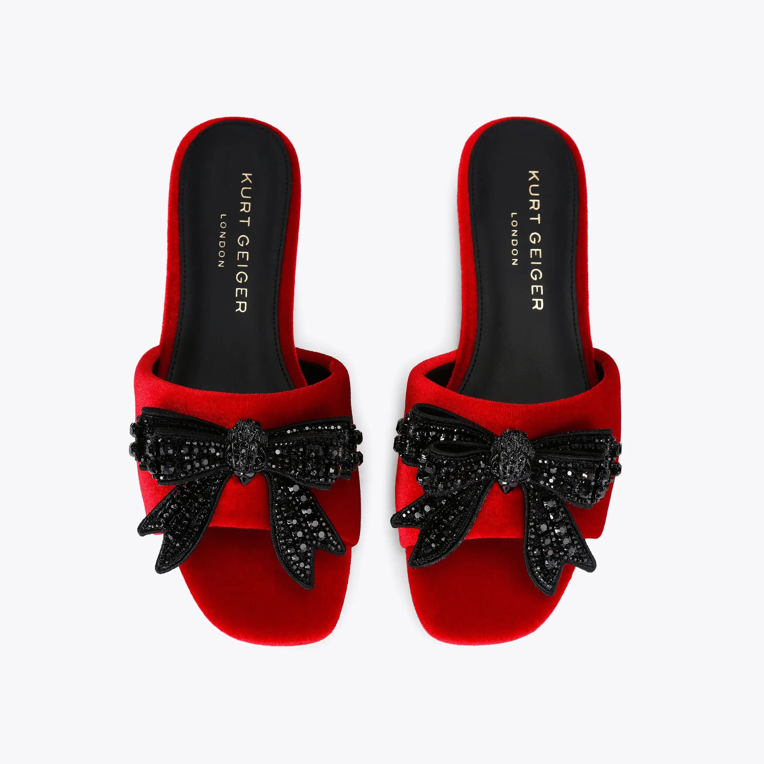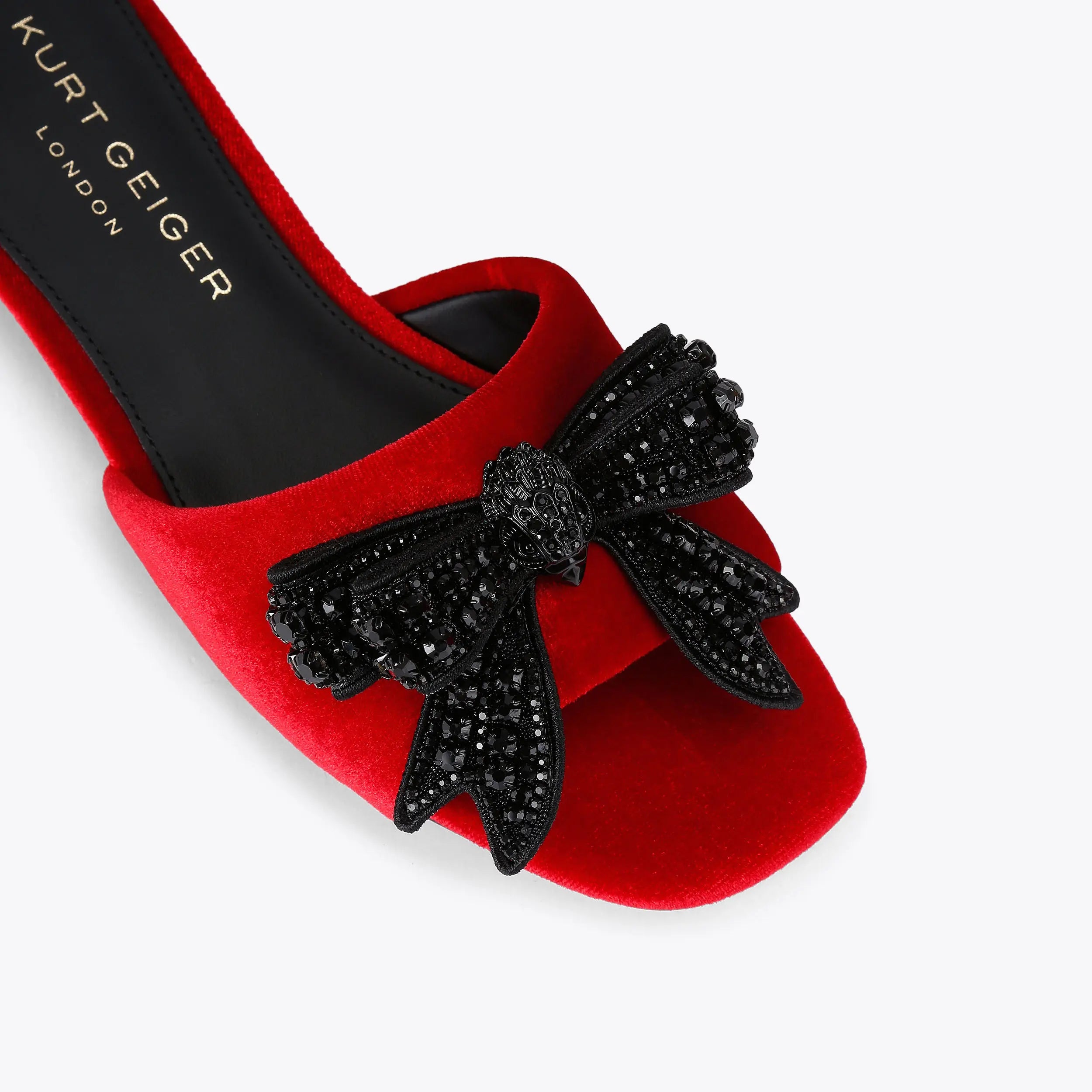 This Kensington Bow Flat Sandal is crafted from a softt red velvet fabric. There is a black crystal bow with black crystal eagle head at the centre sat on the strap.