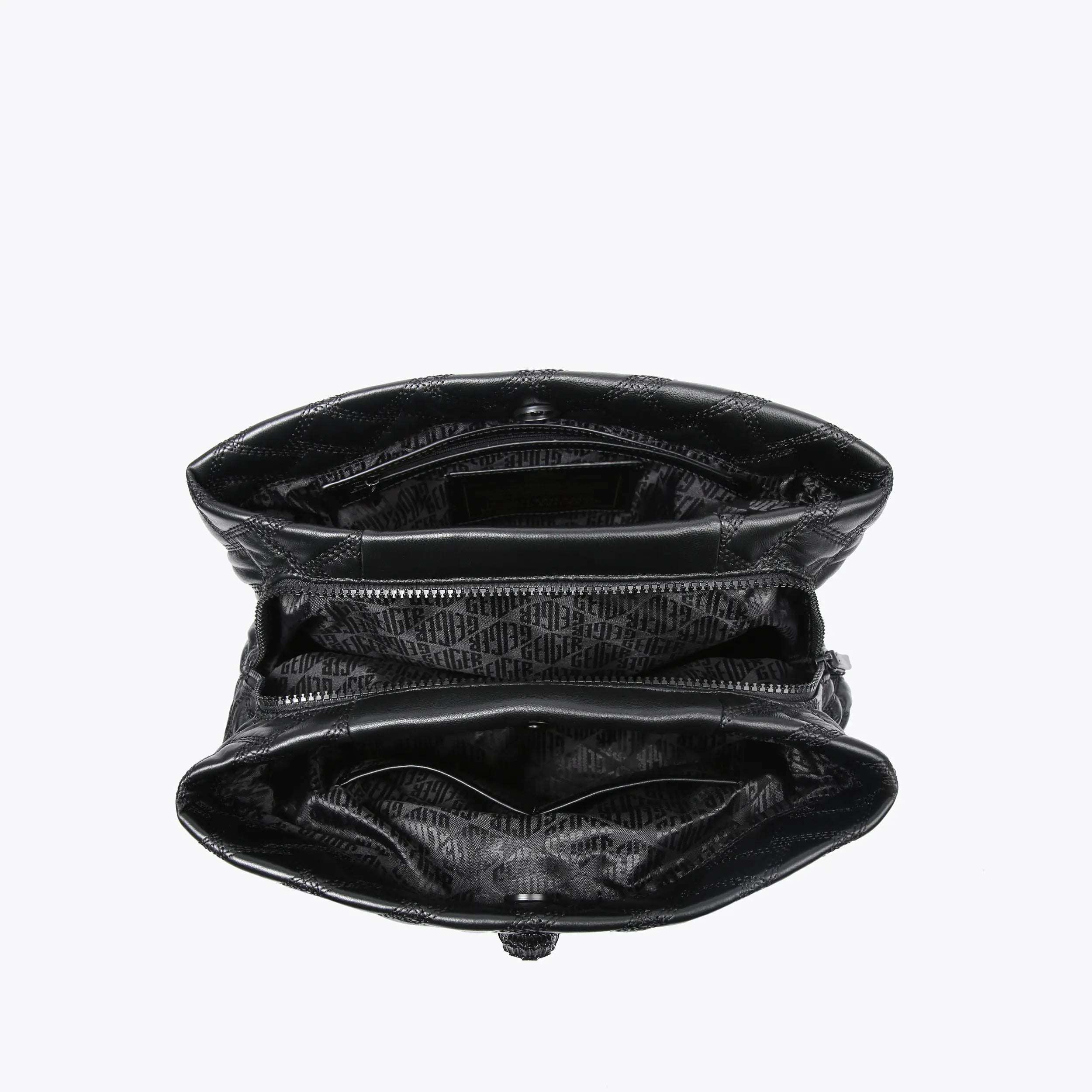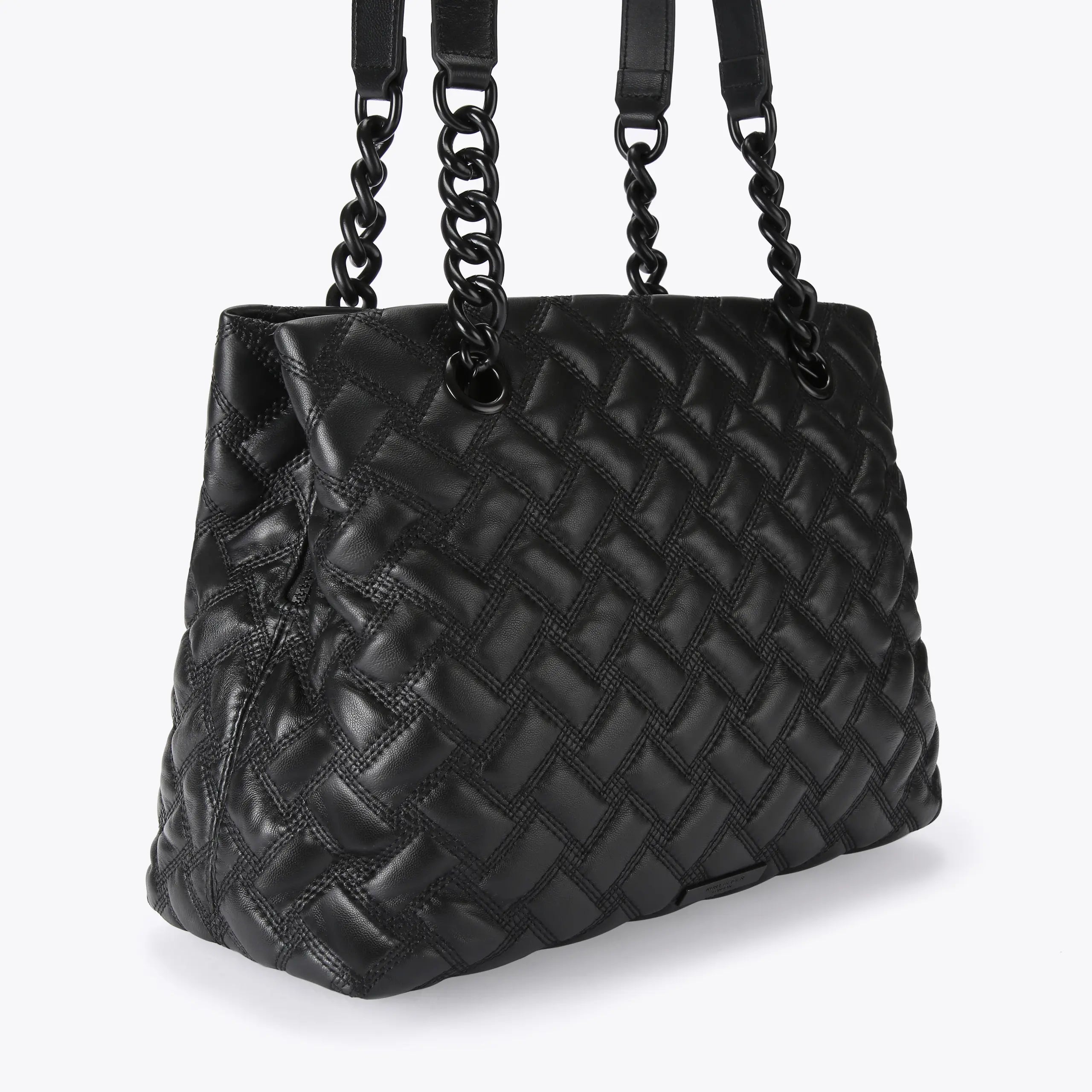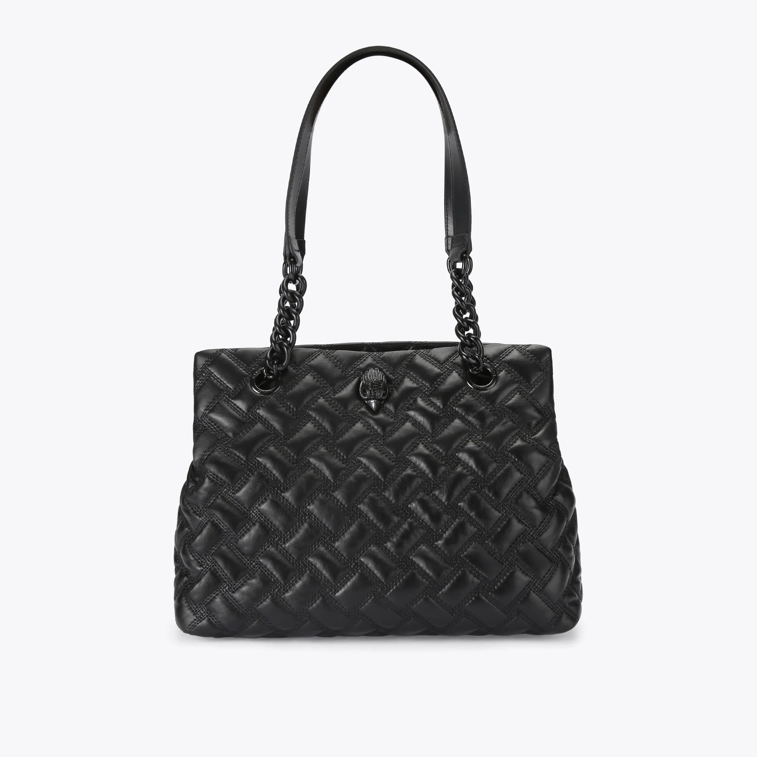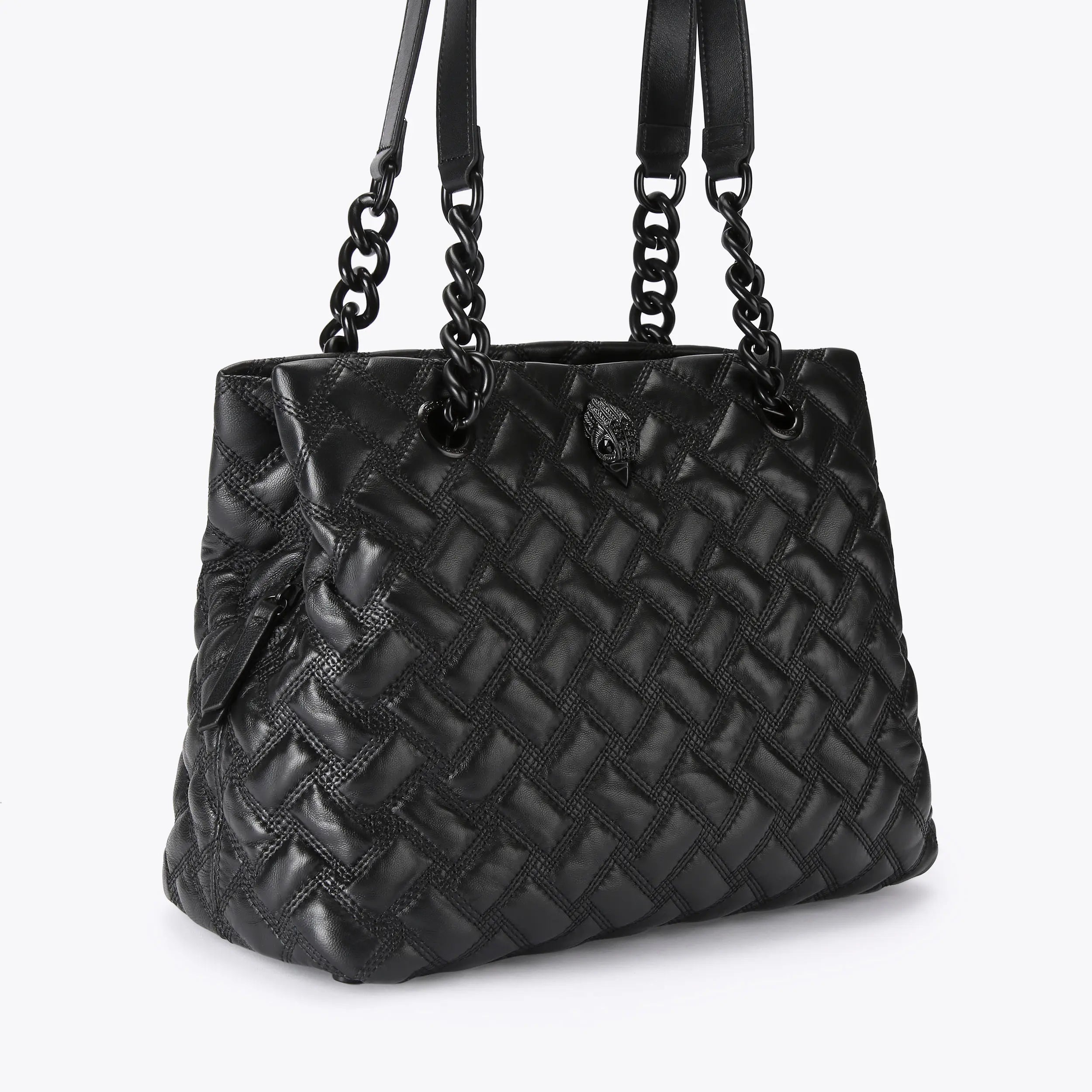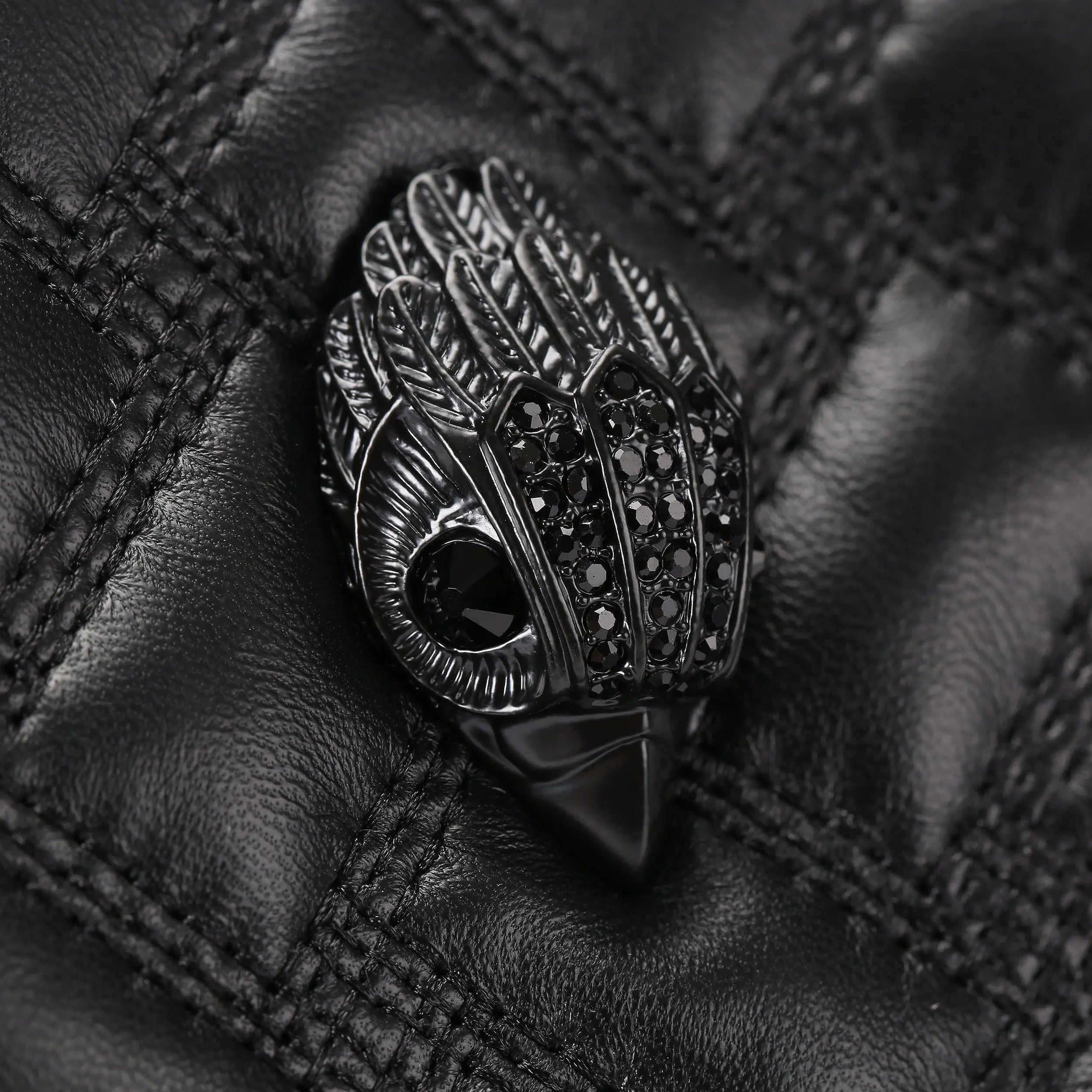 The Kensington Drench Tote is crafted from a soft lambskin leather with signature parquet padded overstitch quilt with three rows of weave pattern. The black eagle head features crystals and black crystal eyes on the front.