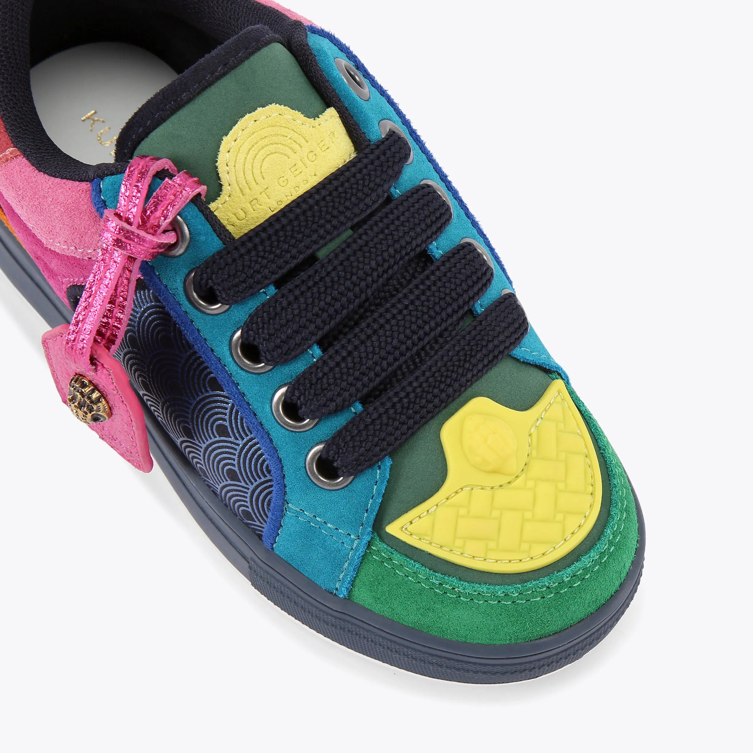This Mini Junior Southbank Tag sneaker is crafted from a suede leather upper with subtle rainbow monogram print. There is a metallic pink tag with antiqued brass eagle head on the tag.