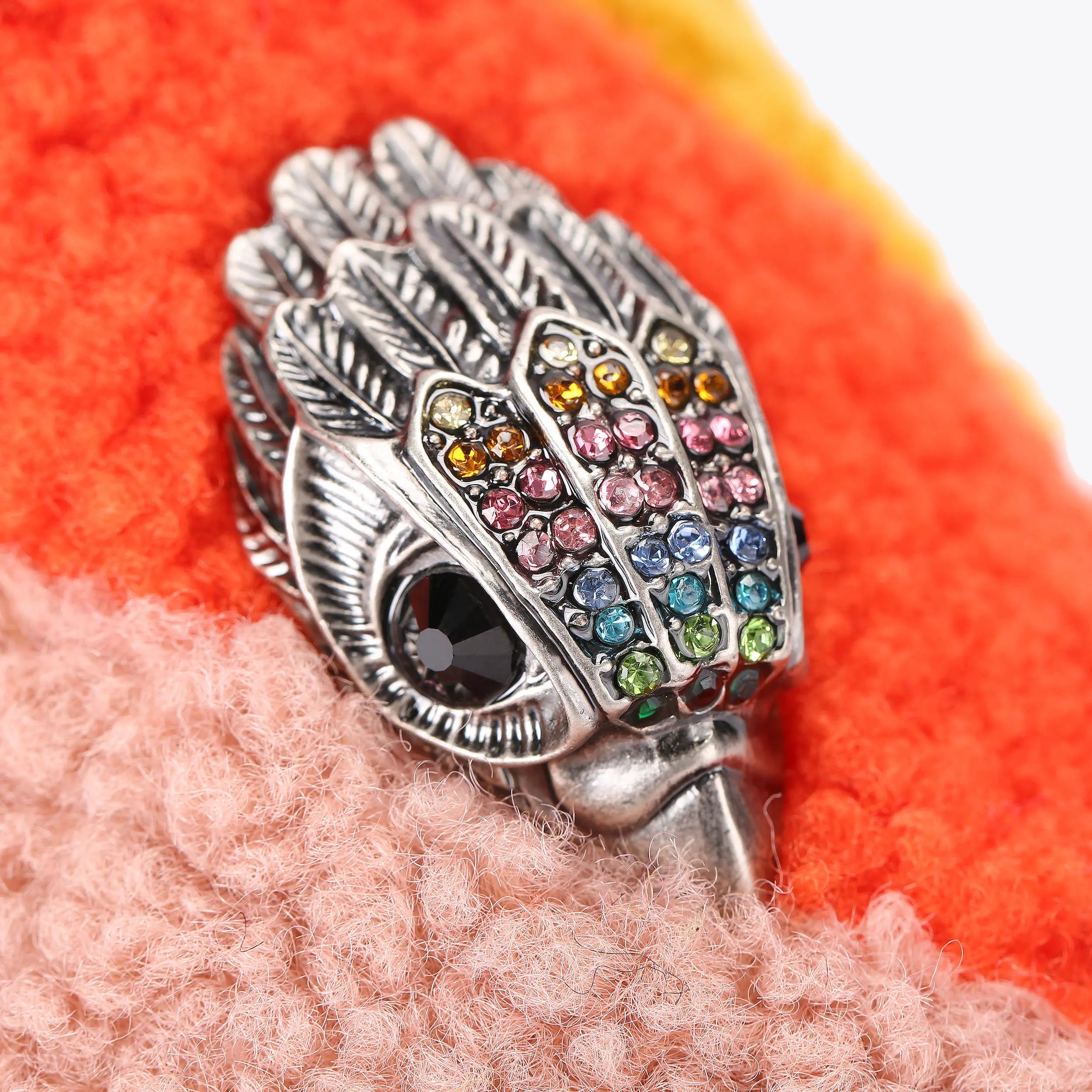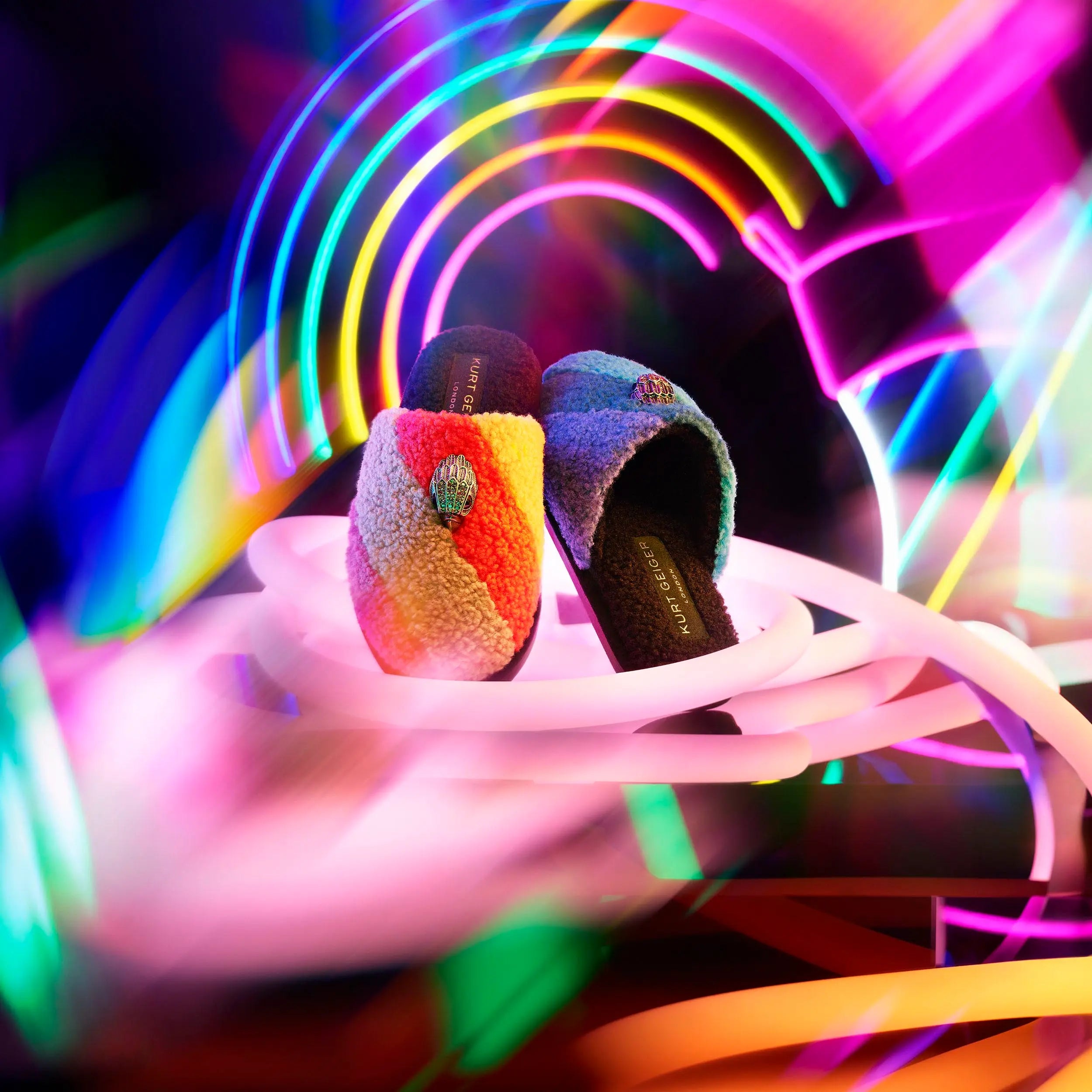 This pair of Kensington Slippers features a teddy upper with classic Kurt Geiger rainbow stripe design. The top of each slipper features an antiqued silver eagle head.
