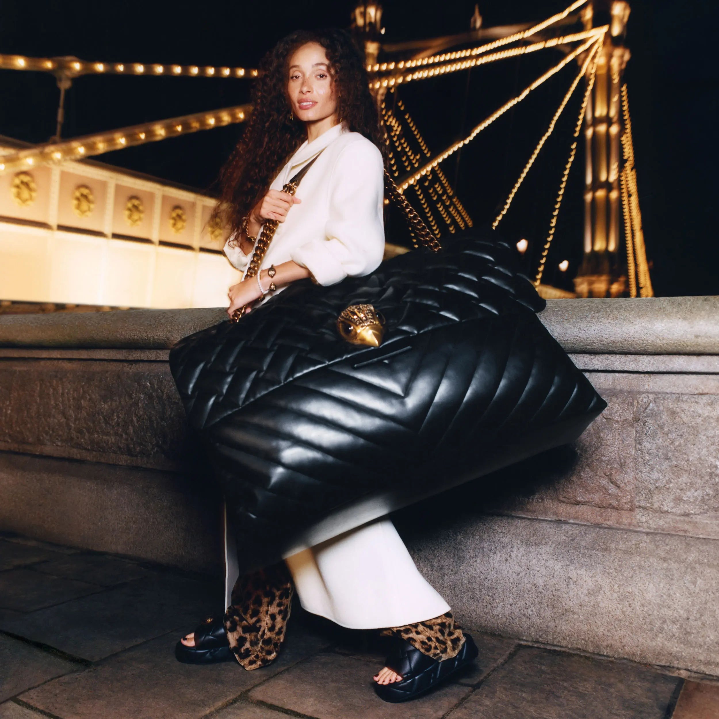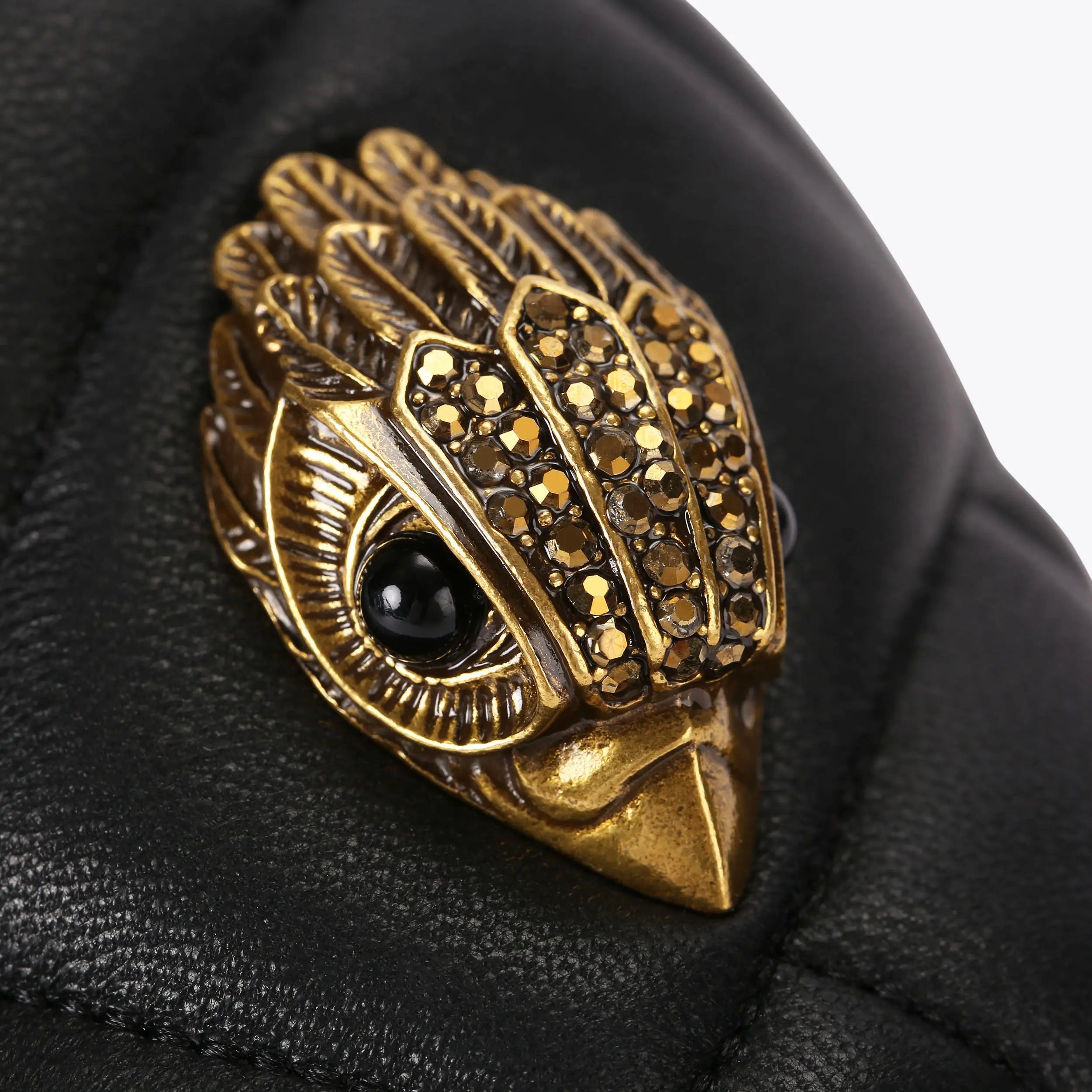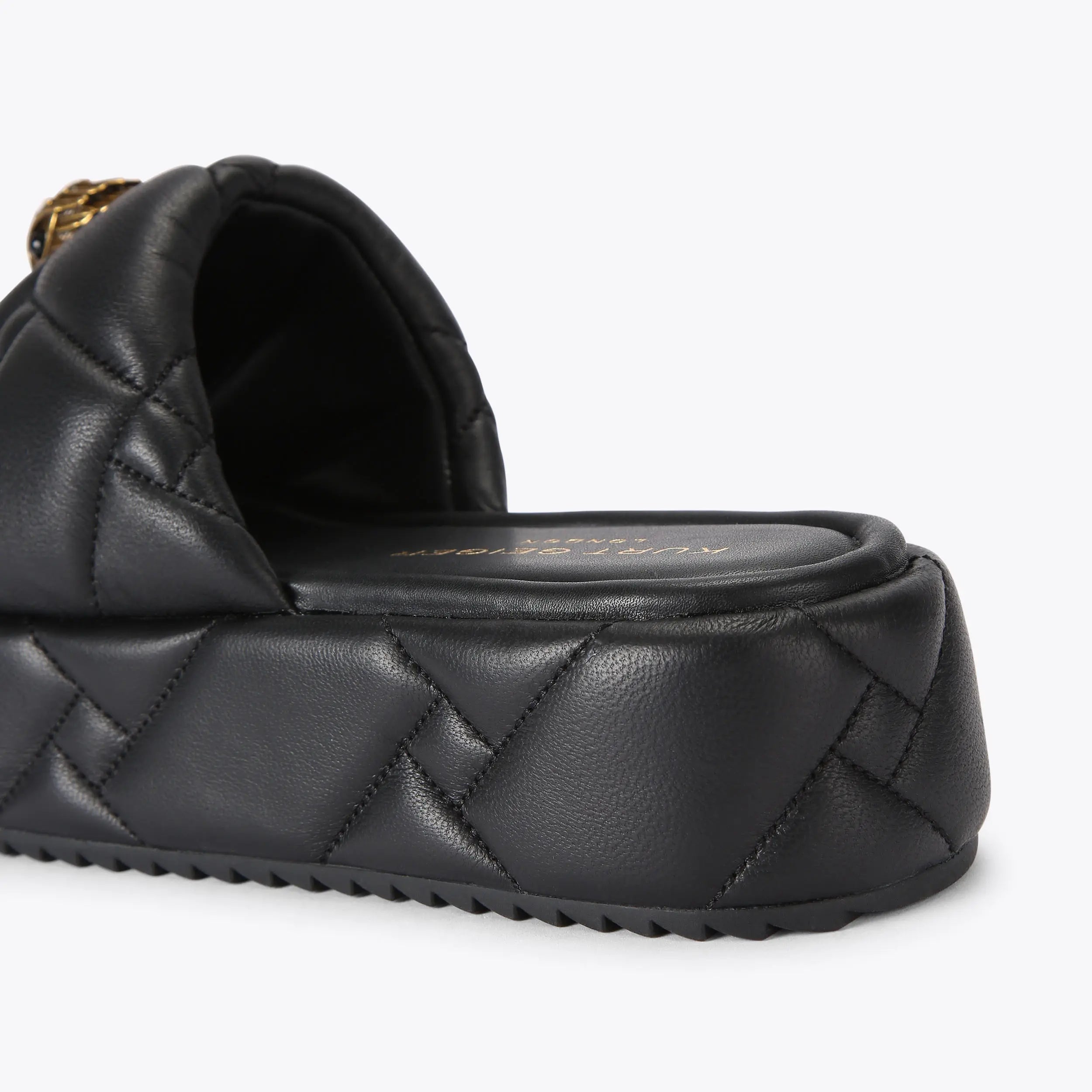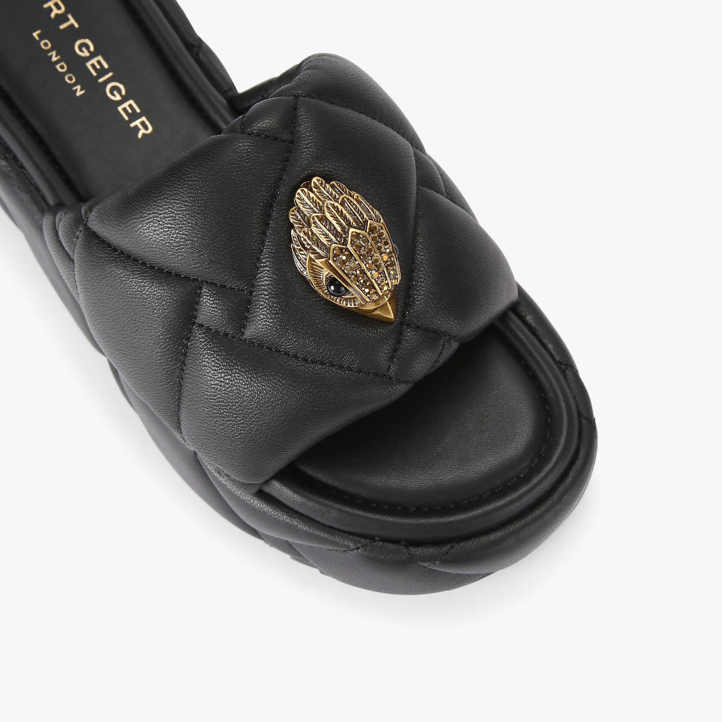 The Kensington Puff Platform sandals feature a black upper with pillow effect to the toe strap. There is an antiqued brass eagle head with crystals on the strap.