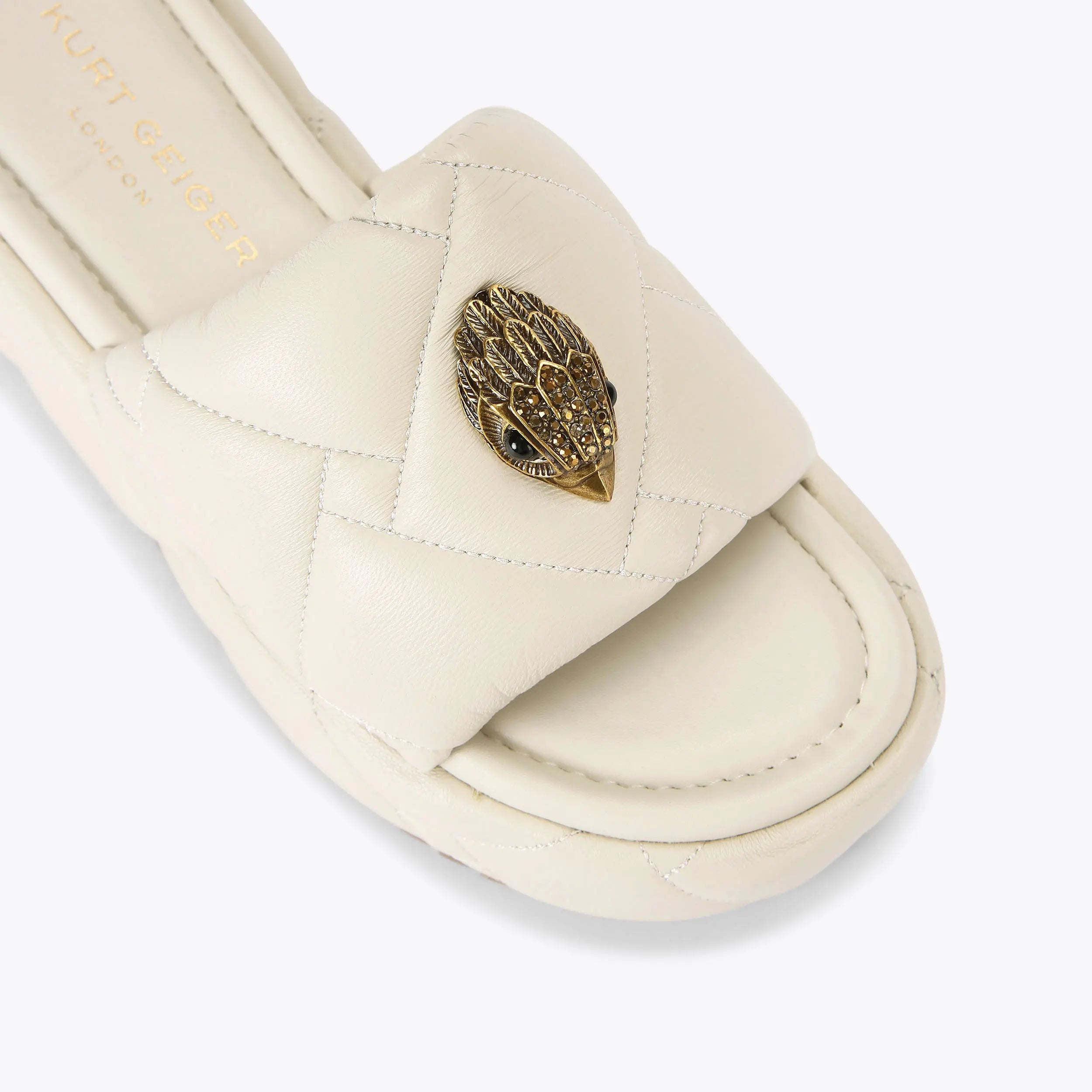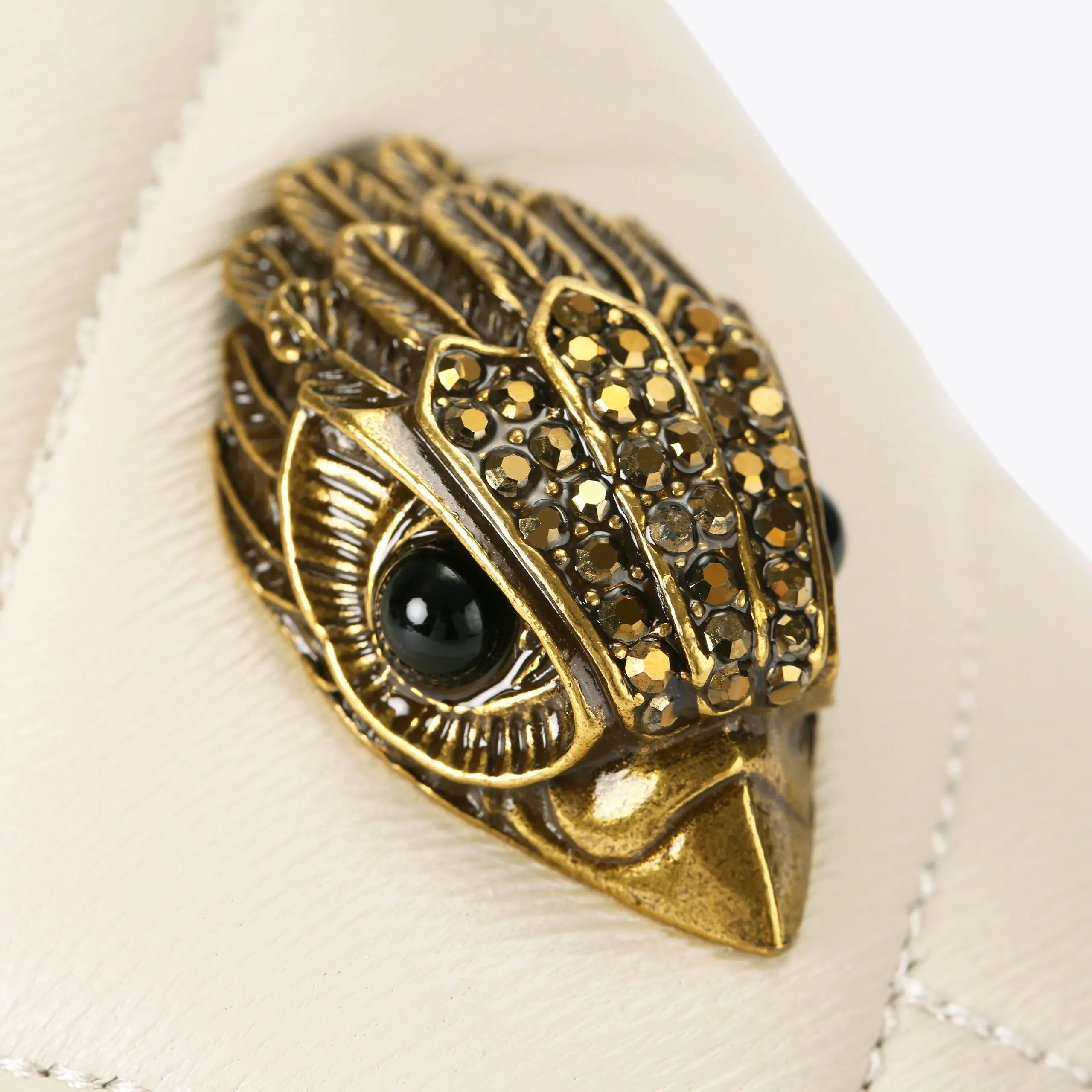The Kensington Puff Platform sandals feature a bone upper with pillow effect to the toe strap. There is an antiqued brass eagle head with crystals on the strap.