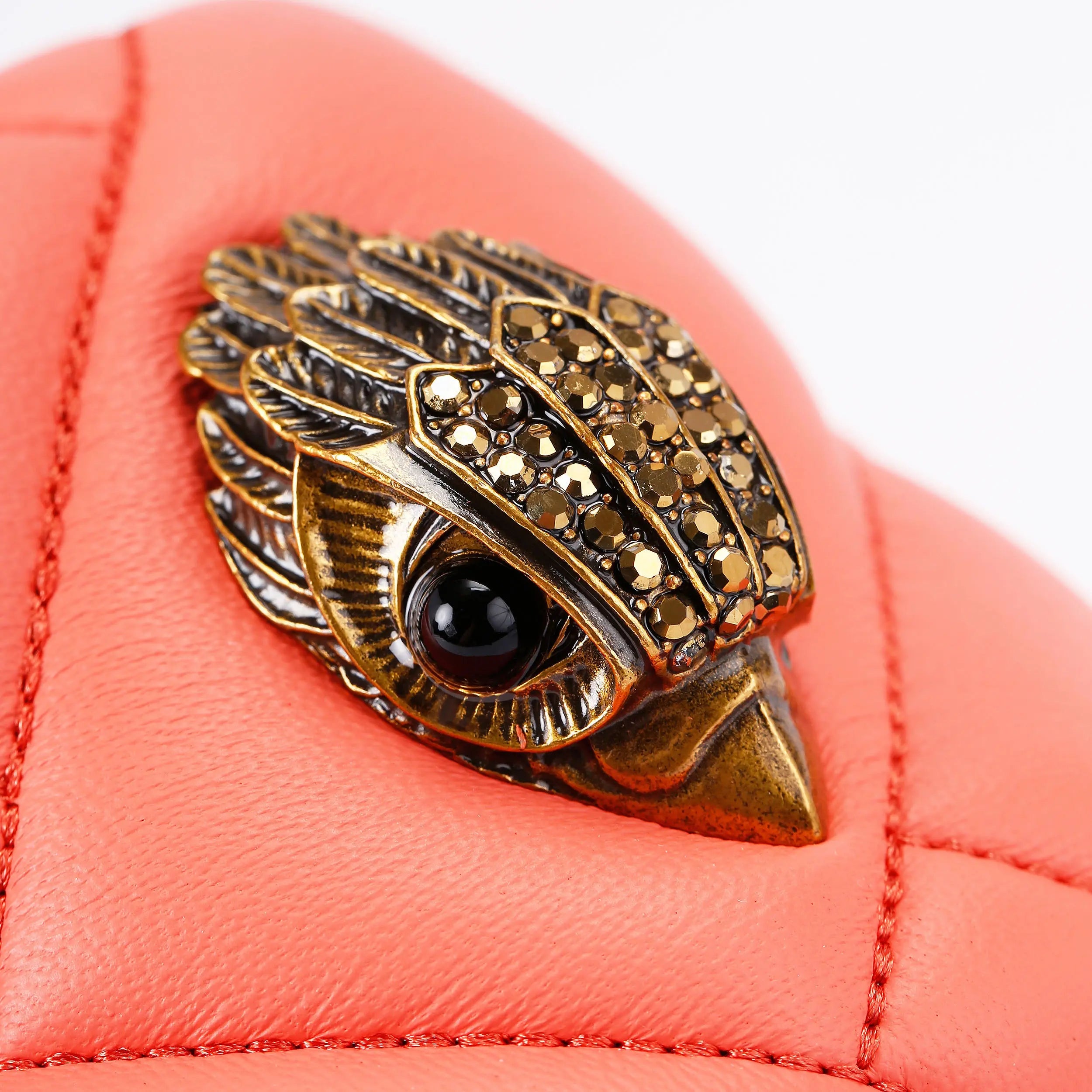 The Kensington Puff Platform sandals feature a peach upper with pillow effect to the toe strap. There is an antiqued brass eagle head with crystals on the strap.