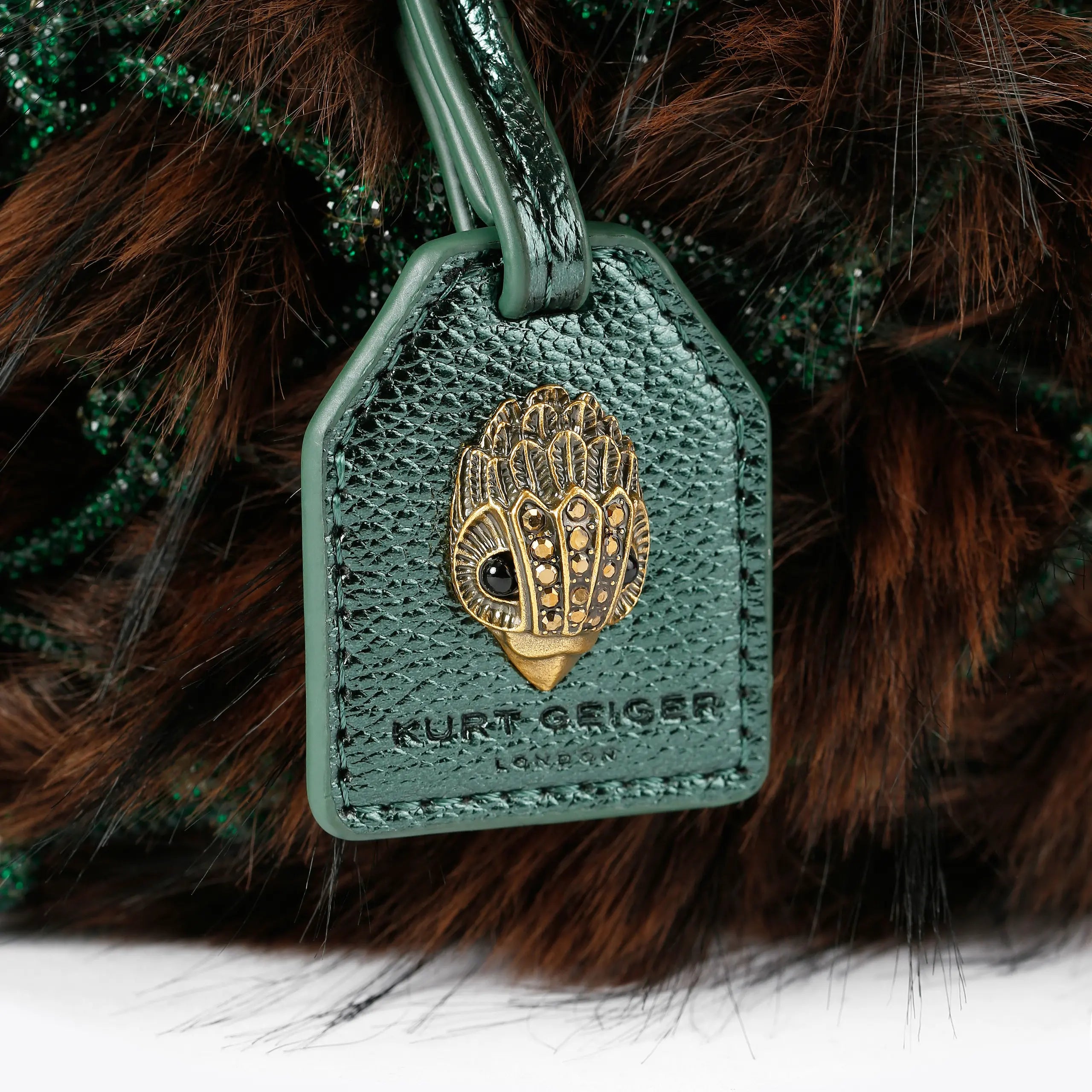 This Small Macrame crystal bag has a green crystal embellishment across the knotted structure. There is a crystal antiqued brass eagle head on the leather luggage tag.