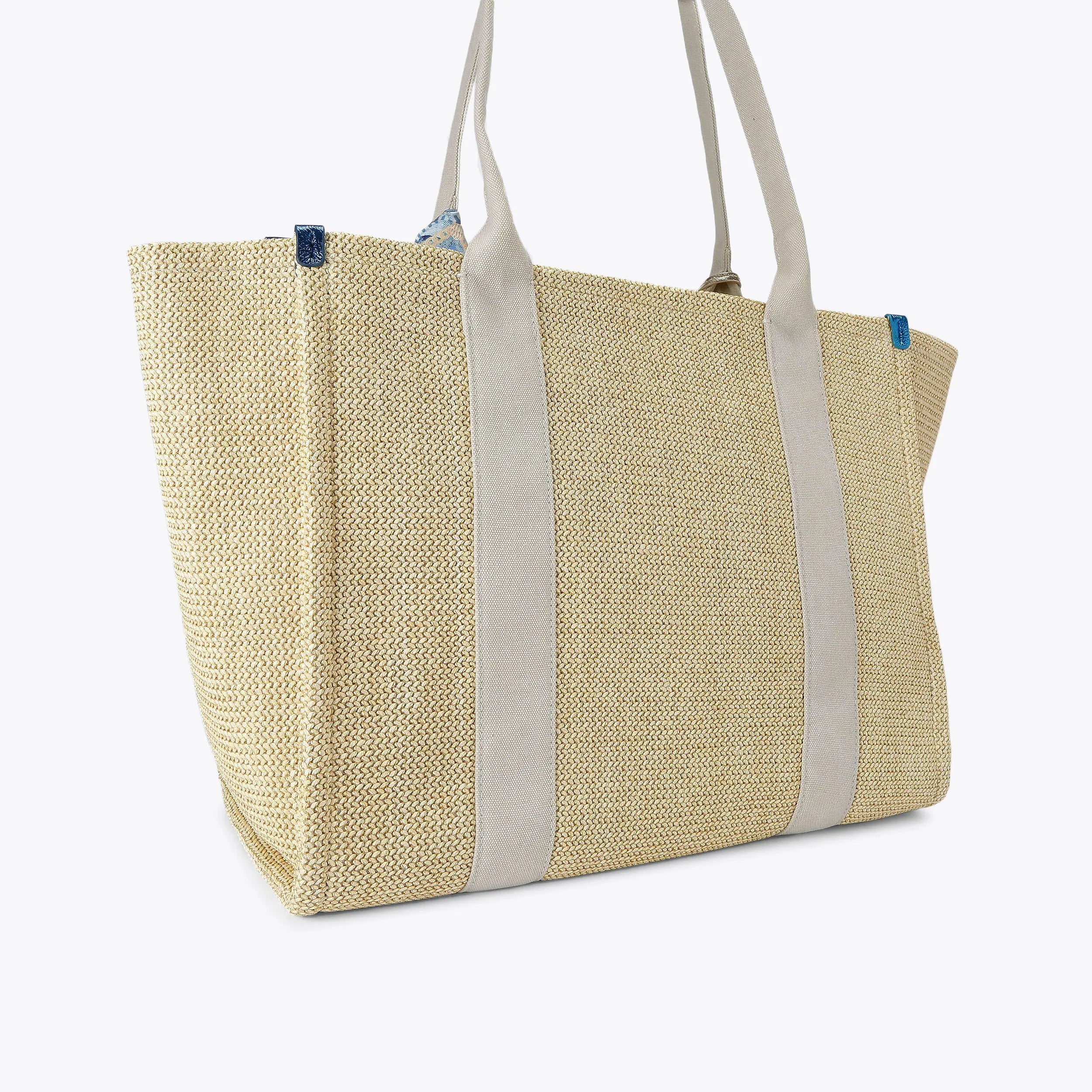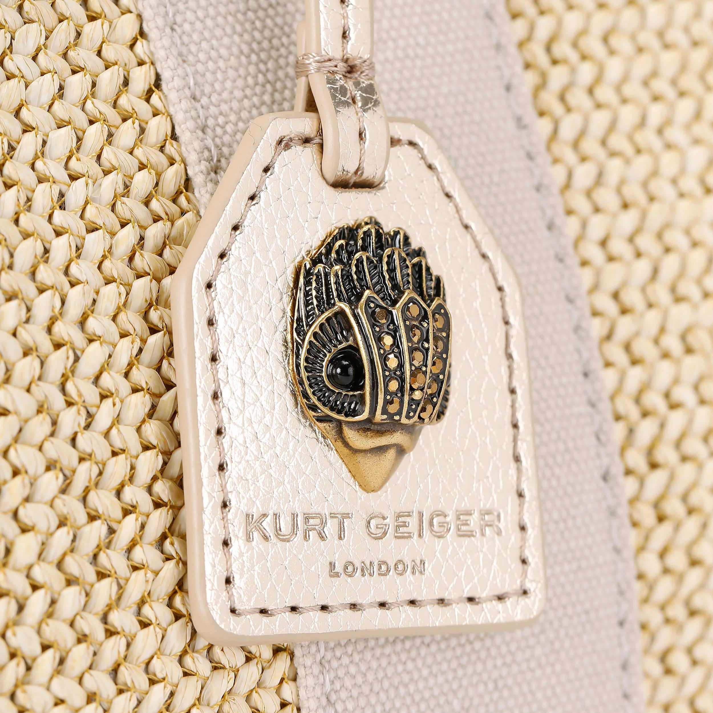 The Large Southbank Shopper purse is crafted in a beige woven fabric. There are metallic trims as well as antiqued brass eagle head with crystals on the gold tab.