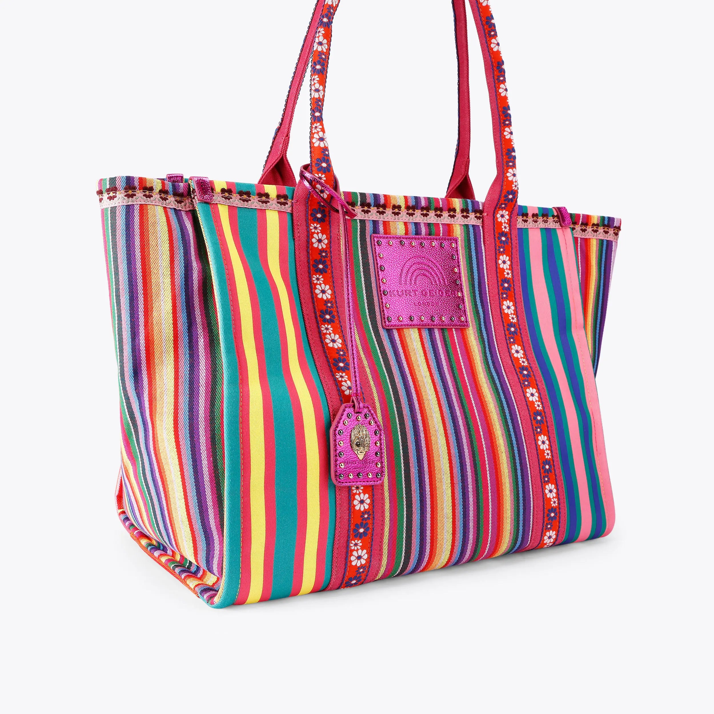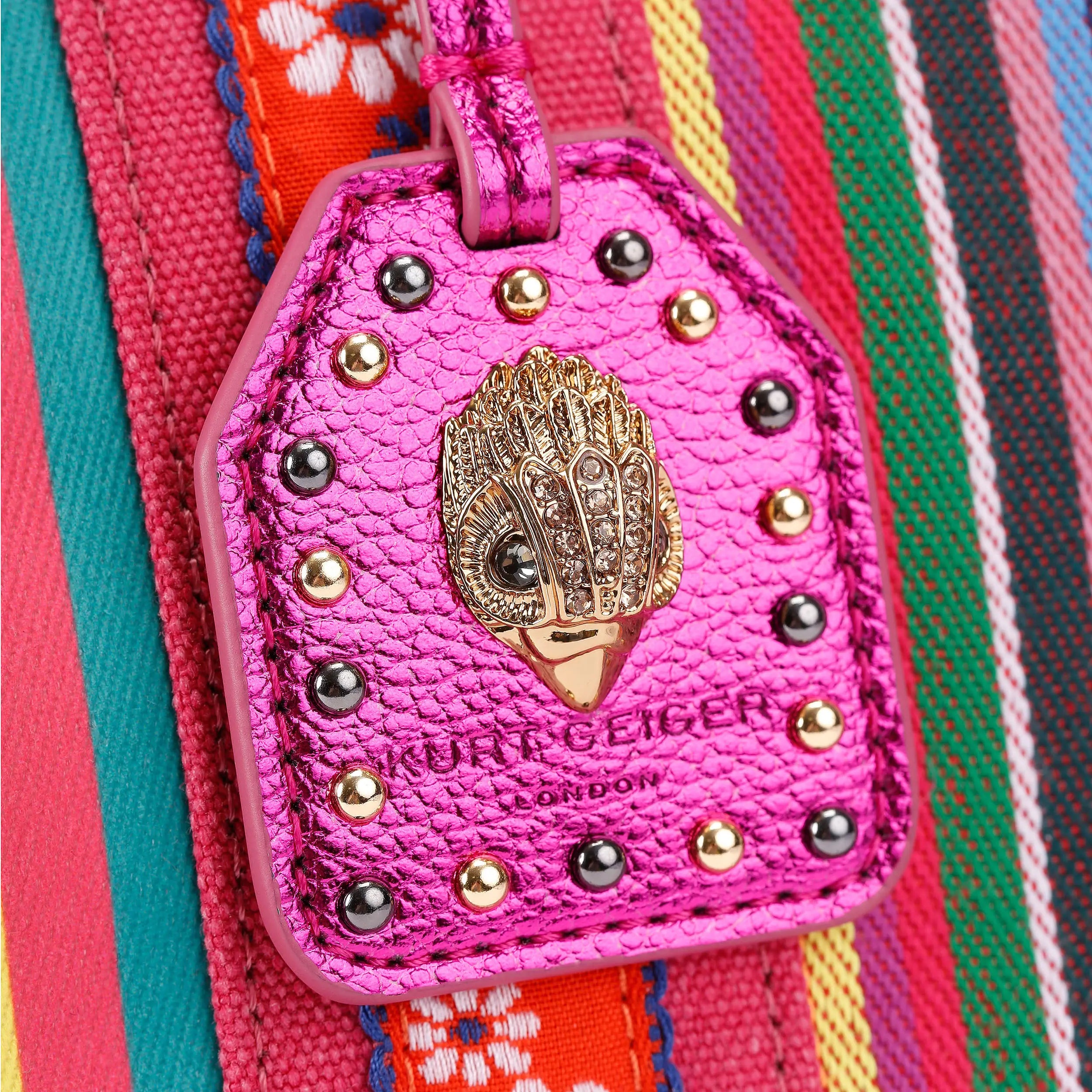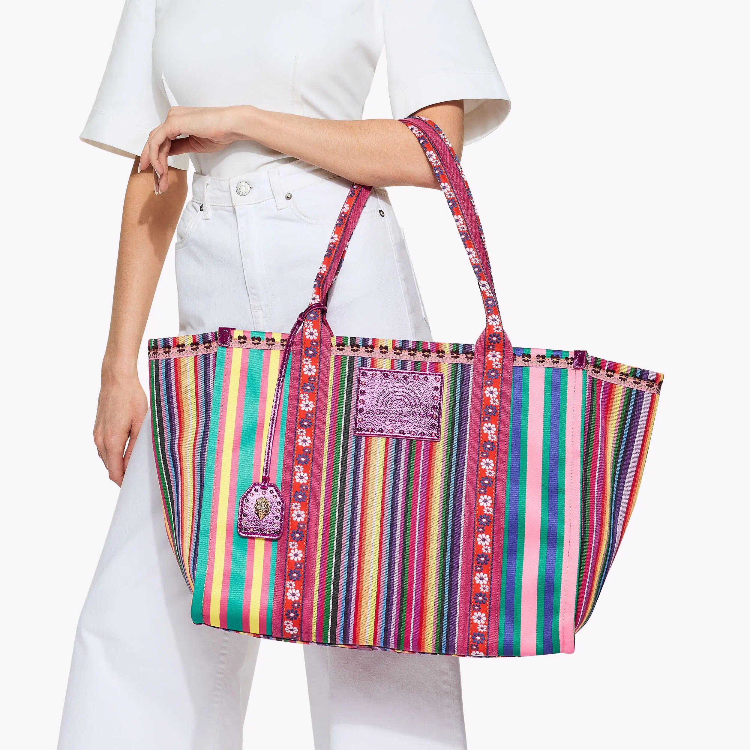 The Large Southbank Shopper purse is crafted in a striped canvas with embroidered floral design on the straps. There are multi-colour trims as well as a gold eagle head with crystals on the studded fuchsia tab.