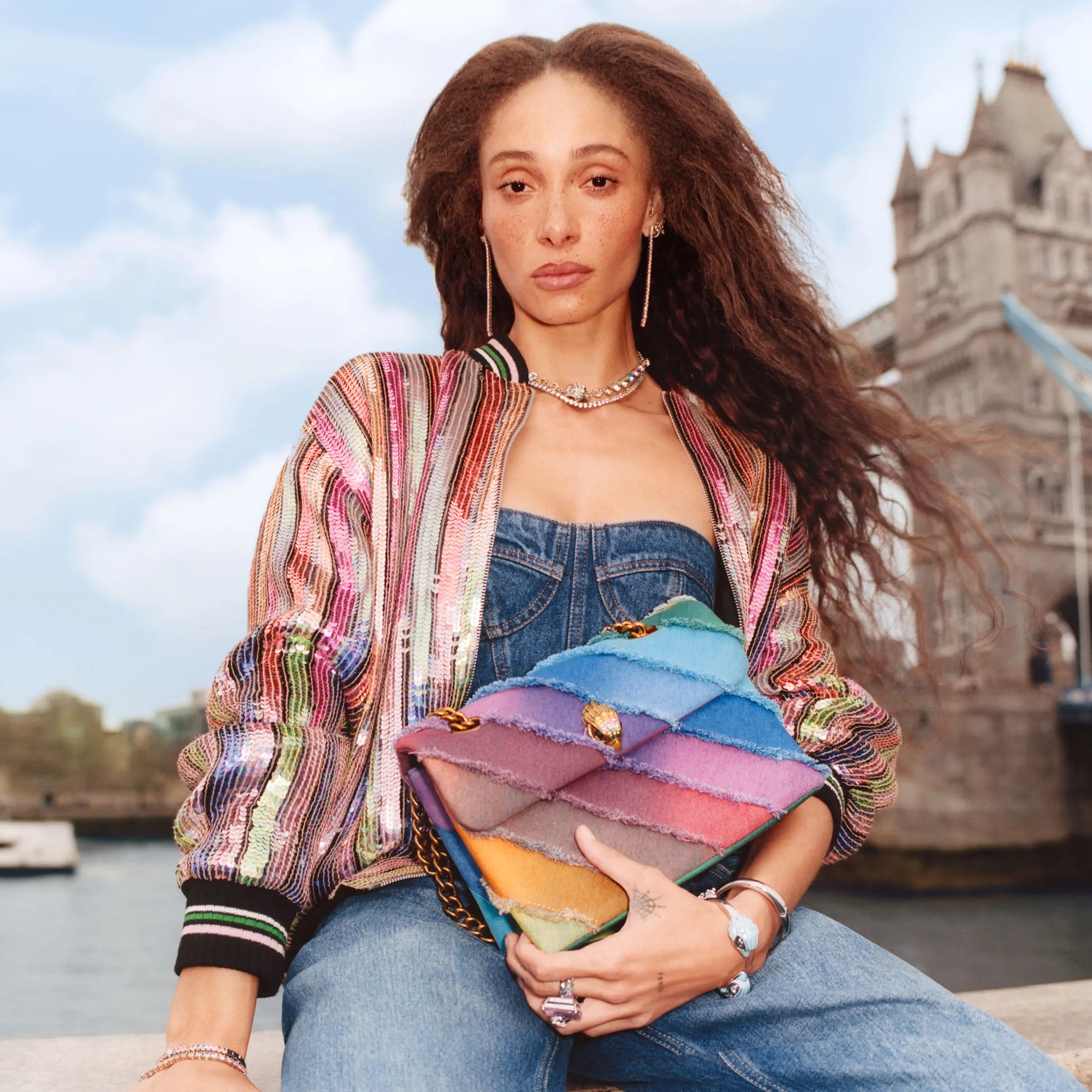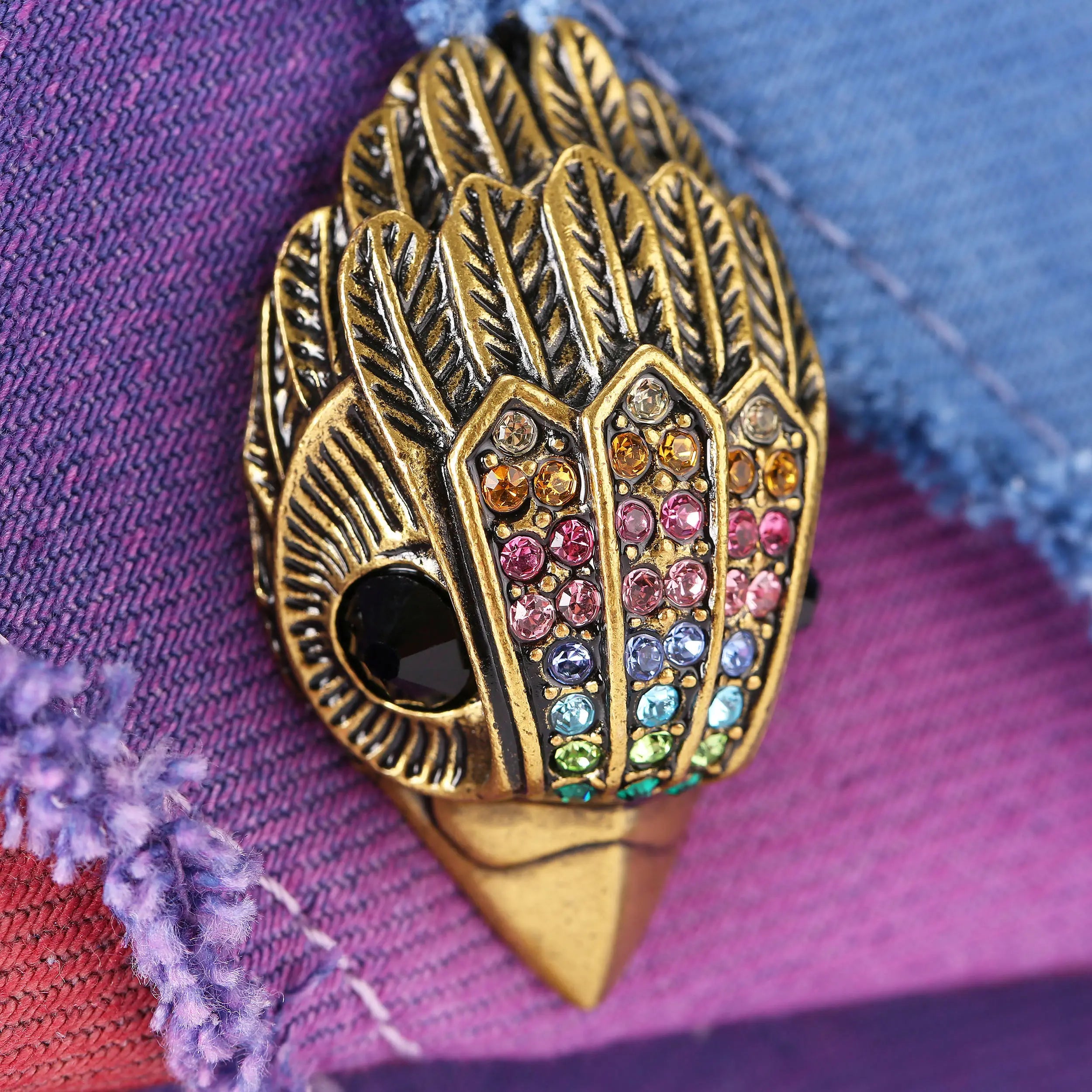 This Large Denim Kensington Purse is crafted from a denim fabric with rainbow dyed stripes and fraying details. The antiqued brass eagle head features rainbow crystals on the front flap.