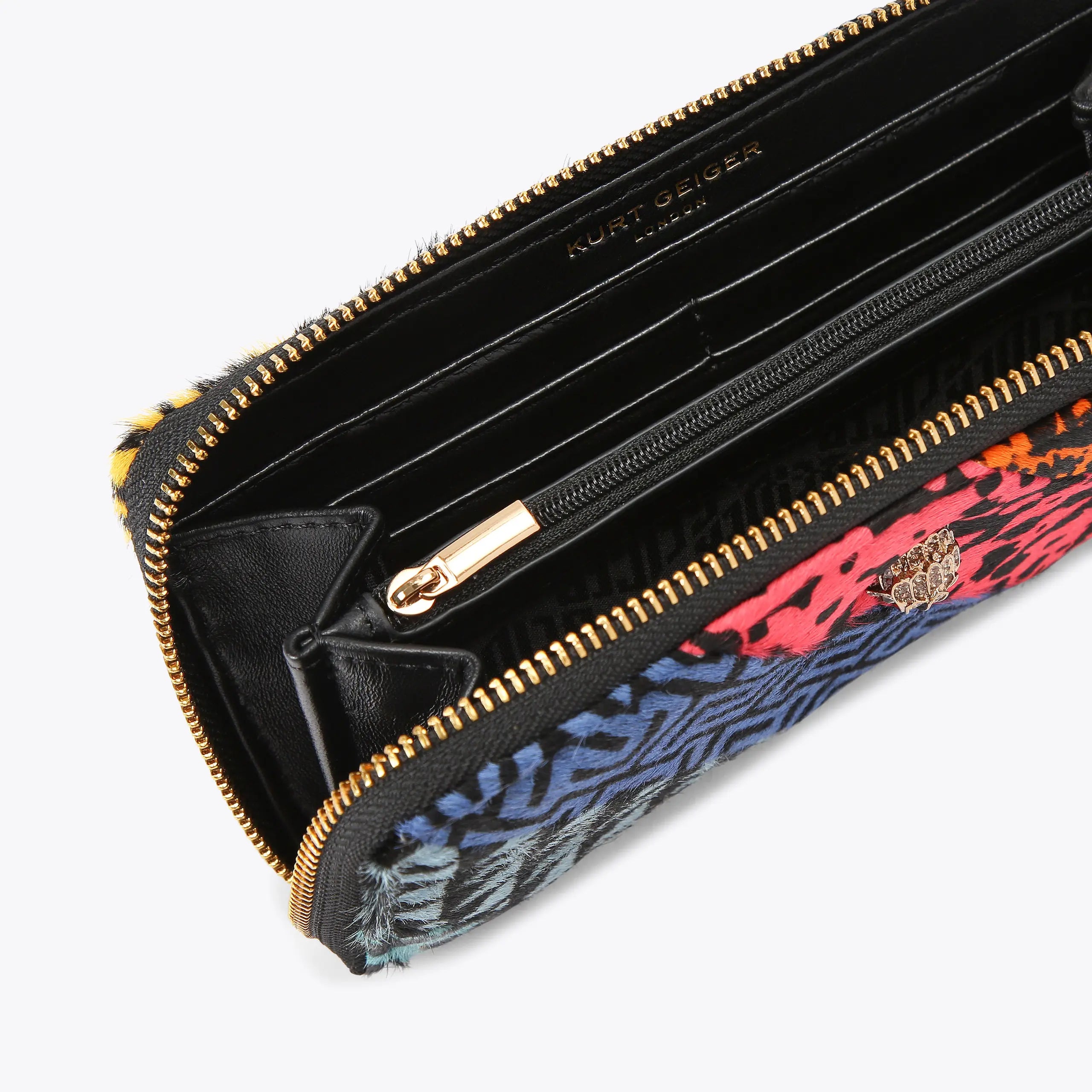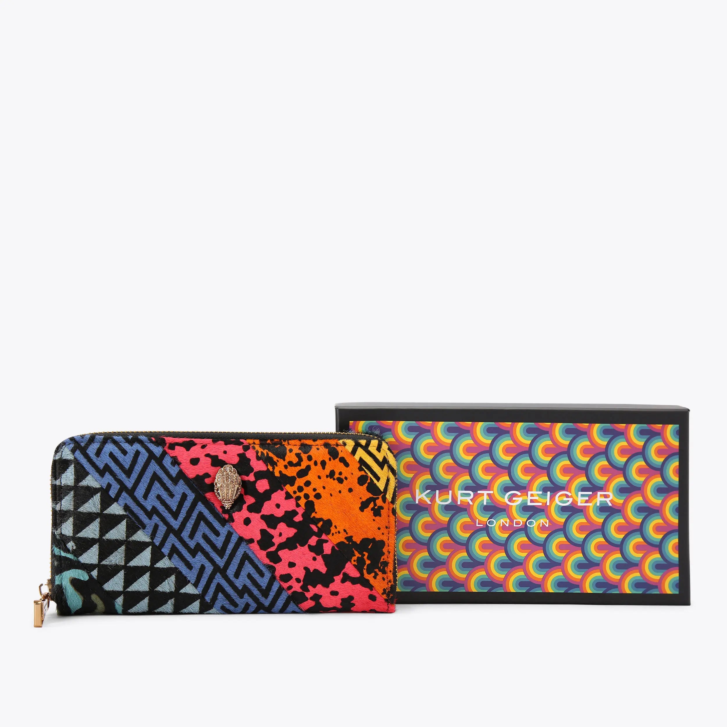 The Kensington Zip Around Wallet is crafted from striped panels of printed calfhair leather. The crystal embellished gold eagle head sits on the front.