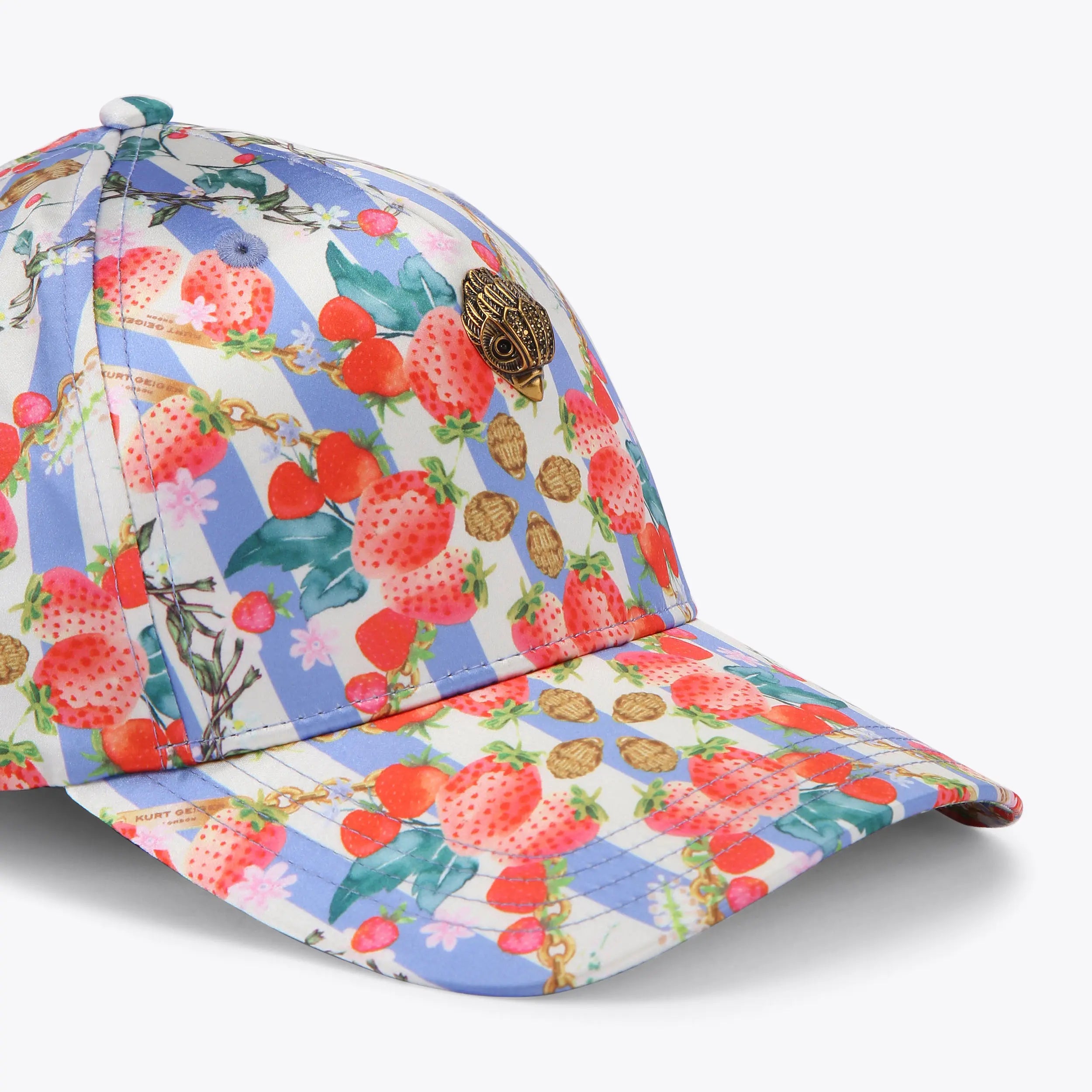 This Kensington Cap is crafted in a blue striped nylon with strawberry motifs. There is a black adjustable strap with antiqued brass push fastener.