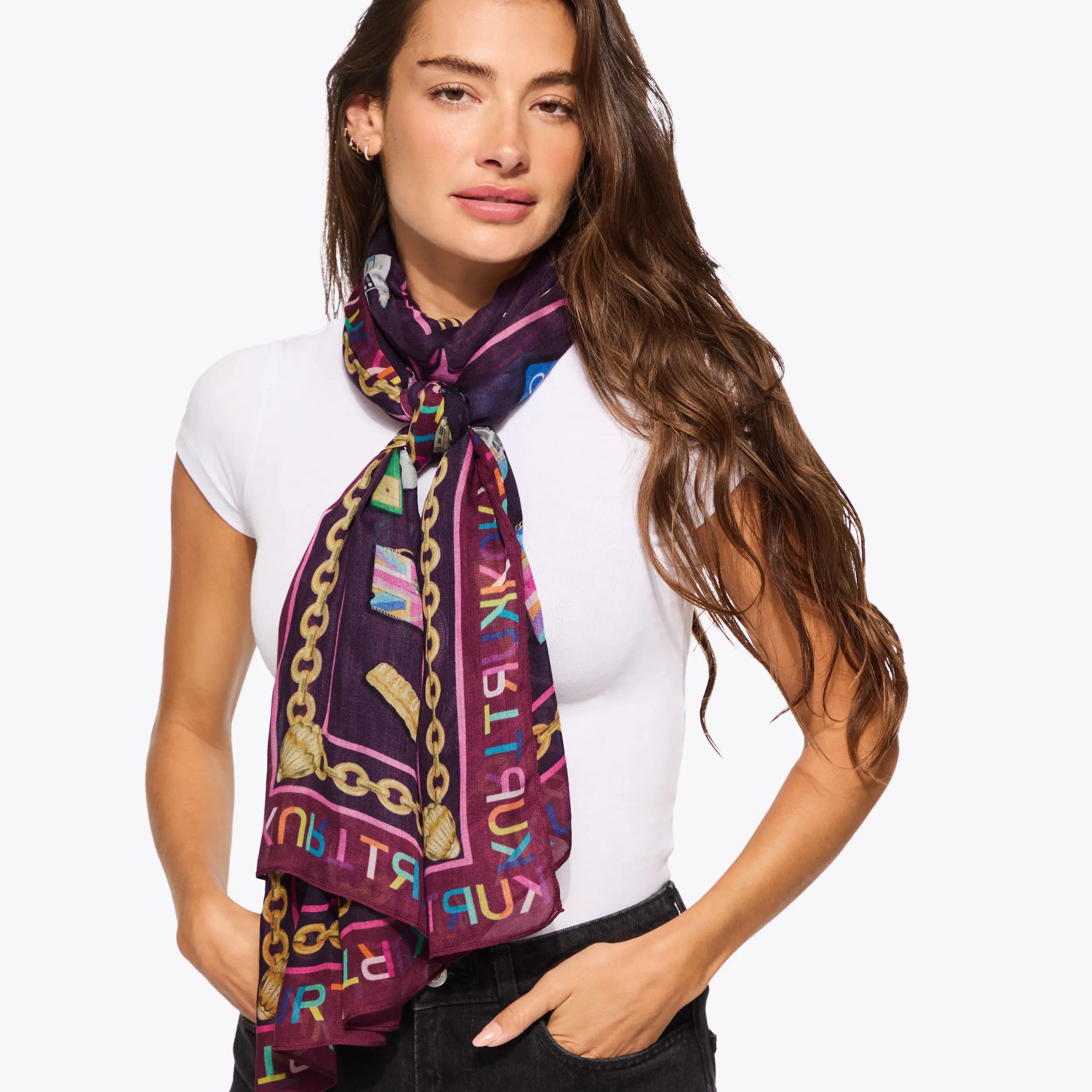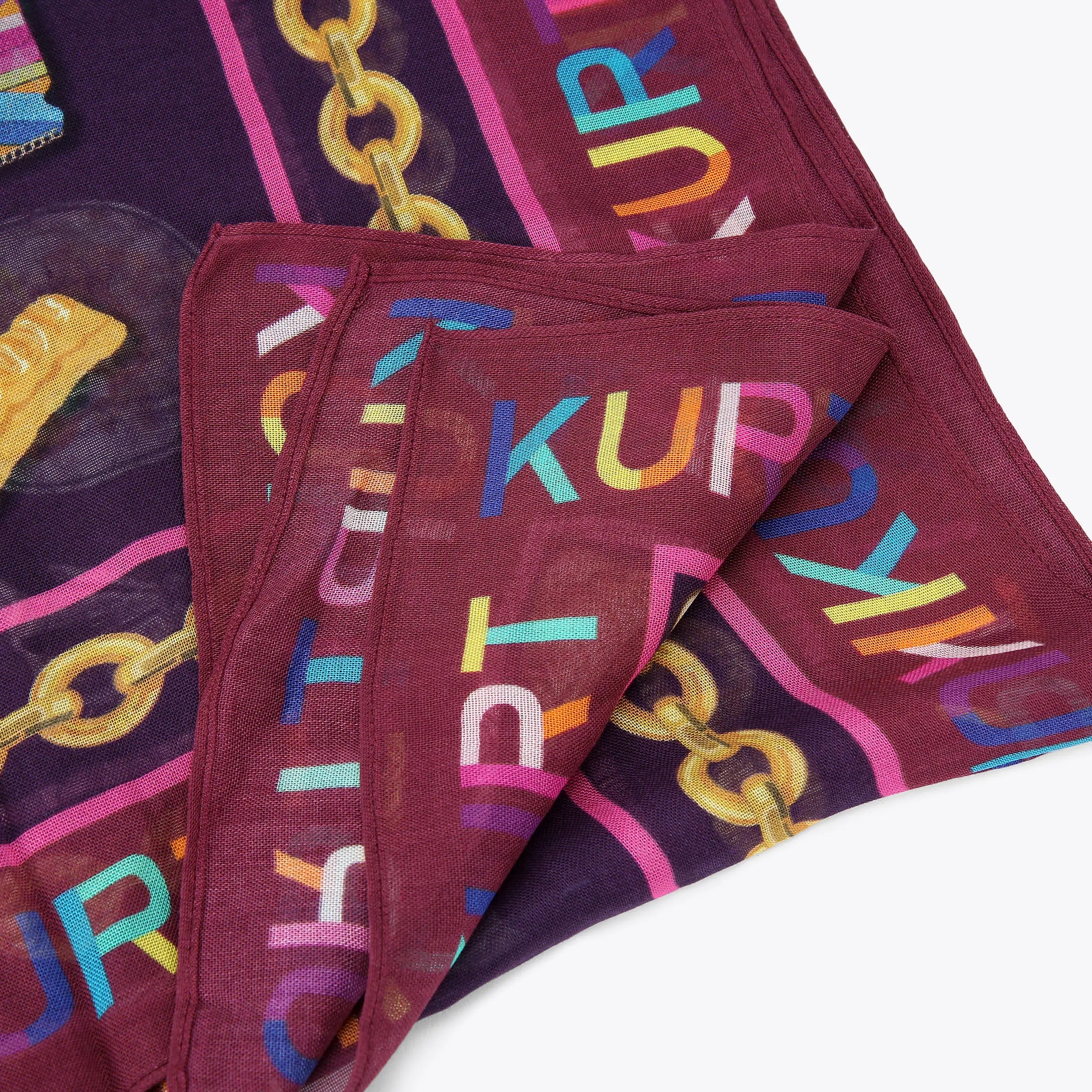 This Printed Scarf is in a oft fabric scarf that is printed with quintessentially British items including Big Ben, telephone box and a Kensington Bag. The edge is trimmed with multi-colour branding.