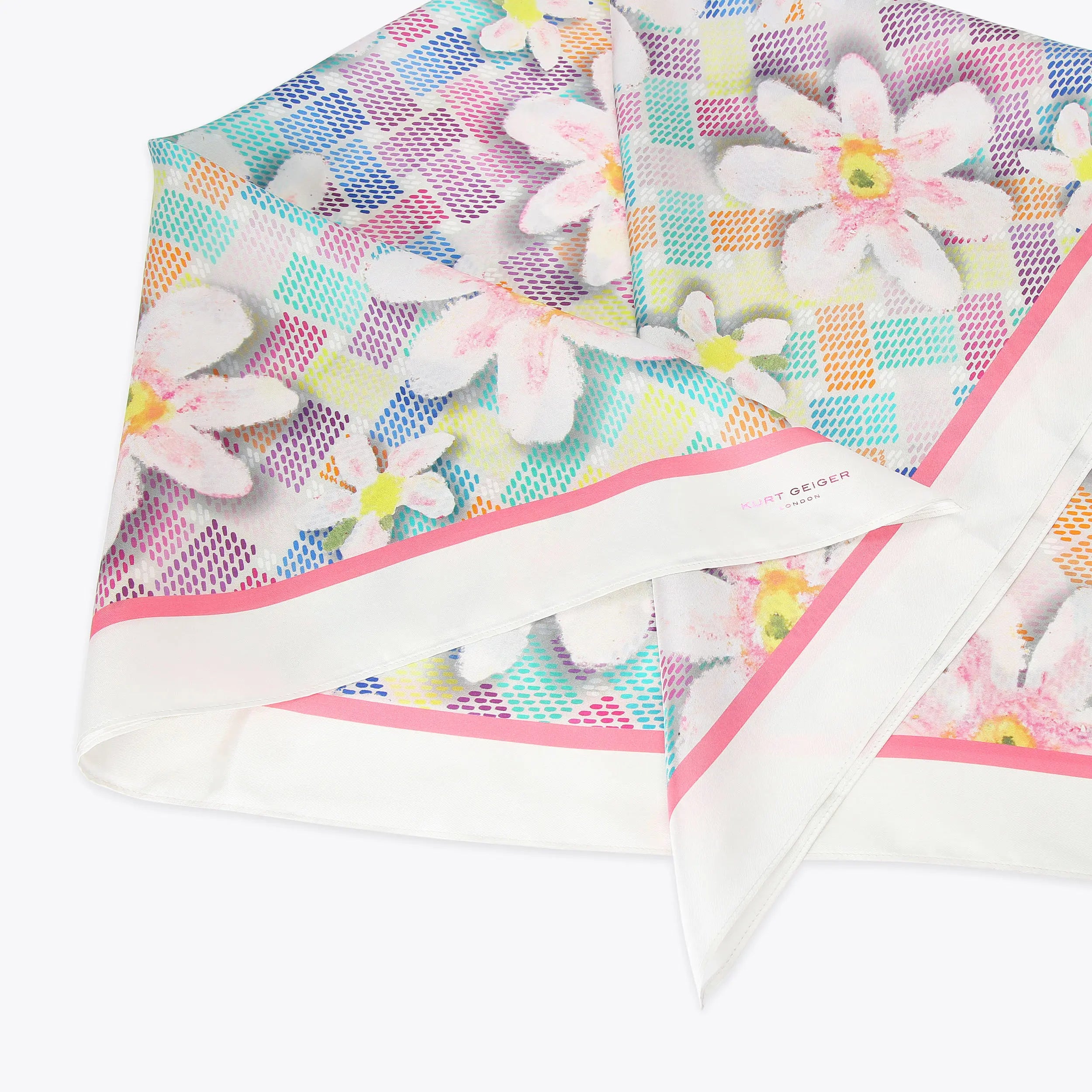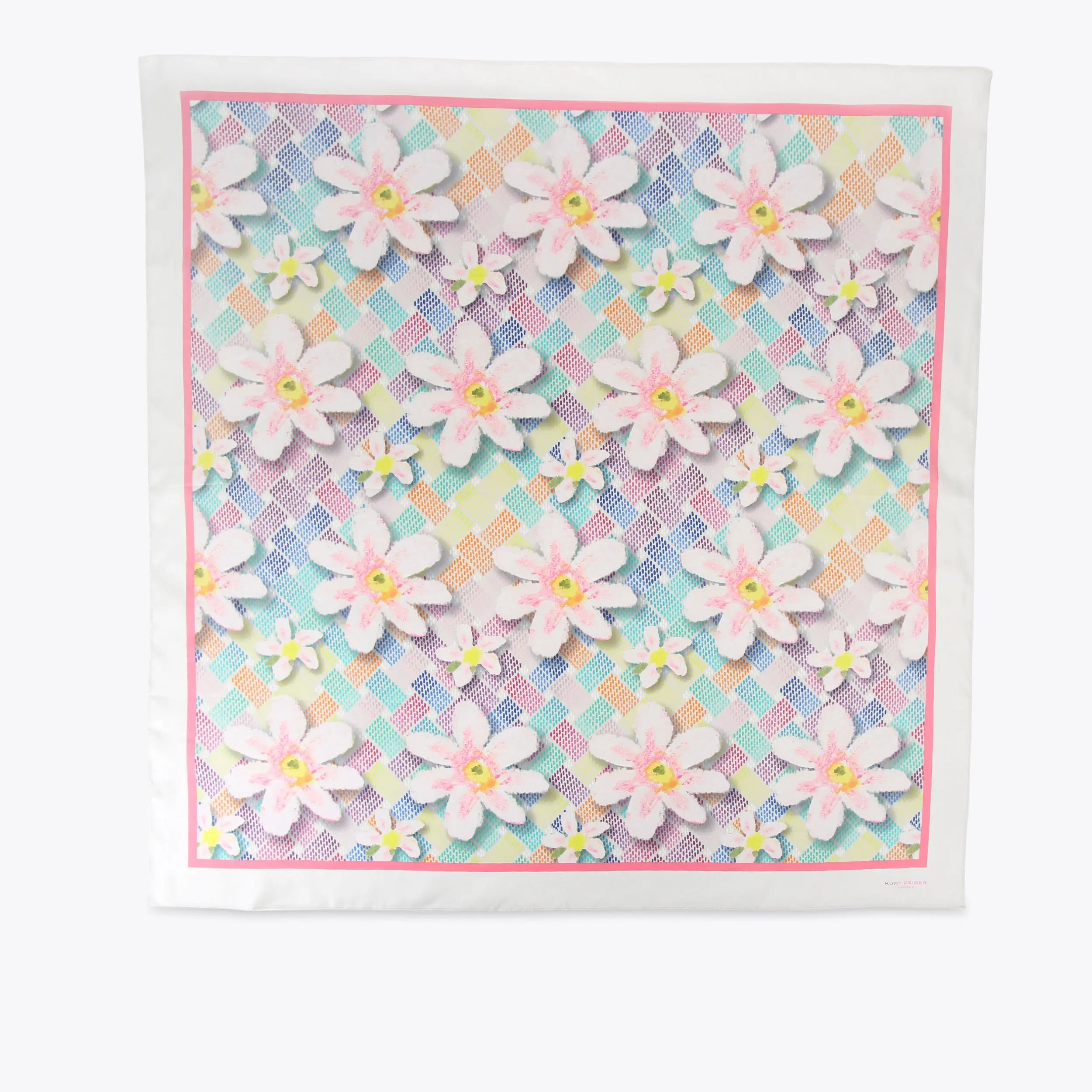 This Large Square Scarf features a rainbow monogram with hand-drawn style floral design printed onto a white silk fabric. There is subtle metallic pink branding in the corner.
