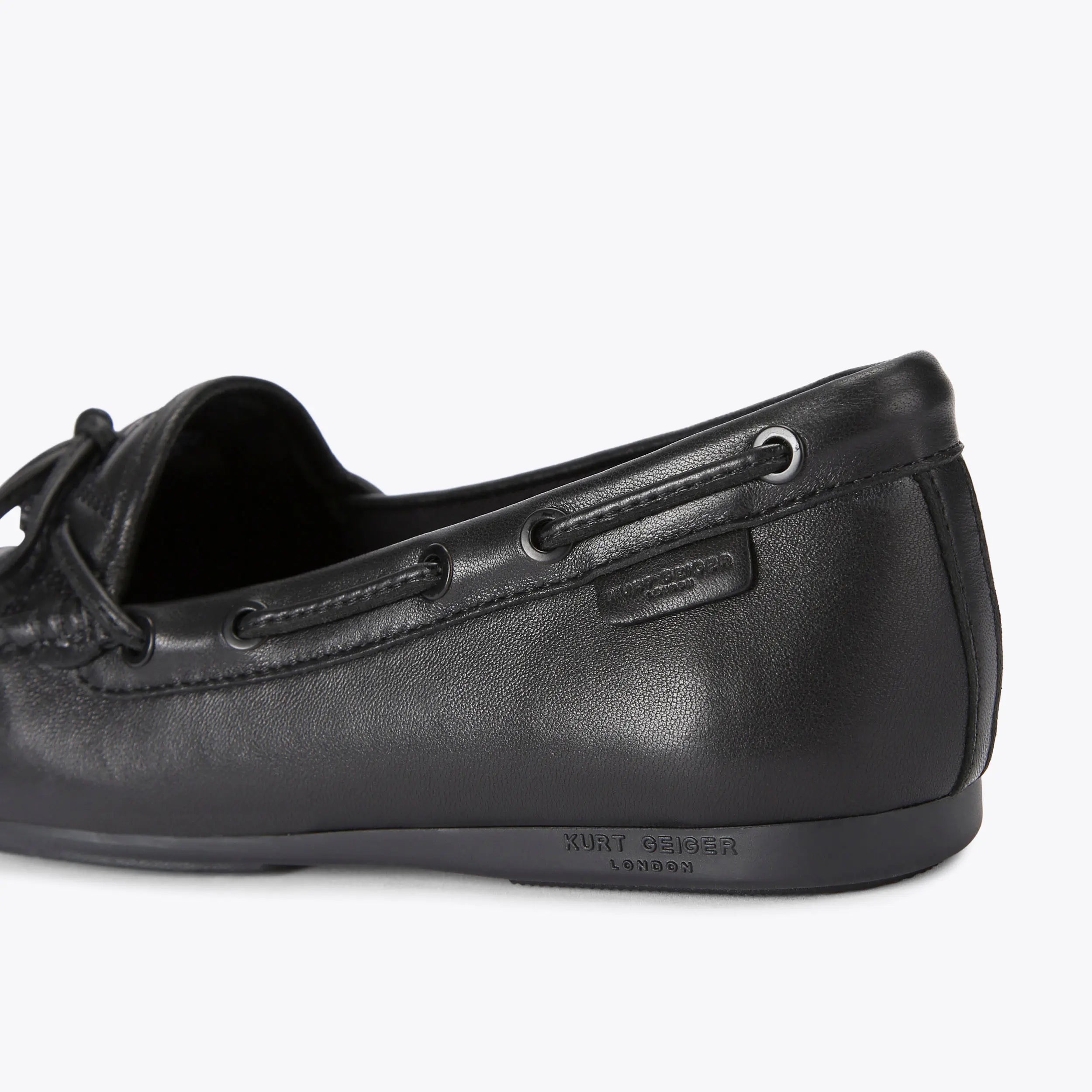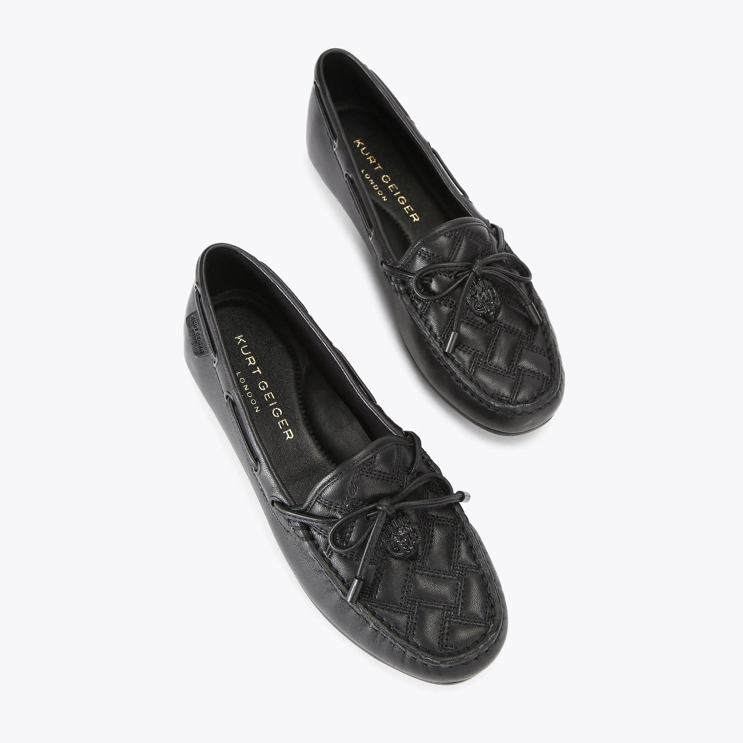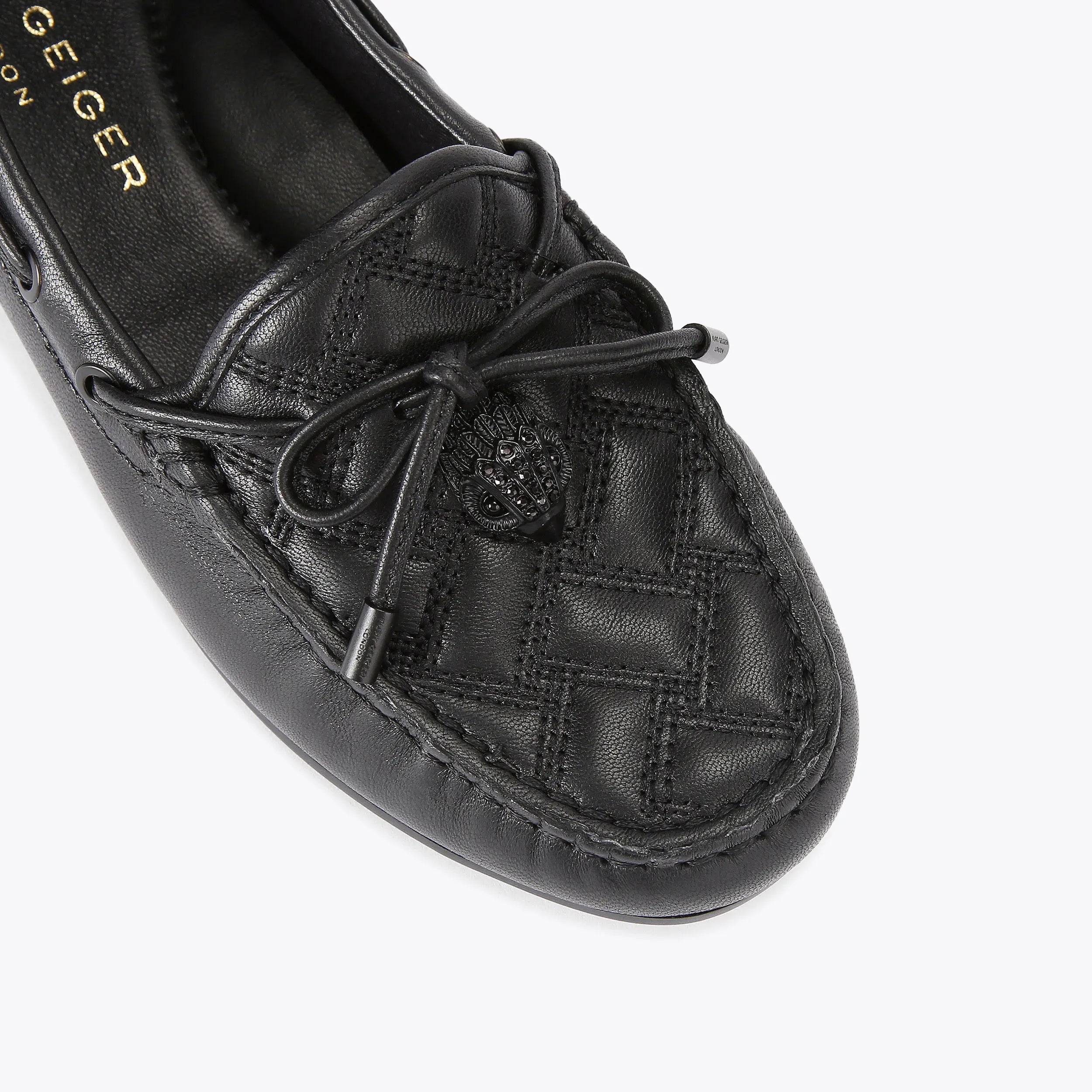 The Eagle Moccasin is crafted from a black leather in an all drench design. The toe features an overstitched quilt and a black eagle head.