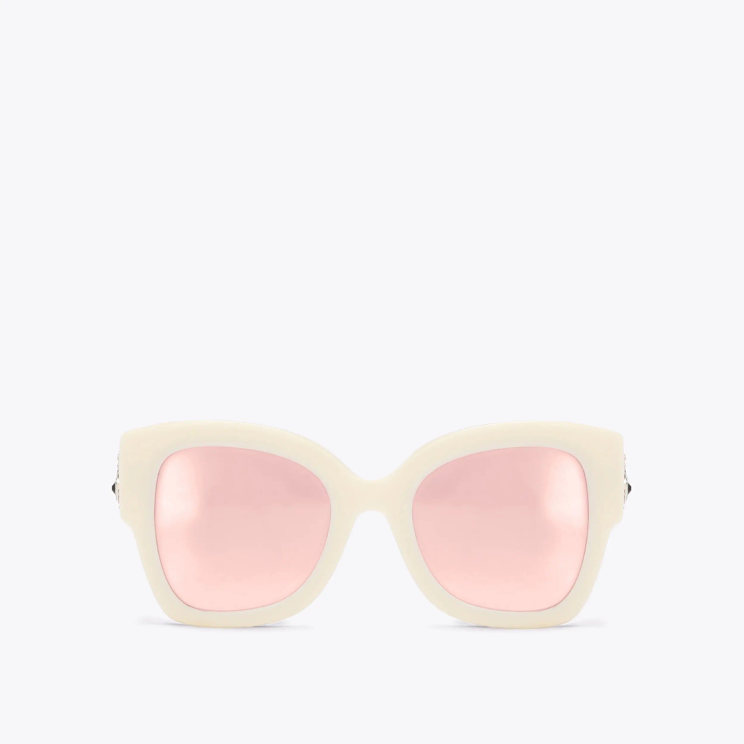 This pair of Square Eye Butterfly sunglasses feature blush reflective lenses with bone temple tips. The arms feature an evil eye motif.