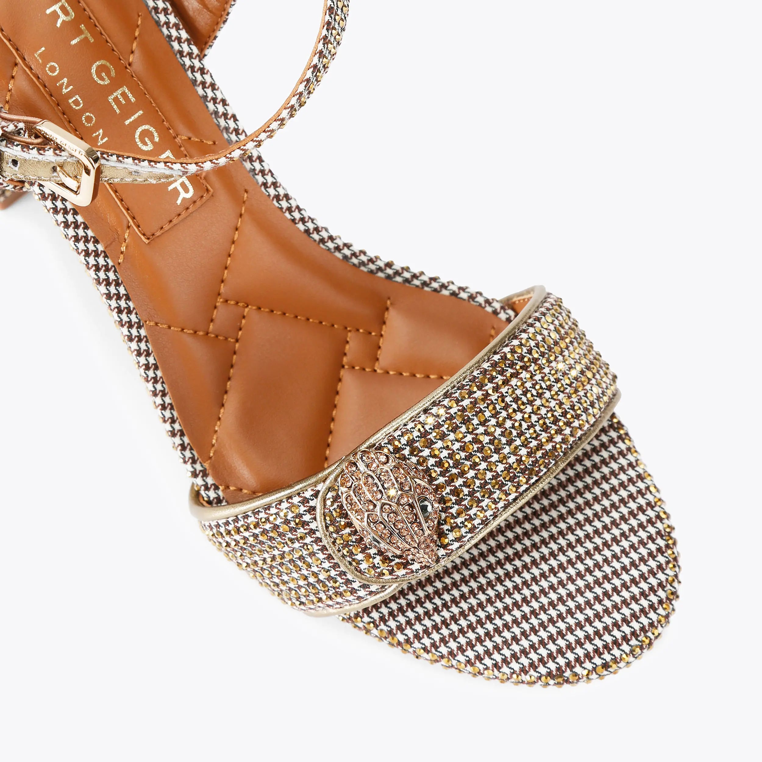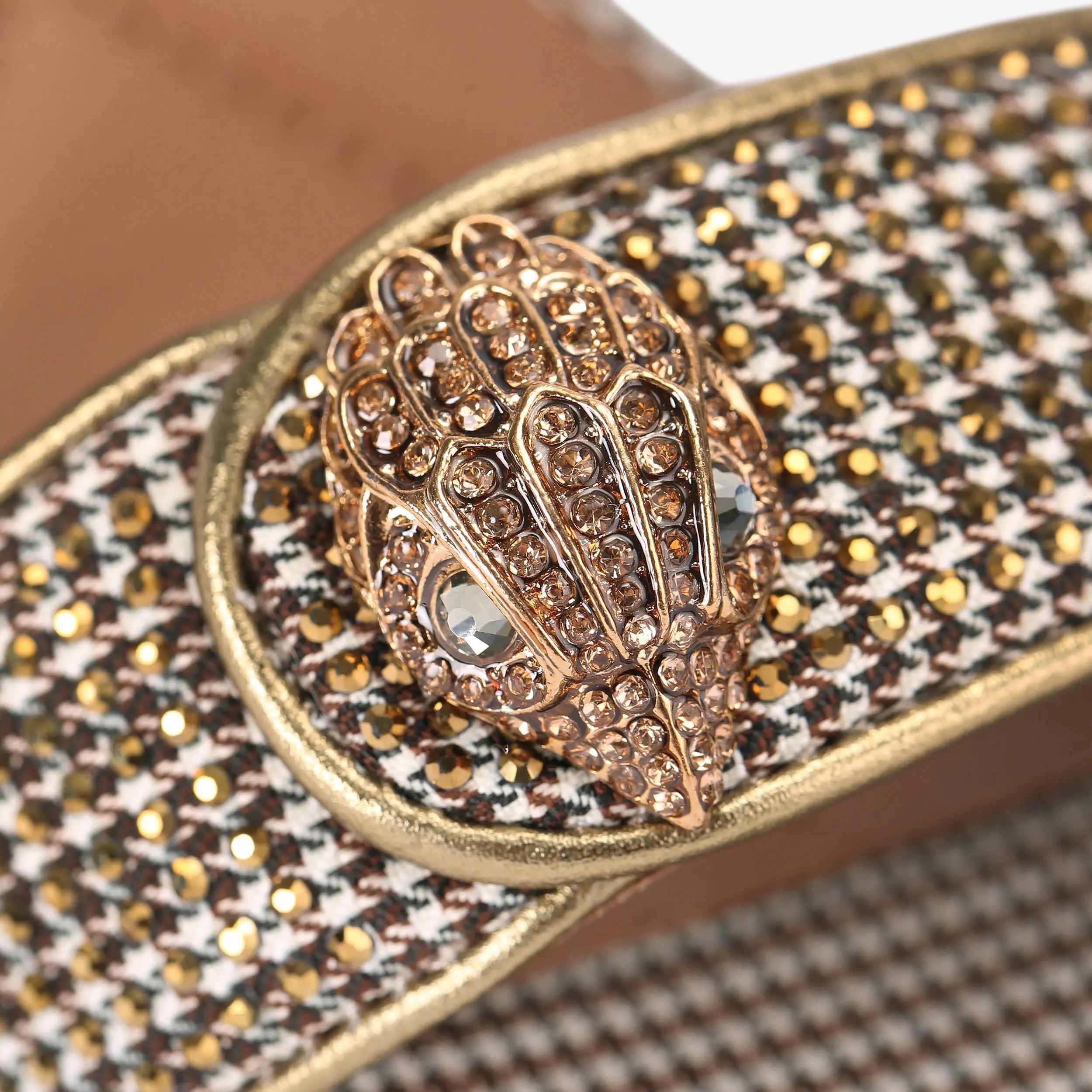 The Kensington Langley sandal arrives in a houndstooth fabric with adjustable ankle strap. The toe strap is topped with an antiqued brass eagle head.