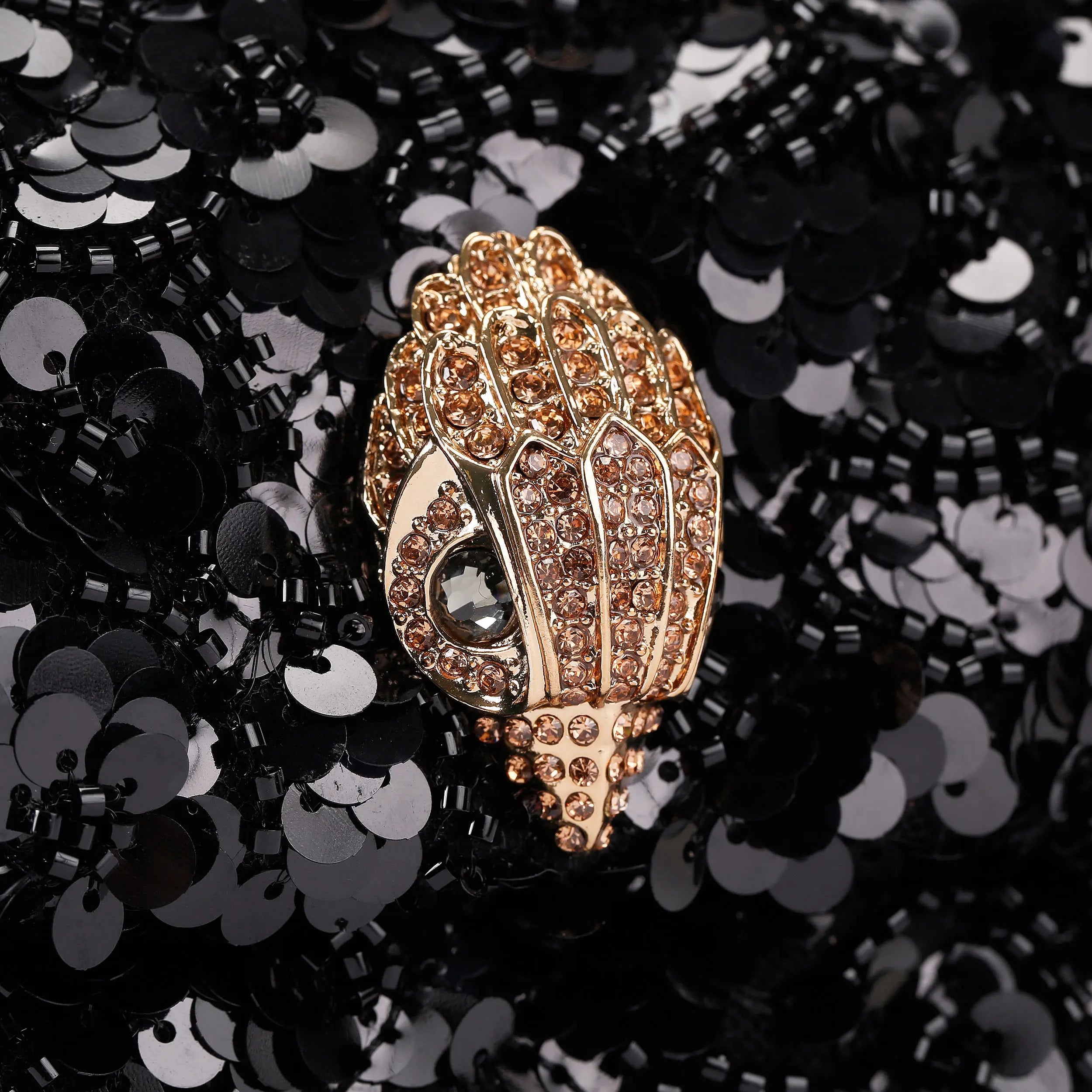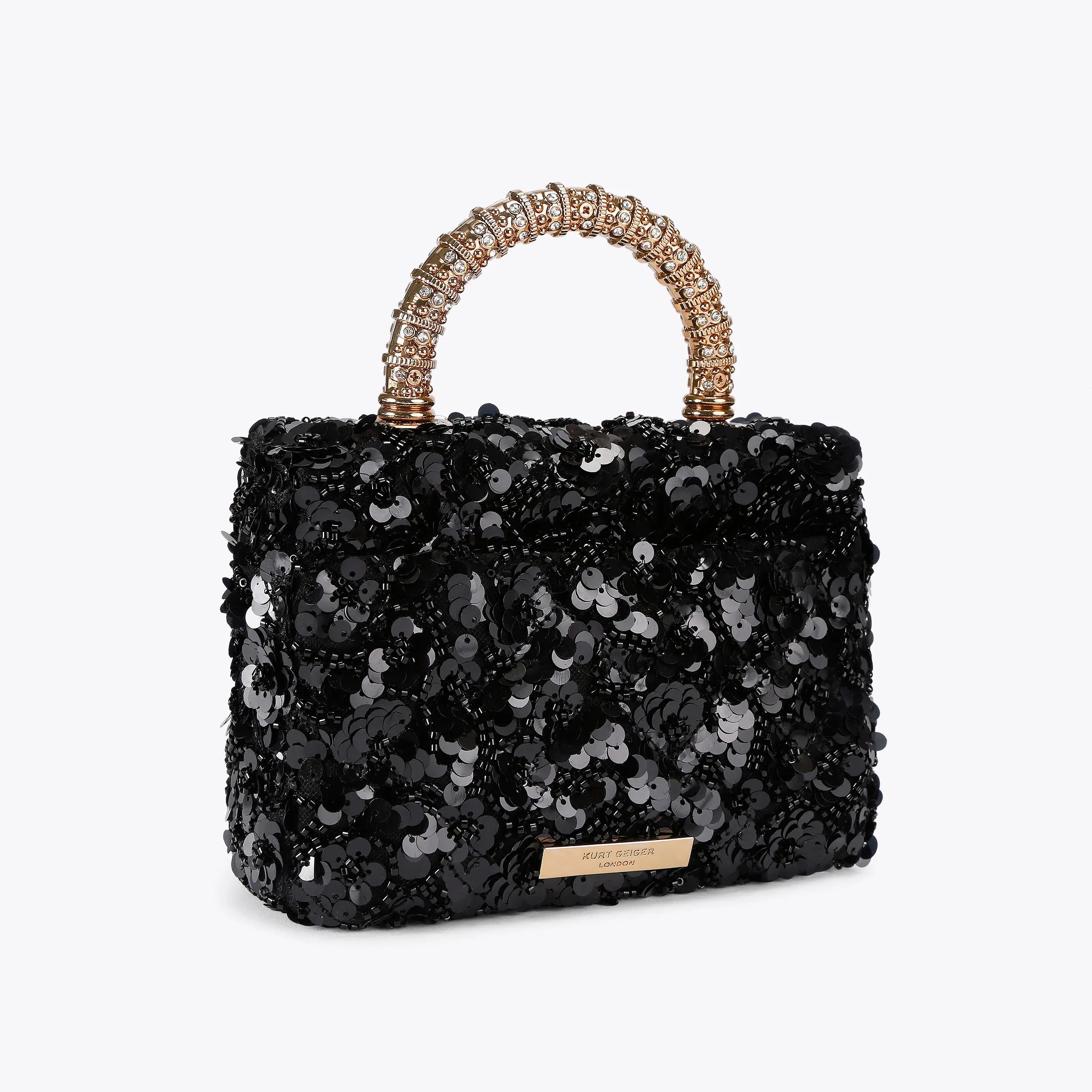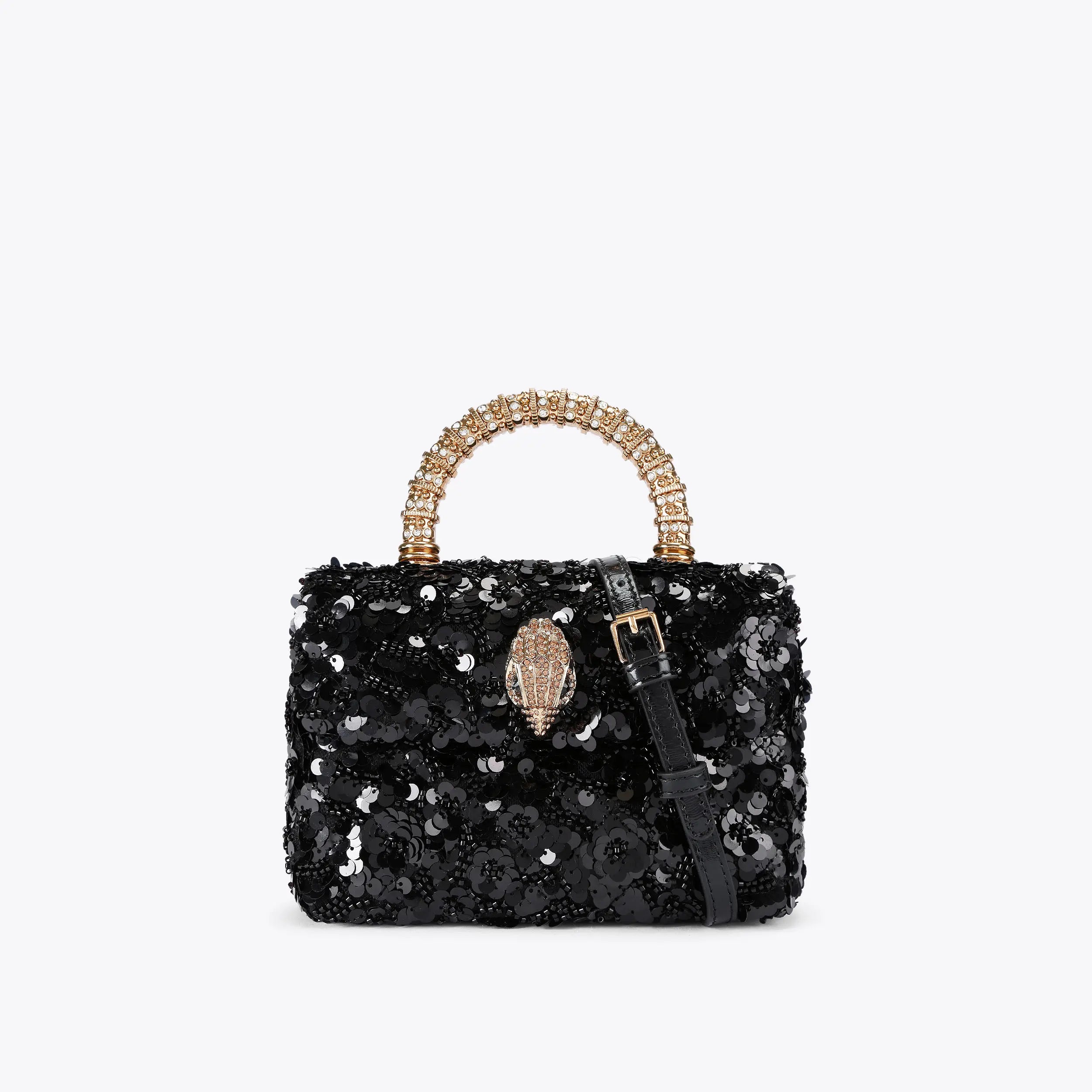 This Mini Kensington Top Handle bag features a black sequin exterior. There is a flat pocket on the back a gold crystal eagle head on the front flap. This bag can be worn across the body or held with the crystal embellished top handle.