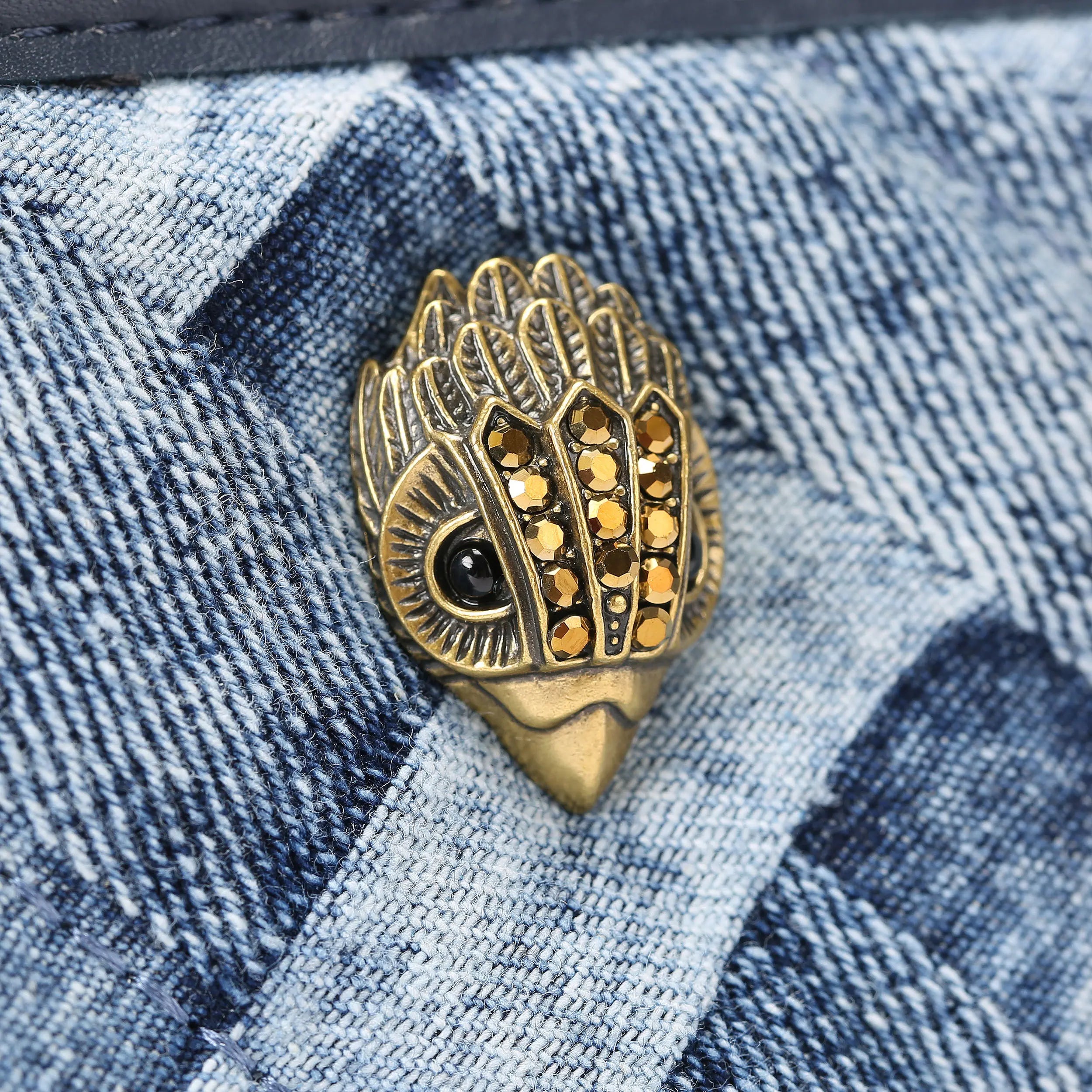 The Micro Kensington Square Tote features a denim exterior with bleached weave design. The antiqued brass eagle head features crystals on the front.