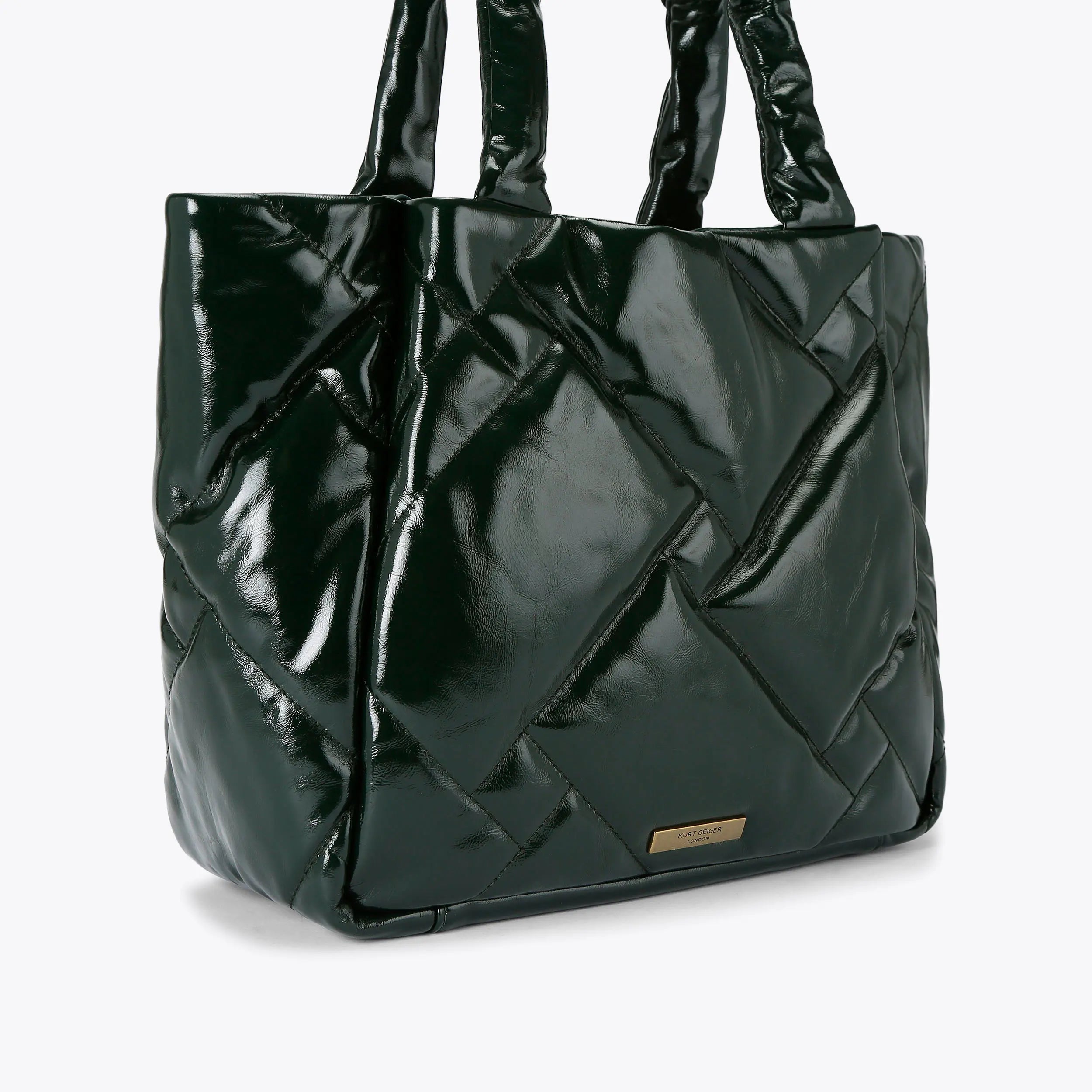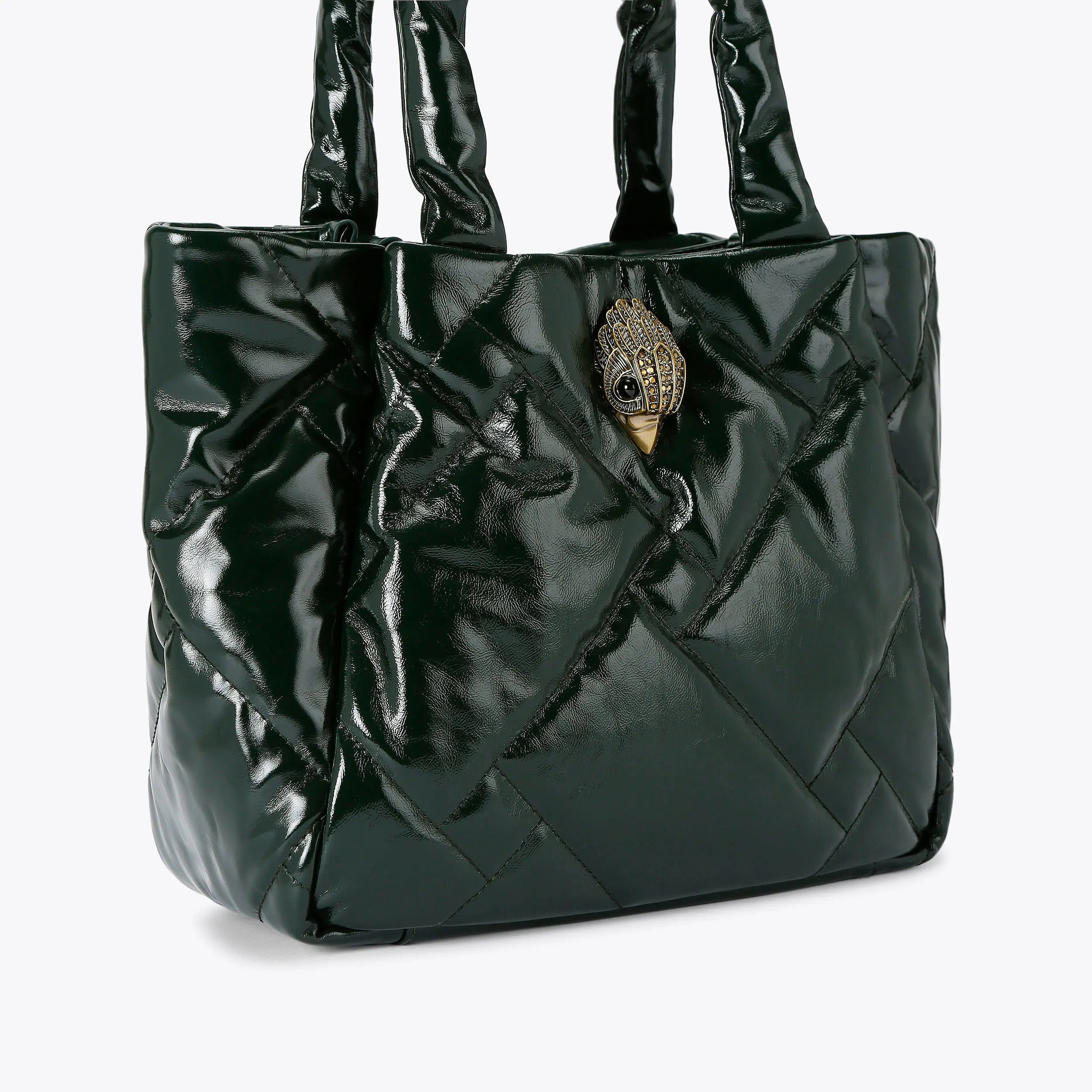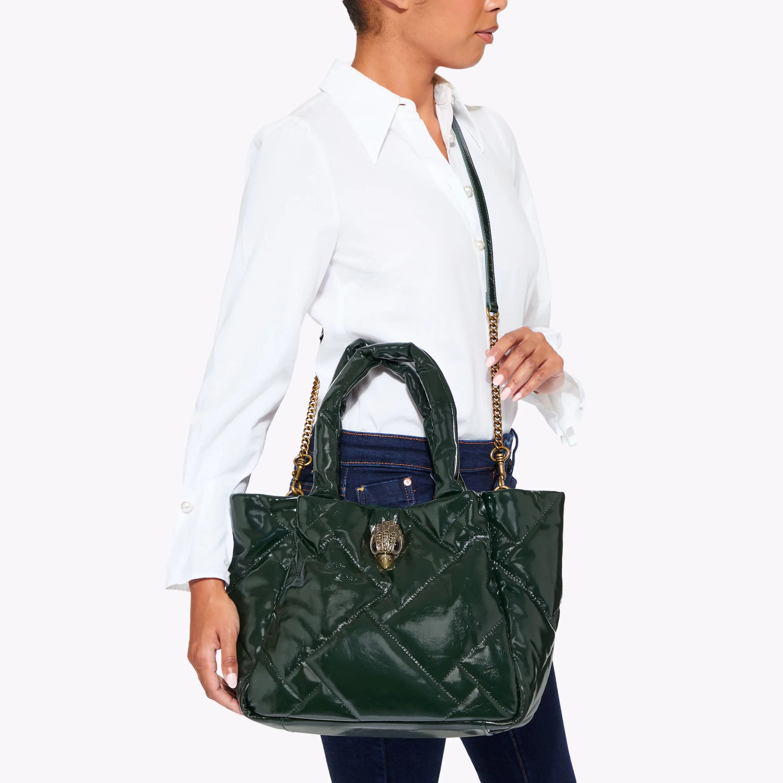 This Medium Kensington Puff Shopper purse comprises of three compartments. The exterior features the iconic Kensington weave with a large antiqued brass eagle head on the front.
