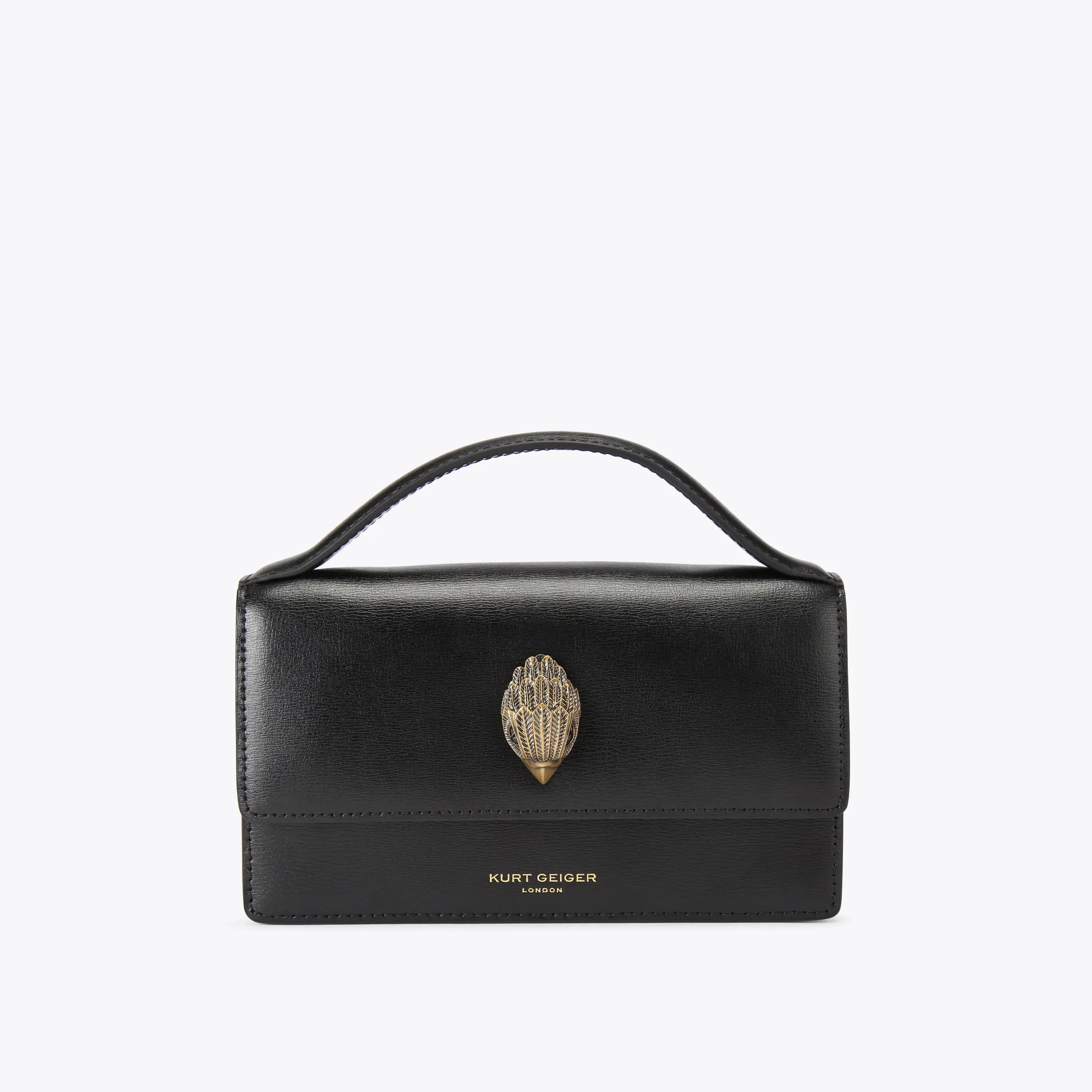 The Small Bond Top Handle Purse is made from a textured leather in black. There is an antiqued brass eagle head which sits on the front flap and embossed branding below.