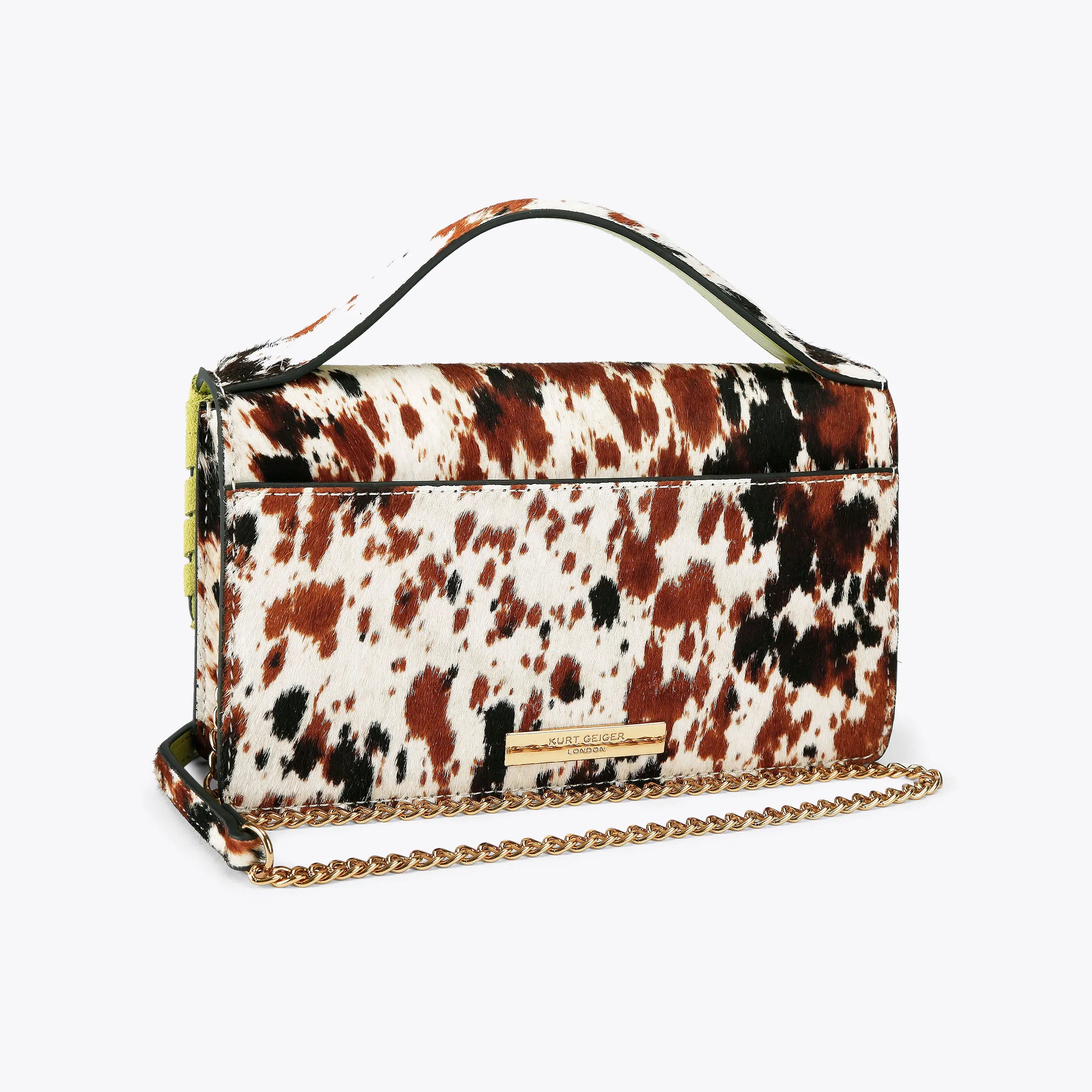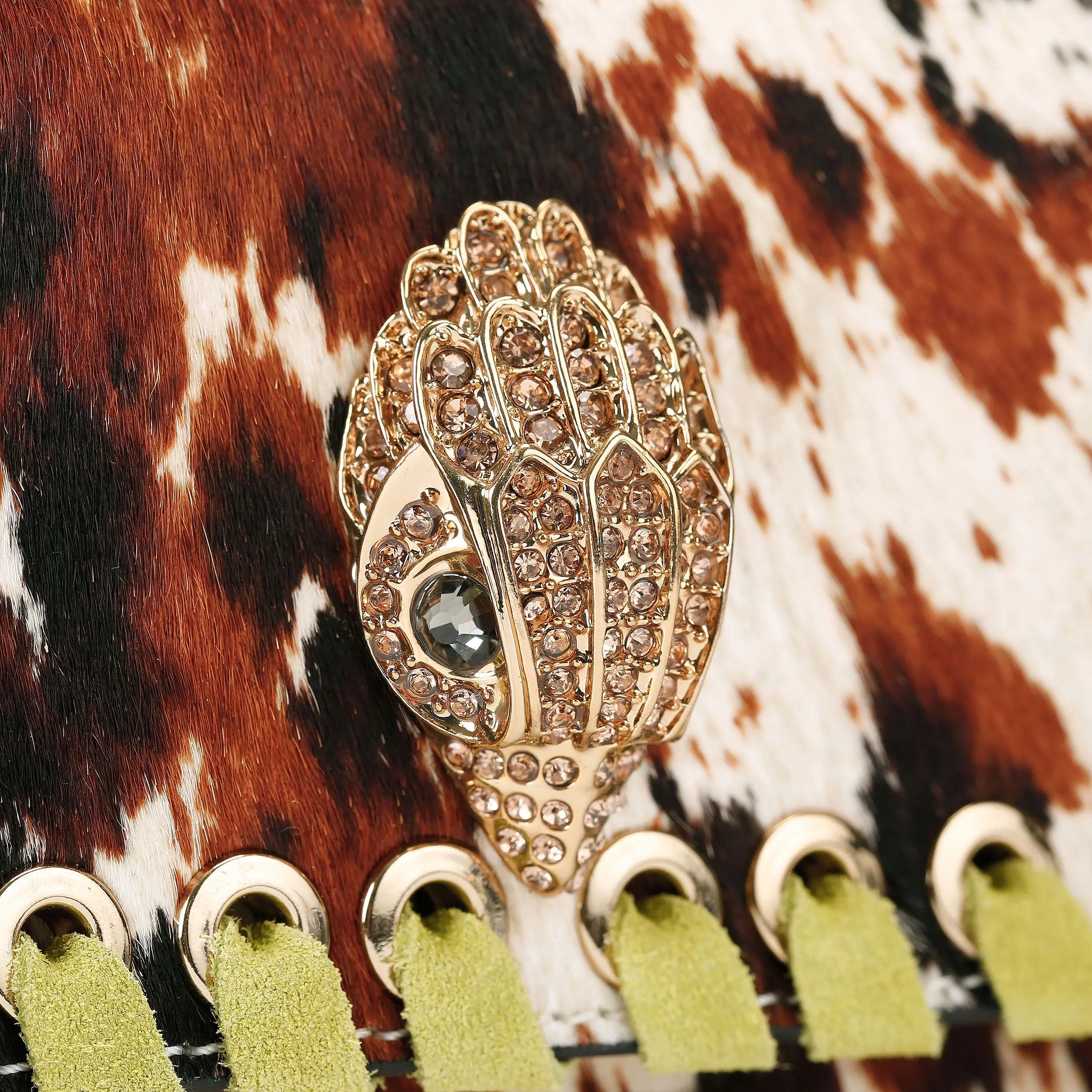 The Small Bond Top Handle Purse is made from a brown calfhair leather. There is a gold eagle head which sits on the front flap and embossed branding below.
