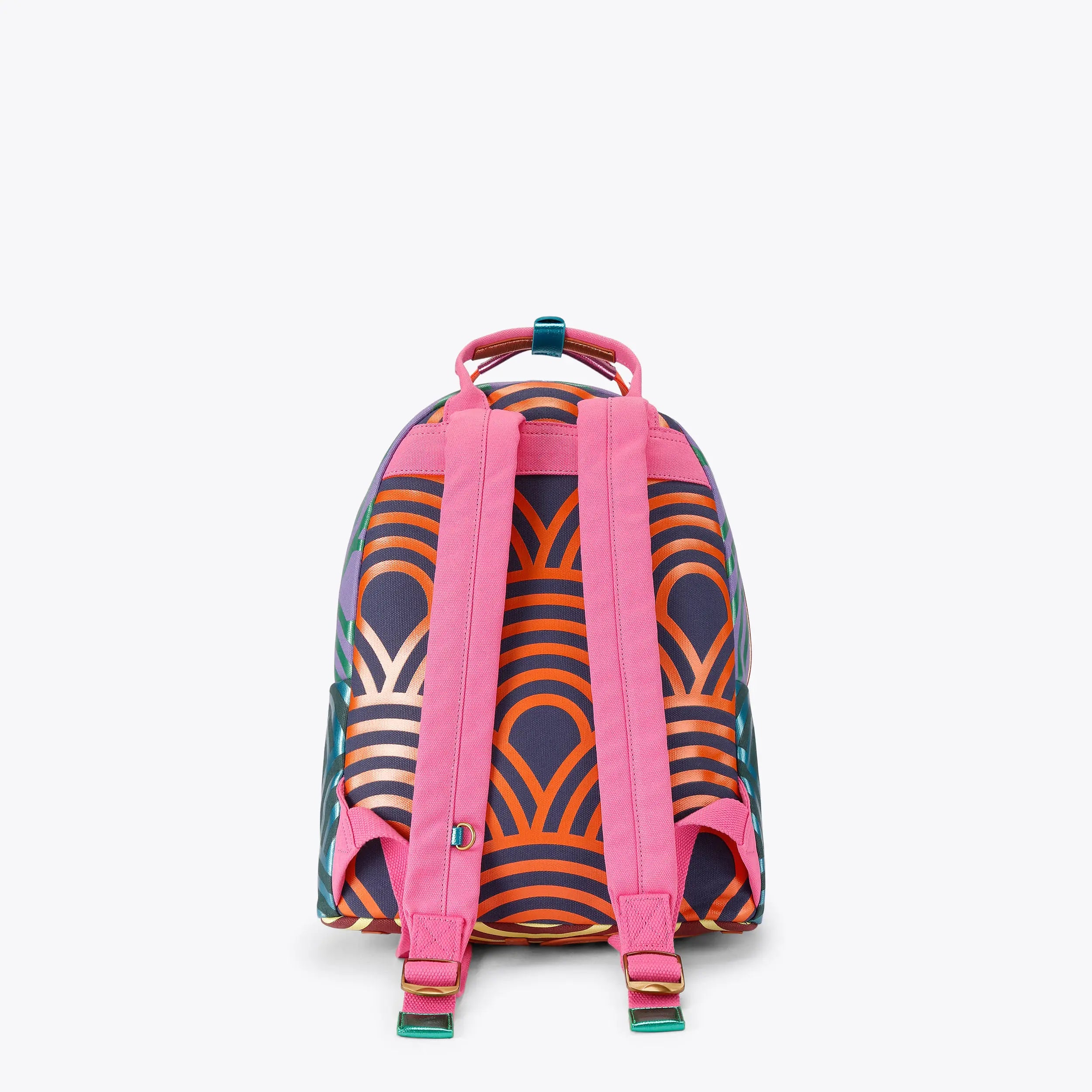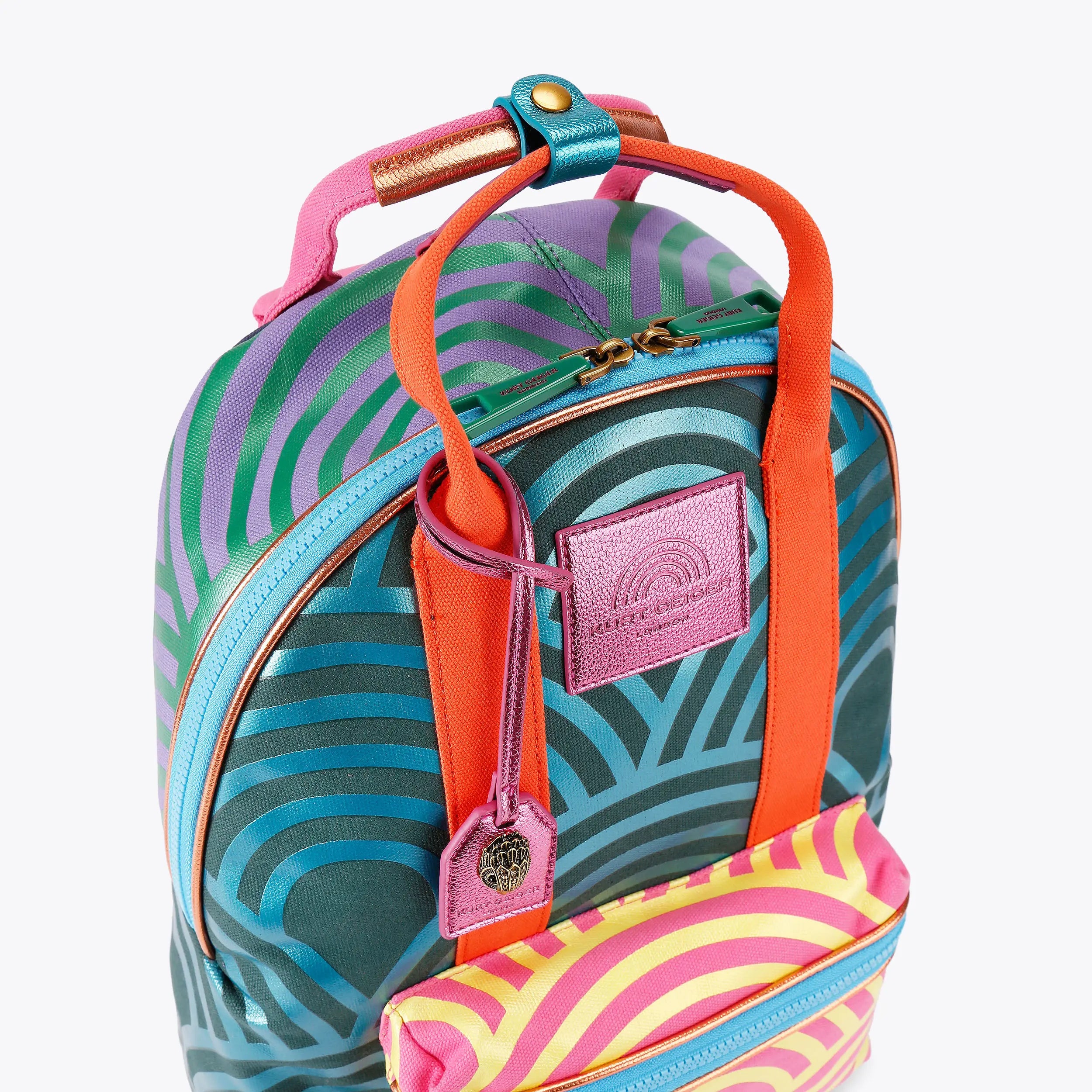 The Large Southbank Backpack is crafted in a rainbow striped canvas. There are metallic pebble grained trims as well as zipped pocket on the front.
