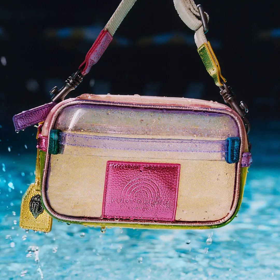 The Small Vinyl Southbank Camera purse features a rainbow glitter vinyl exterior. There are metallic multi-colour trims which coordinate with the 'KURT' branding on the bottom of the bag.