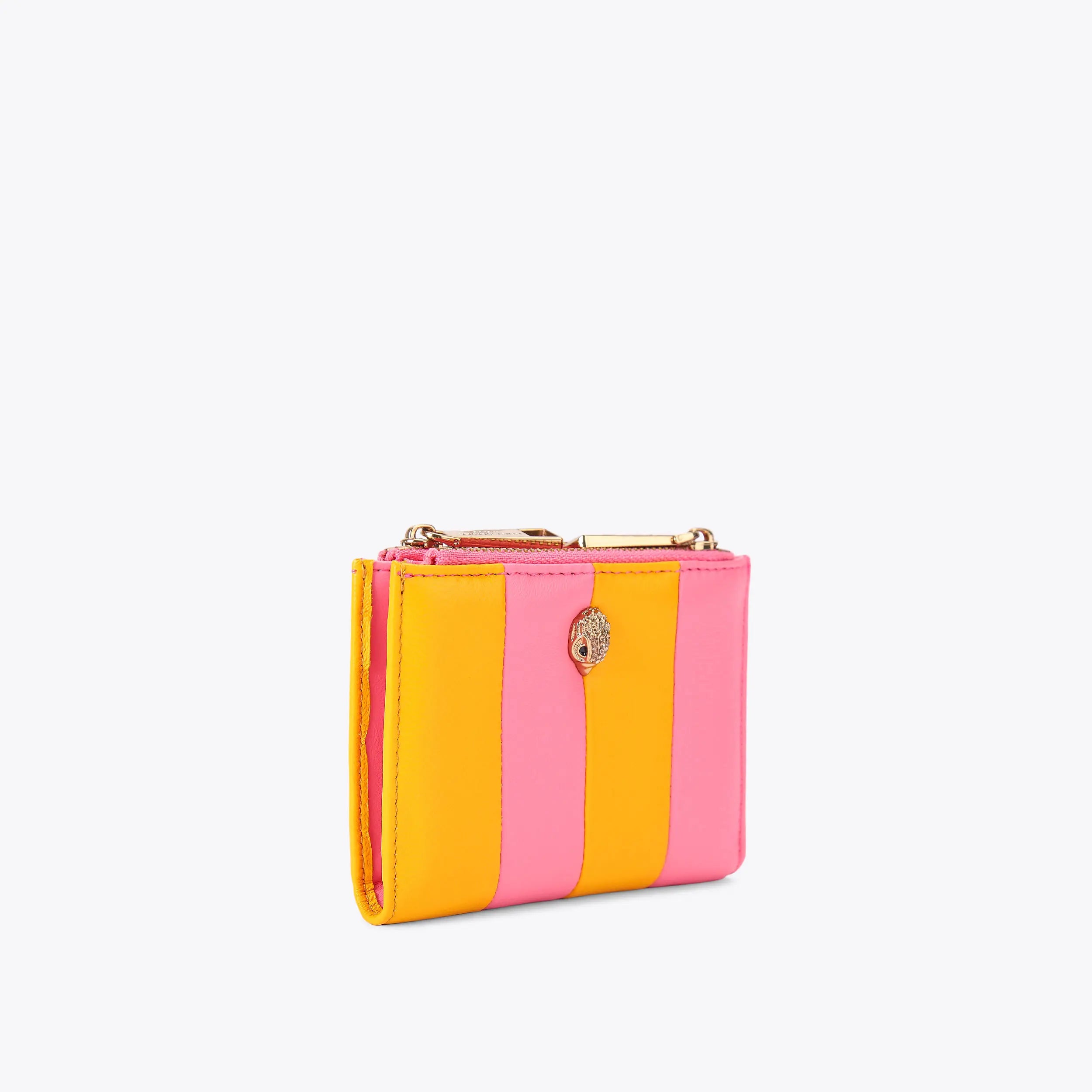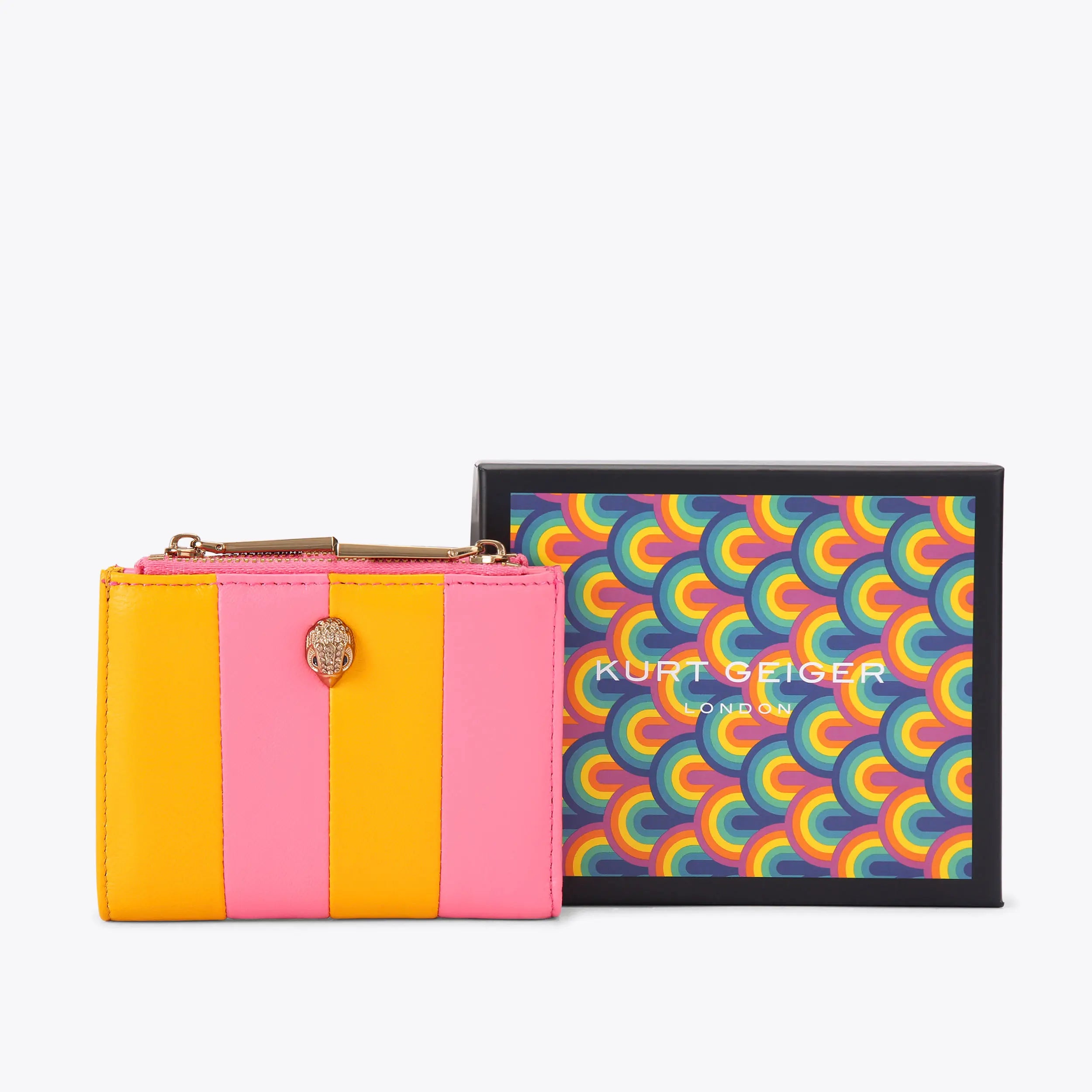 The Mini Purse features an orange and pink leather striped exterior. The front features a crystal embellished gold eagle head.