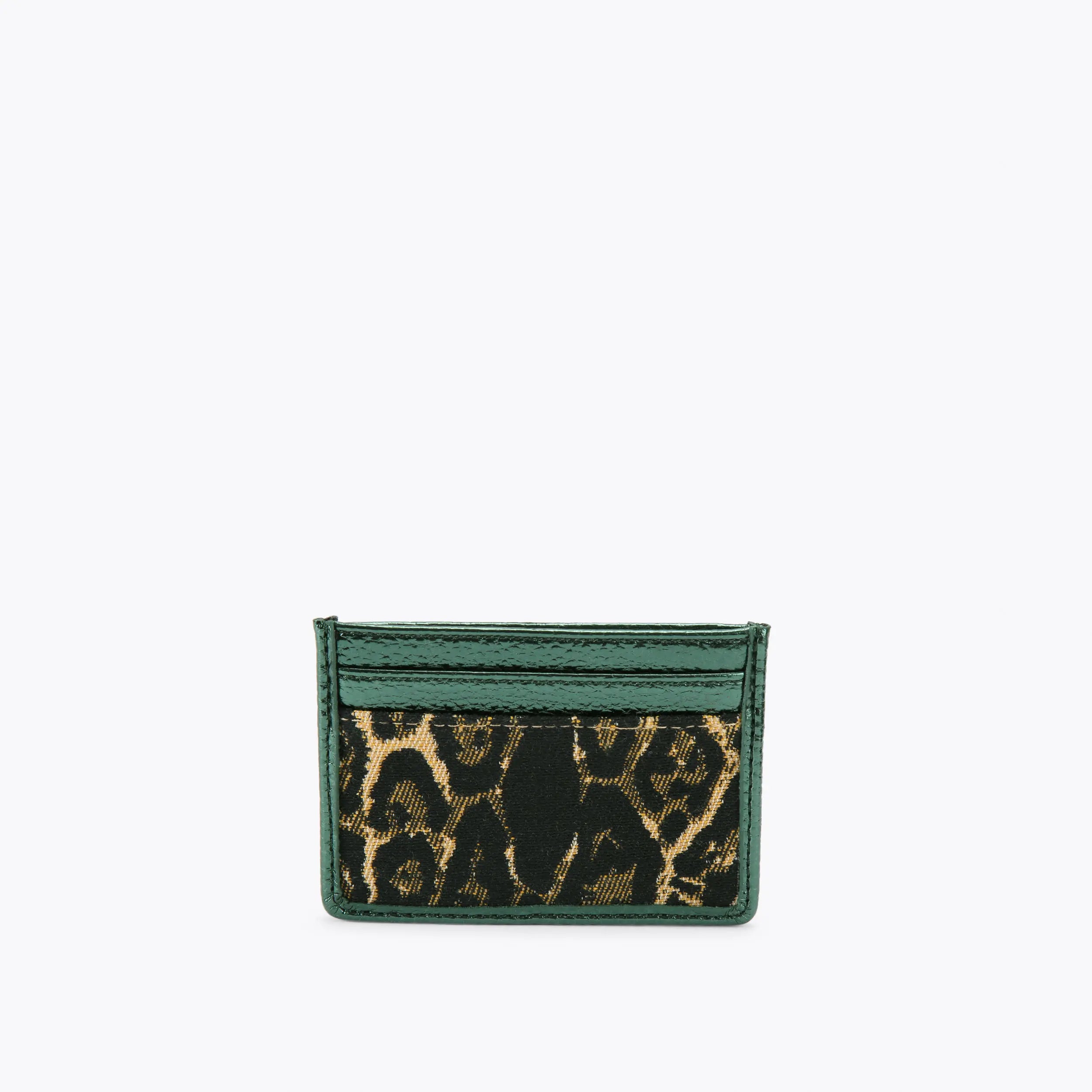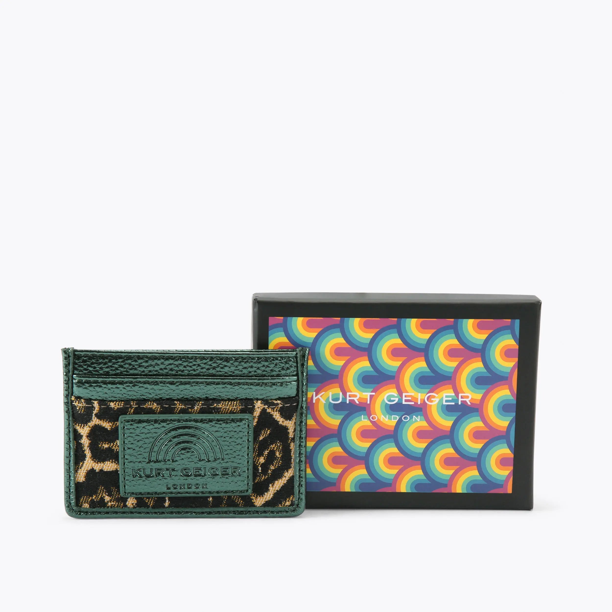 This Southbank Card Holder is crafted from a leopard print fabric with metallic rainbow print. There is a metallic green embossed patch on the front.