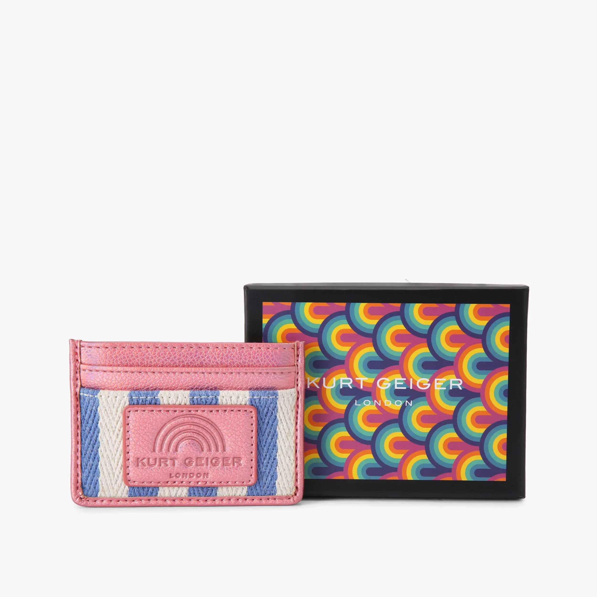 This Southbank Card Holder is crafted from a blue striped canvas with baby pink trims. There is a rainbow branded patch on the front.
