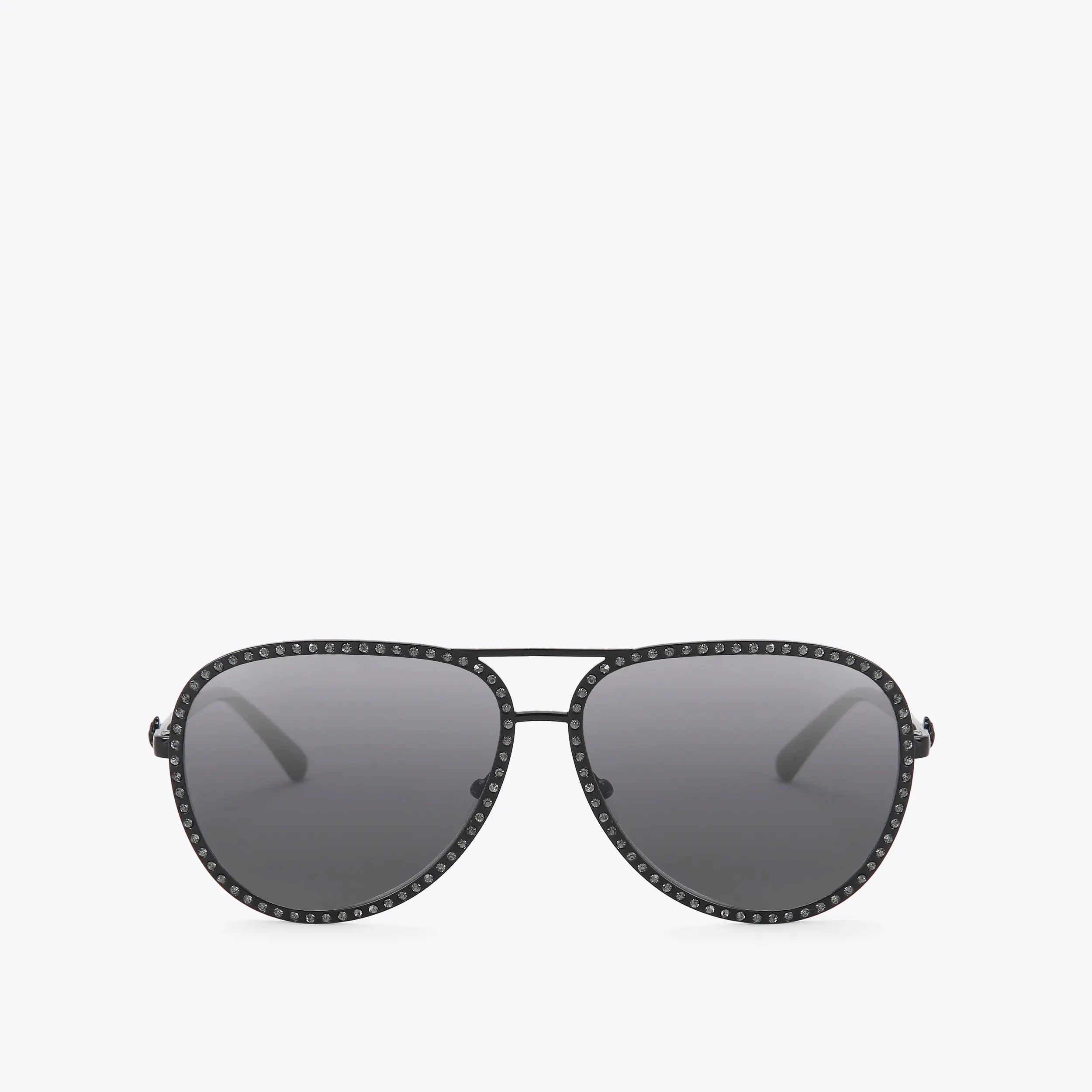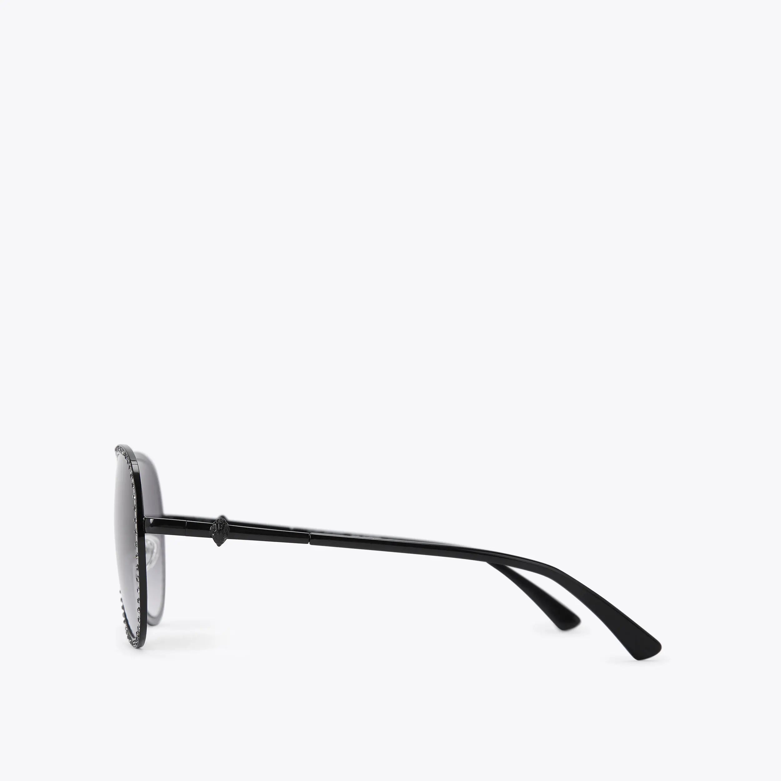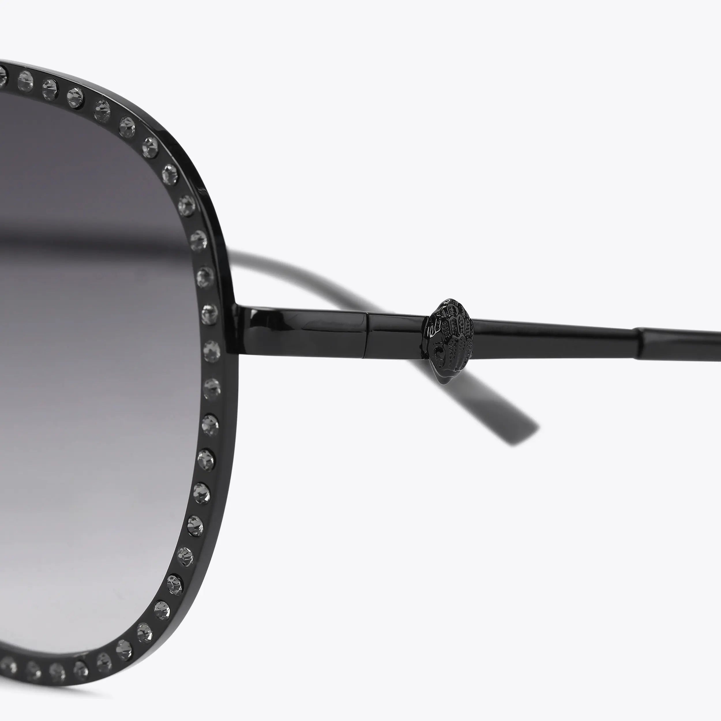 This pair of Large Shoreditch Aviator sunglasses feature black frames embellished with crystals. The lenses are grey and the temple tips are black. The arms each feature a gunmetal micro eagle head.