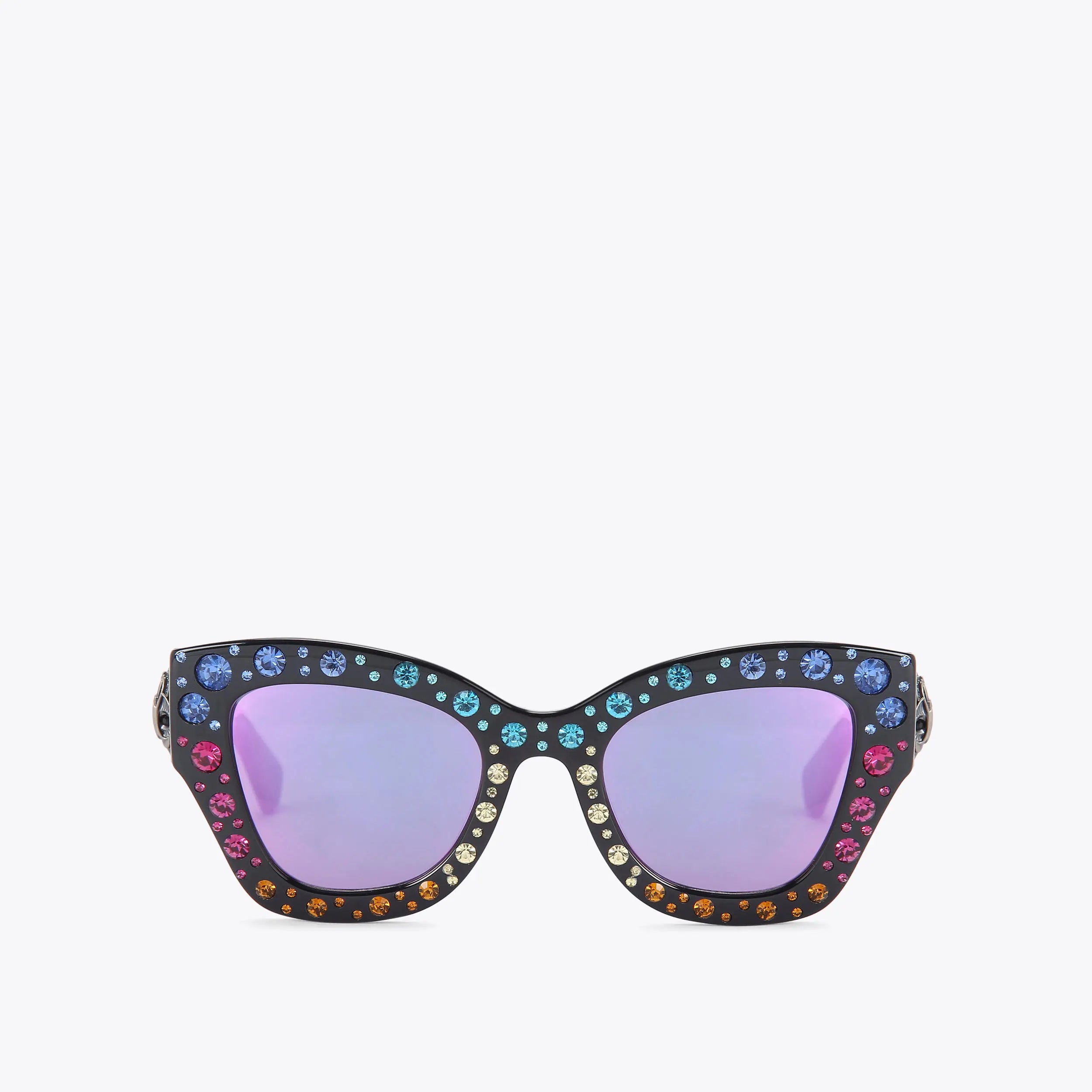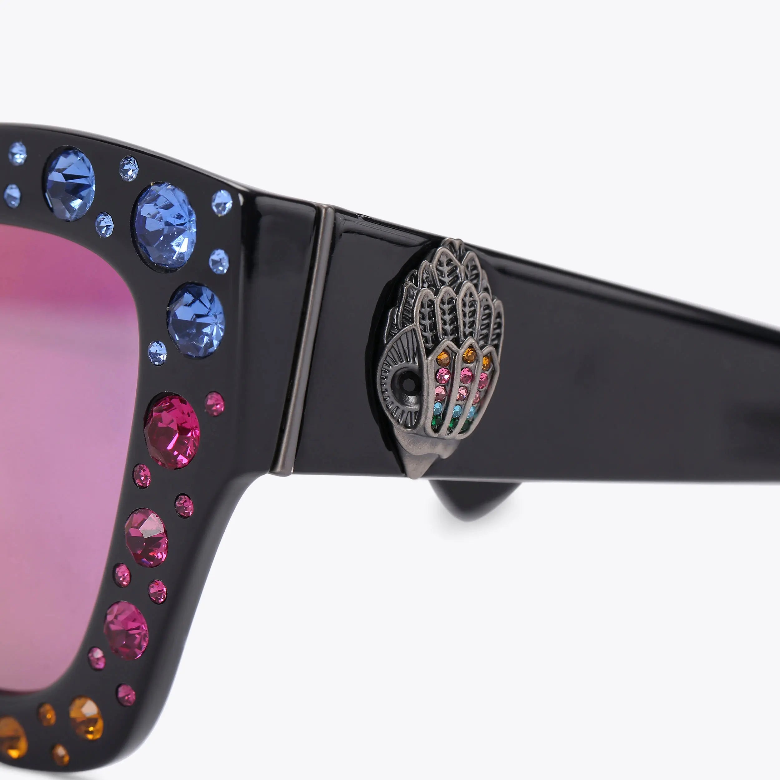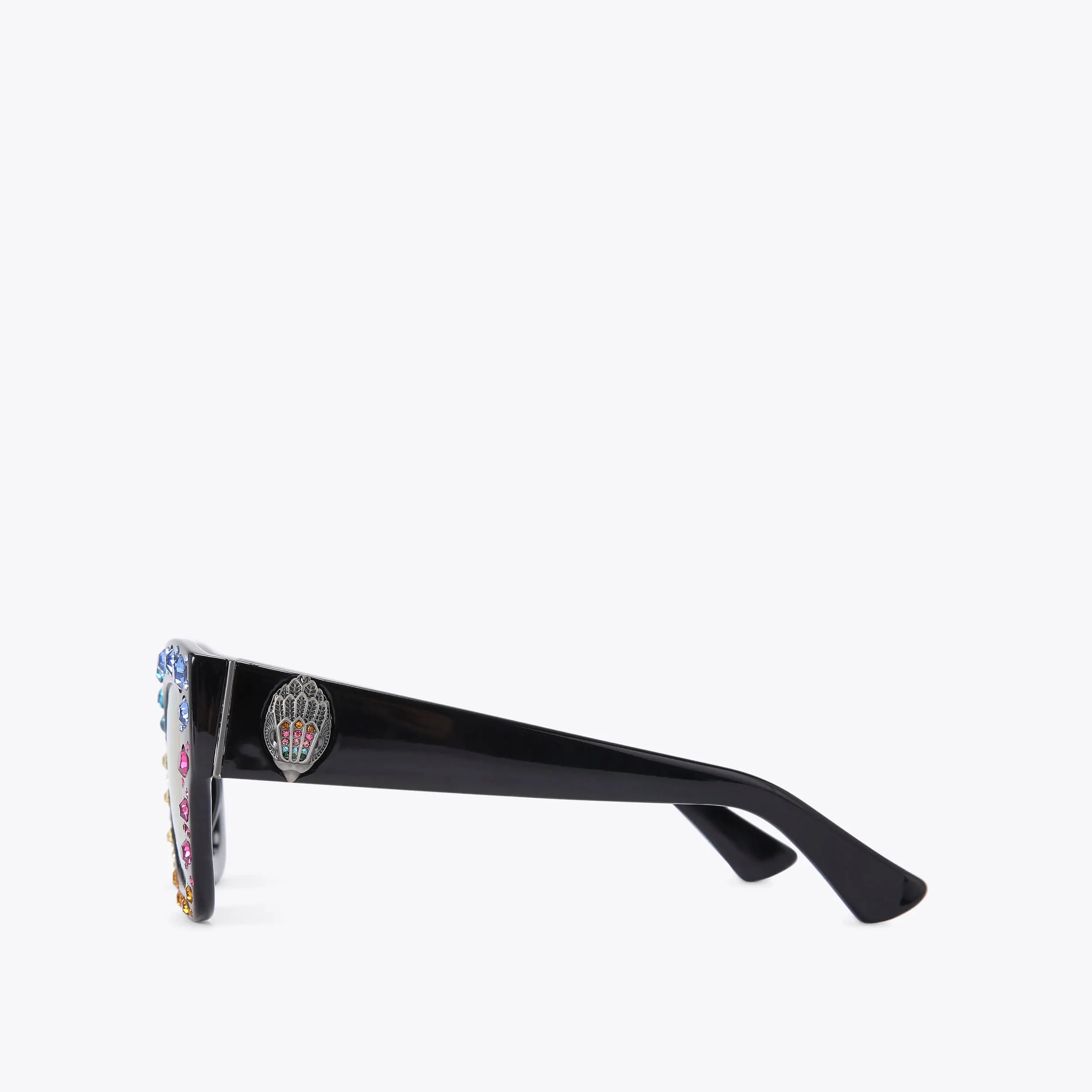 This pair of Shoreditch Gem Butterfly sunglasses feature black frames which are embellished with multi-colour crystals. Each arm is accented with an antiqued silver eagle head.