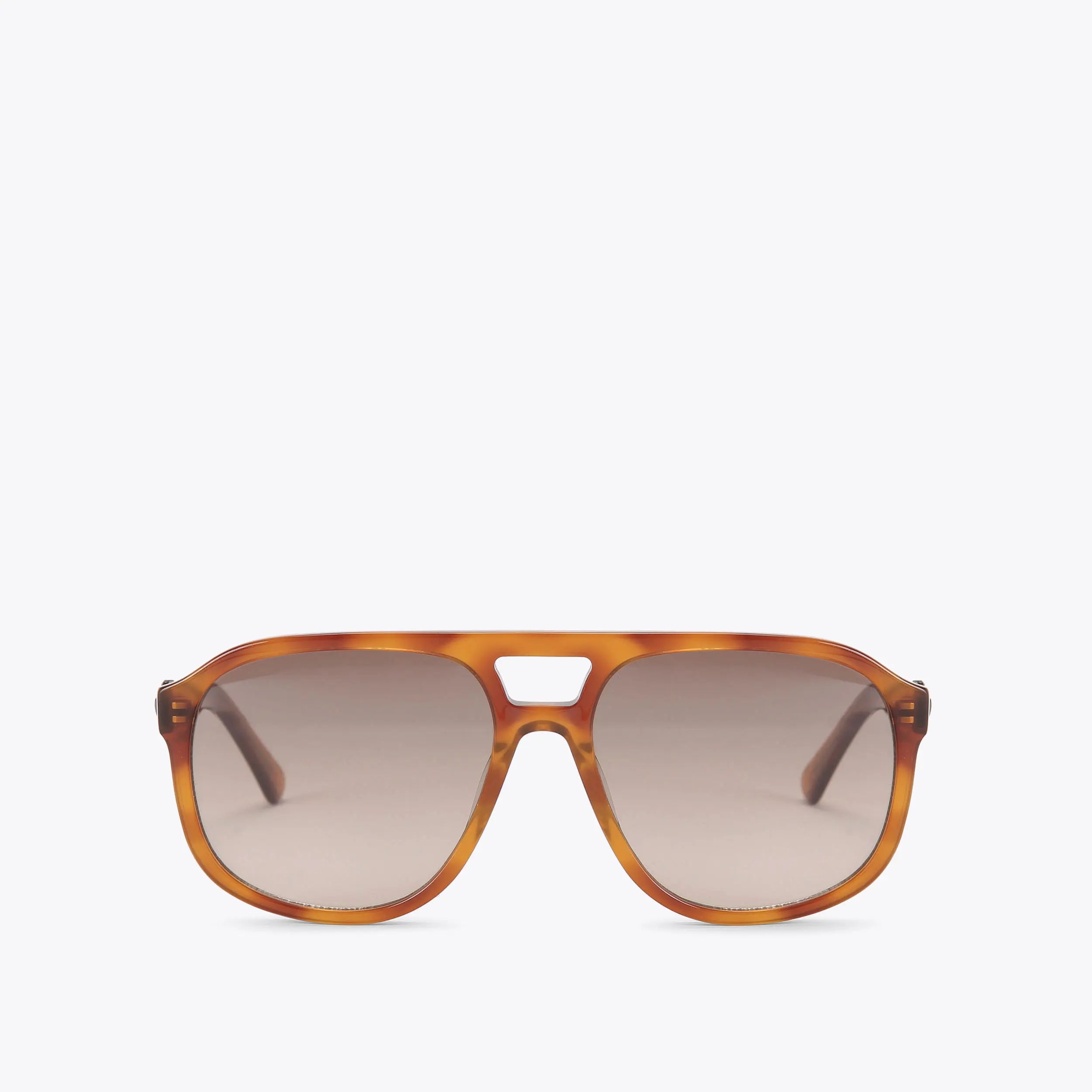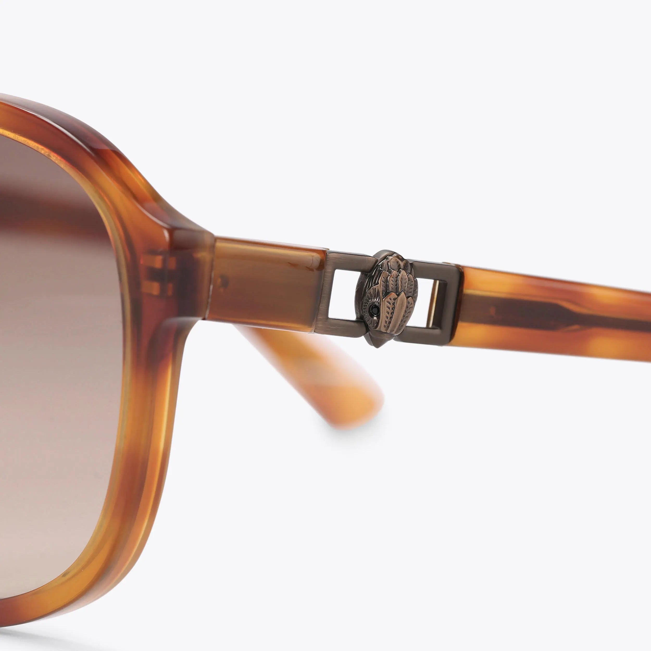 The Regent Aviator sunglasses feature a brown tortoiseshell frame with brown tinted lenses. Each arm is accented with a brushed bronze micro eagle head.